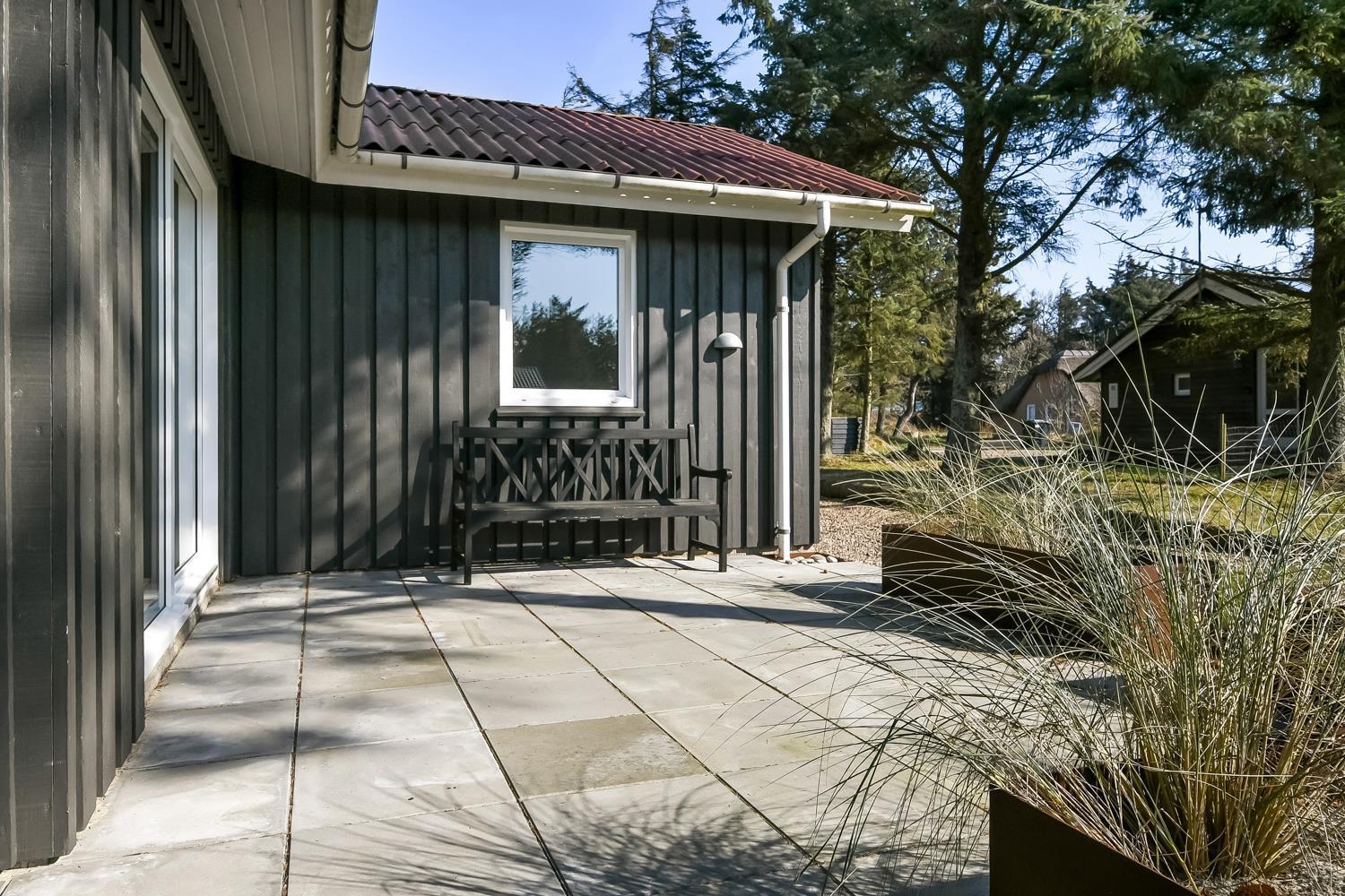 Huset ligger på en ca. 1.200m2 dejlig skovgrund med mange solkroge. Terasseanlægget byder på gode havemøbler, liggestole, hynder, parasol og grill. Tæt ved terrassen er der opstillet en ny gynge, så det er muligt at holde øje med de små direkte fra terrassen, som også er perfekt til den hyggelige grillaften. Den velholdte naturgrund er omkranset af høje træer som giver dejlig læ, så solen kan nydes både morgen og aften. Kun ca. 300m fra huset ligger det brusende Vesterhav som hver dag byder på nye maleriske oplevelse. I sæsonen kan du hente morgenbrød, købmandsvarer eller måske invitere familien ud at spise kun ca. 5 min på gåben fra huset. Så hvad enten du er til aktiv ferie eller total afslapning danner dette dejlige feriehus den perfekte ramme både hvad angår hus, beliggenhed og omgivelser.
