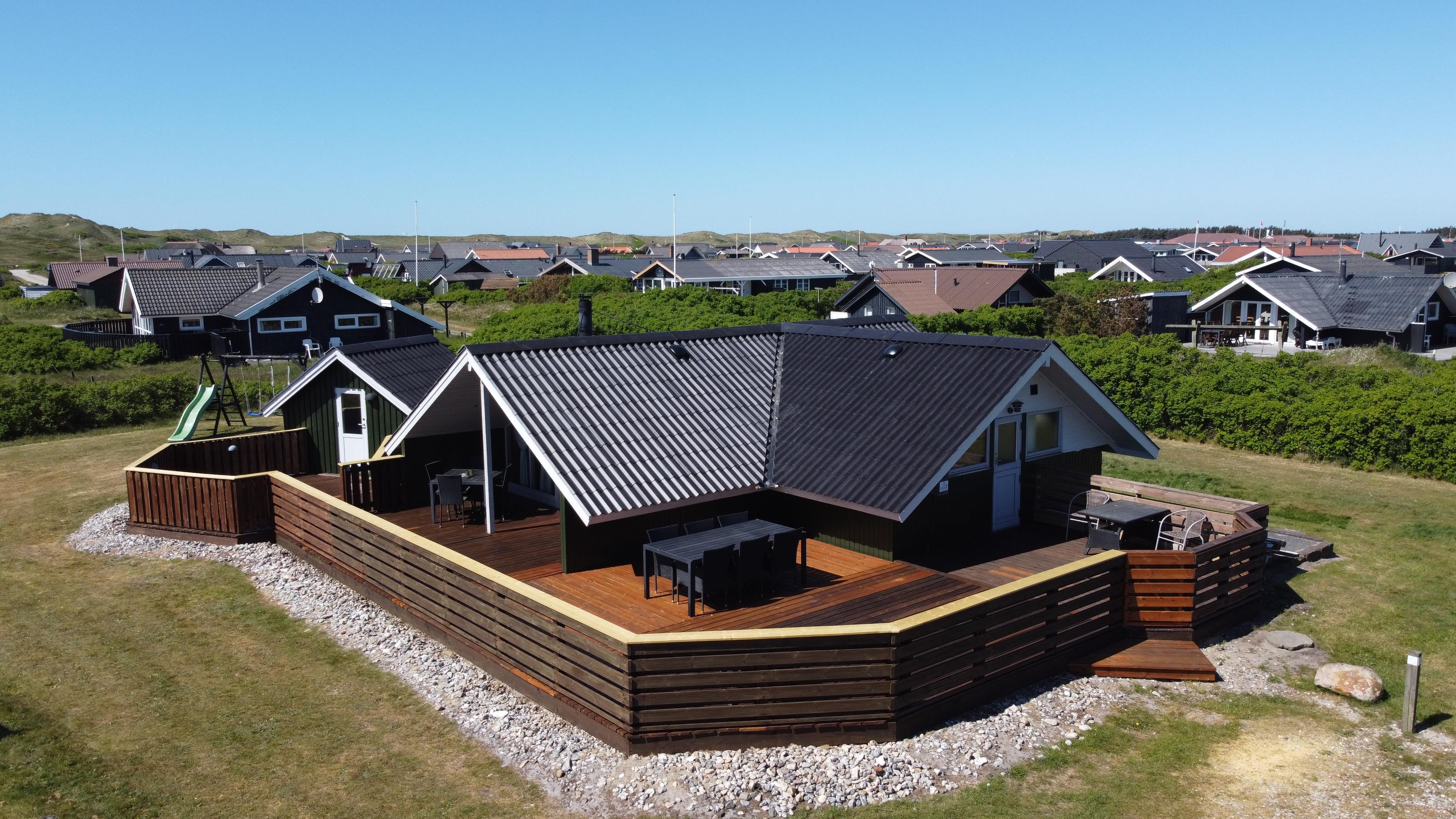 Renoveret, hyggeligt indrettet feriehus i træ med stor, lukket og delvis overdækket terrasse. Beliggende på naturgrund kun 400 meter fra Vesterhavet. Terrassen er indhegnet og dermed egnet til at man kan have sin hund gående løs rundt. Her er desuden gratis trådløs internetadgang (fiberforbindelse). Fra huset er der udsigt over området og huset er ideelt til parret eller den lille familie.
