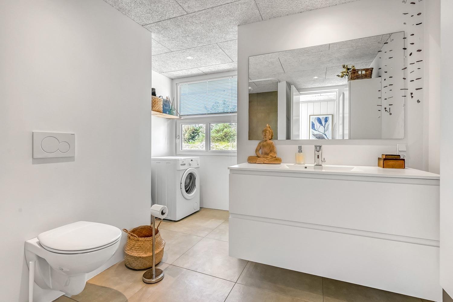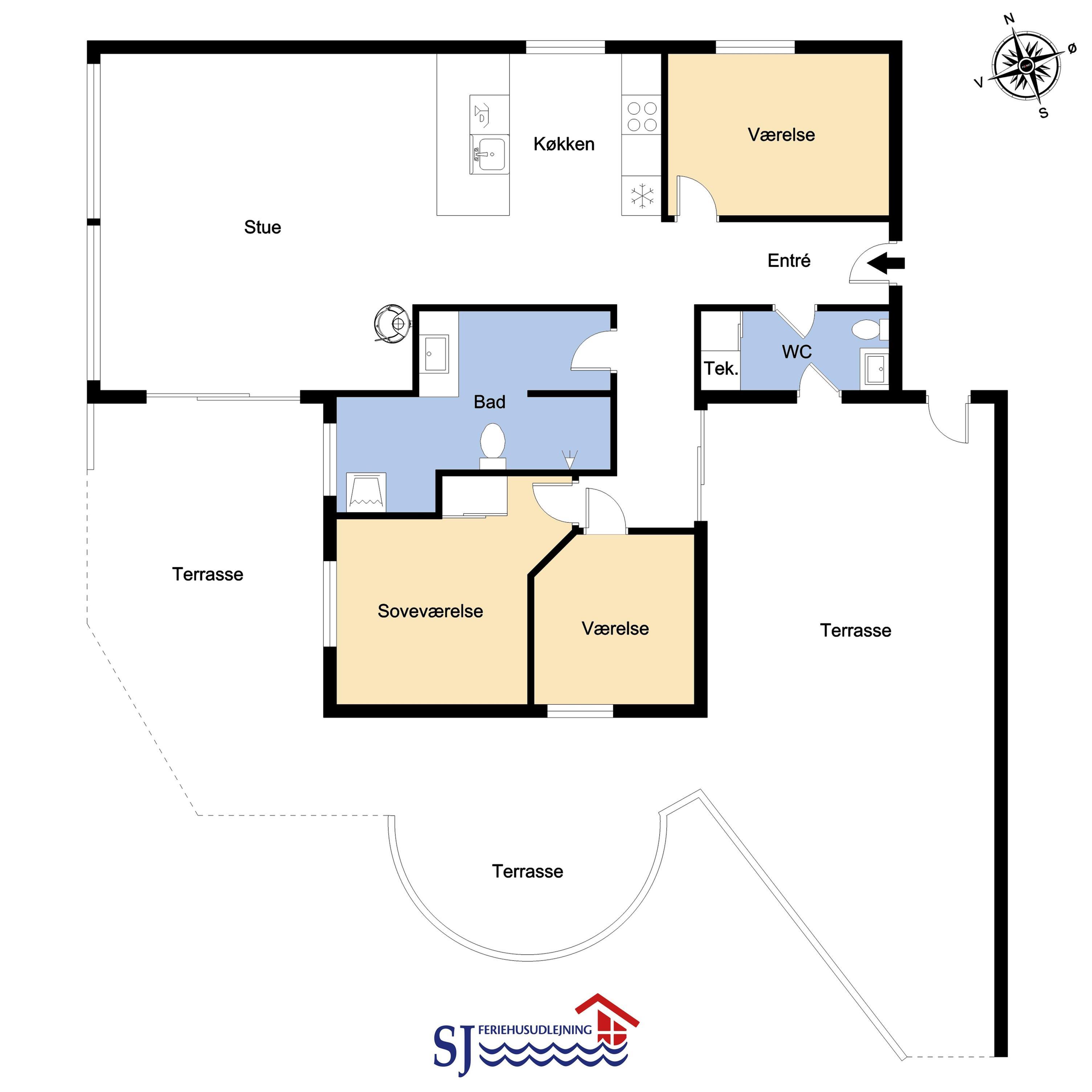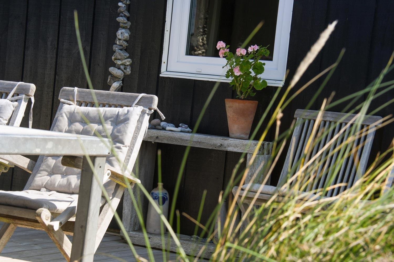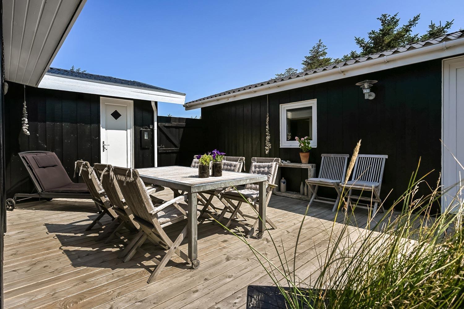 Huset ligger på en stor, dejlig naturgrund. Fra fordelergangen er der udgang til et helt fantastisk, lukket overdækket terrasseanlæg (60 m2) med havemøbler, liggestole, hynder, parasol og grill. Et terrasseanlæg hvor der altid er læ, selv på blæsende dage. Nyd en grillaften i al slags vejr eller nyd solen og beliggenheden på en dejlig naturgrund, som bekræfter de mange muligheder. I Vejlby Klit og omegn er der rigtig gode muligheder for at cykle, vandre eller løbe en tur og kun ca. 200m fra huset ligger det brusende Vesterhav som hver dag byder på nye maleriske oplevelse. Ca 400 m fra huset ligger Ferring Sø hvor man kan Kite surfe. I sæsonen kan du hente morgenbrød, købmandsvarer eller måske invitere familien ud at spise, kun ca. 10 min fra huset. Dette helt specielle og meget charmerende feriehus byder på en ferieoplevelse i særklasse uanset årstid.