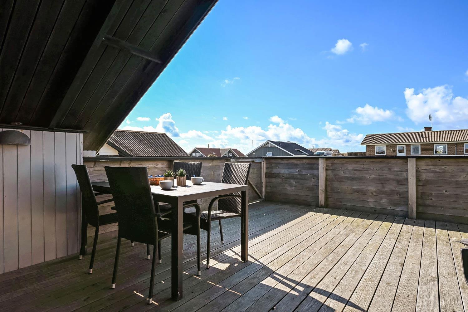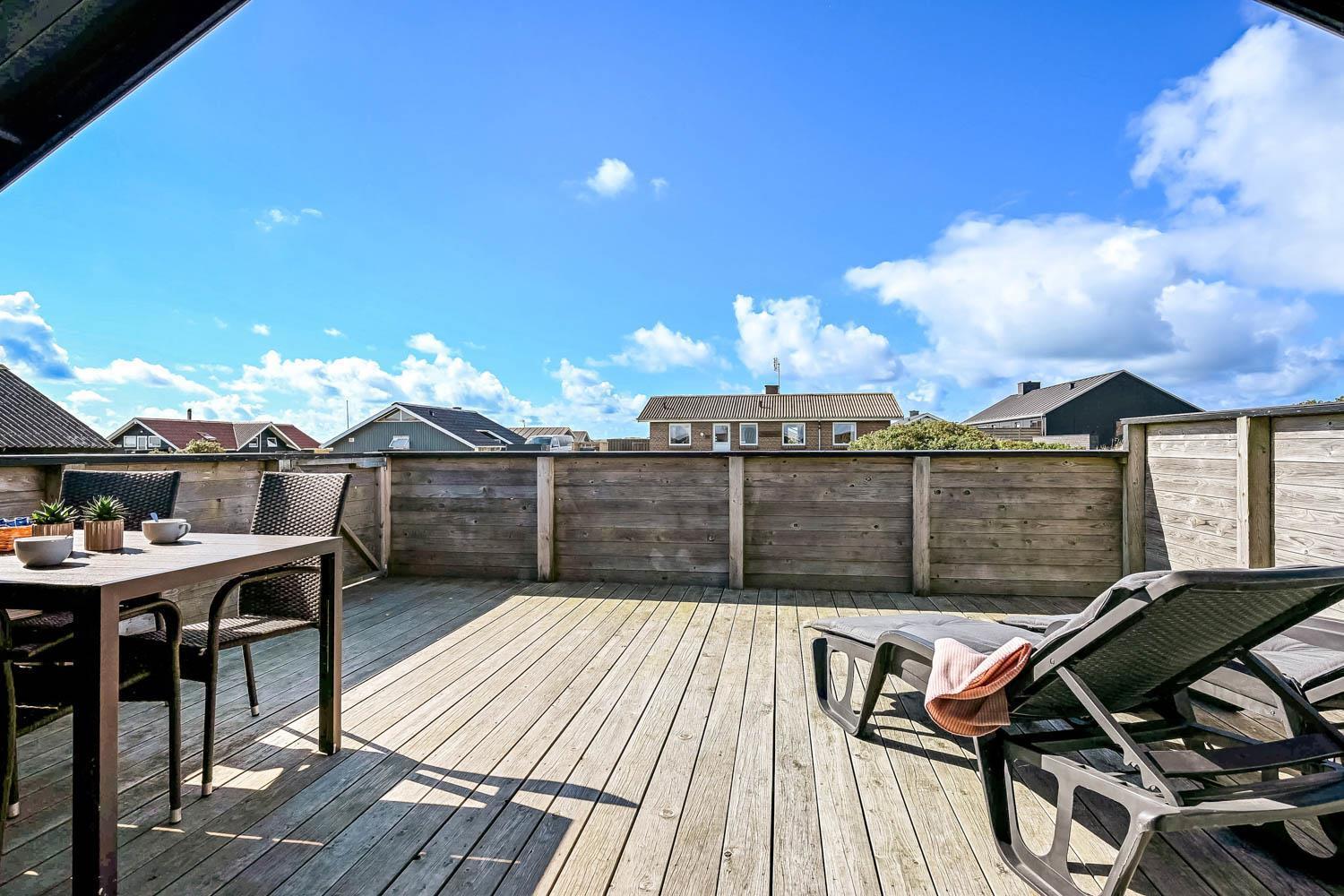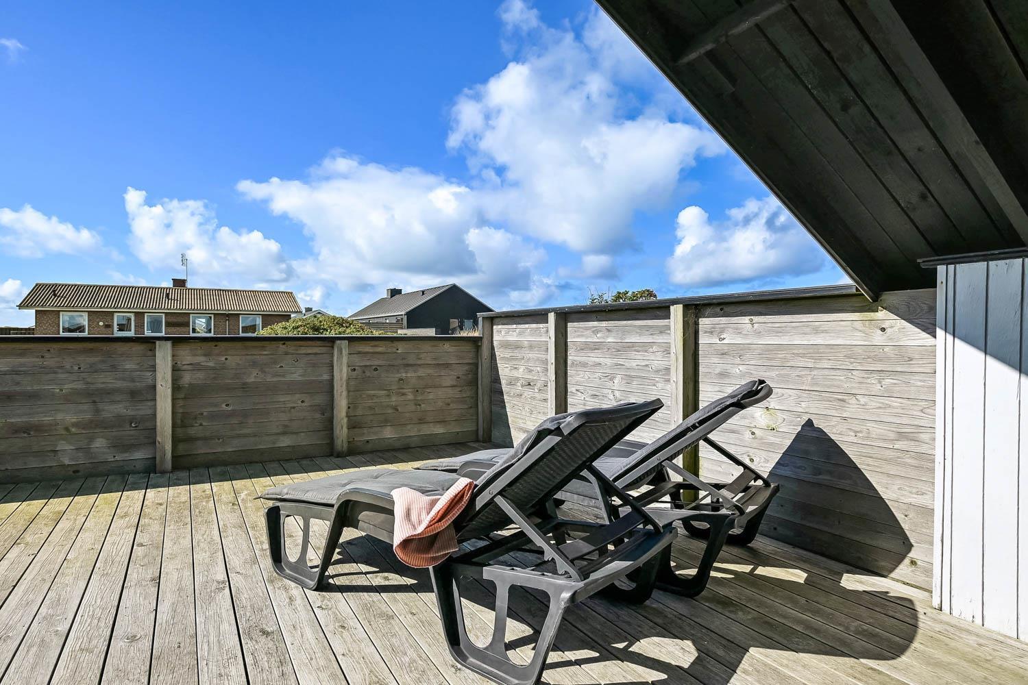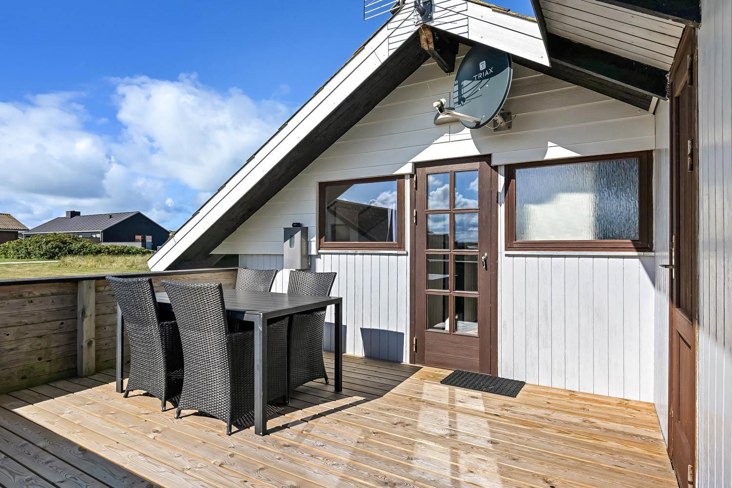 Udgang fra opholdsstuen til den 28 m2 store syd terrasse , hvoraf 8 m2 er overdækket. Terrassen er udstyret med grill, diverse havemøbler, solvogne og dertil hørende hynder. Sid på terrassen og nyd udsigten når solen går ned bag de høje klitter. Fra gangen er der udgang til den 15 m 2 store øst terrasse, som også er udstyret med havemøbler og hynder. Her kan man nyde morgen kaffen, imens man nyder solopgangen. Gode surf og fiskemuligheder i nærheden. Der forefindes også 2 legepladser i Vejlby Klit. Købmand og Cafe i Vejlby Klit som ligger ca. 400 m fra huset af, som har åbent fra Påske til efteråret.