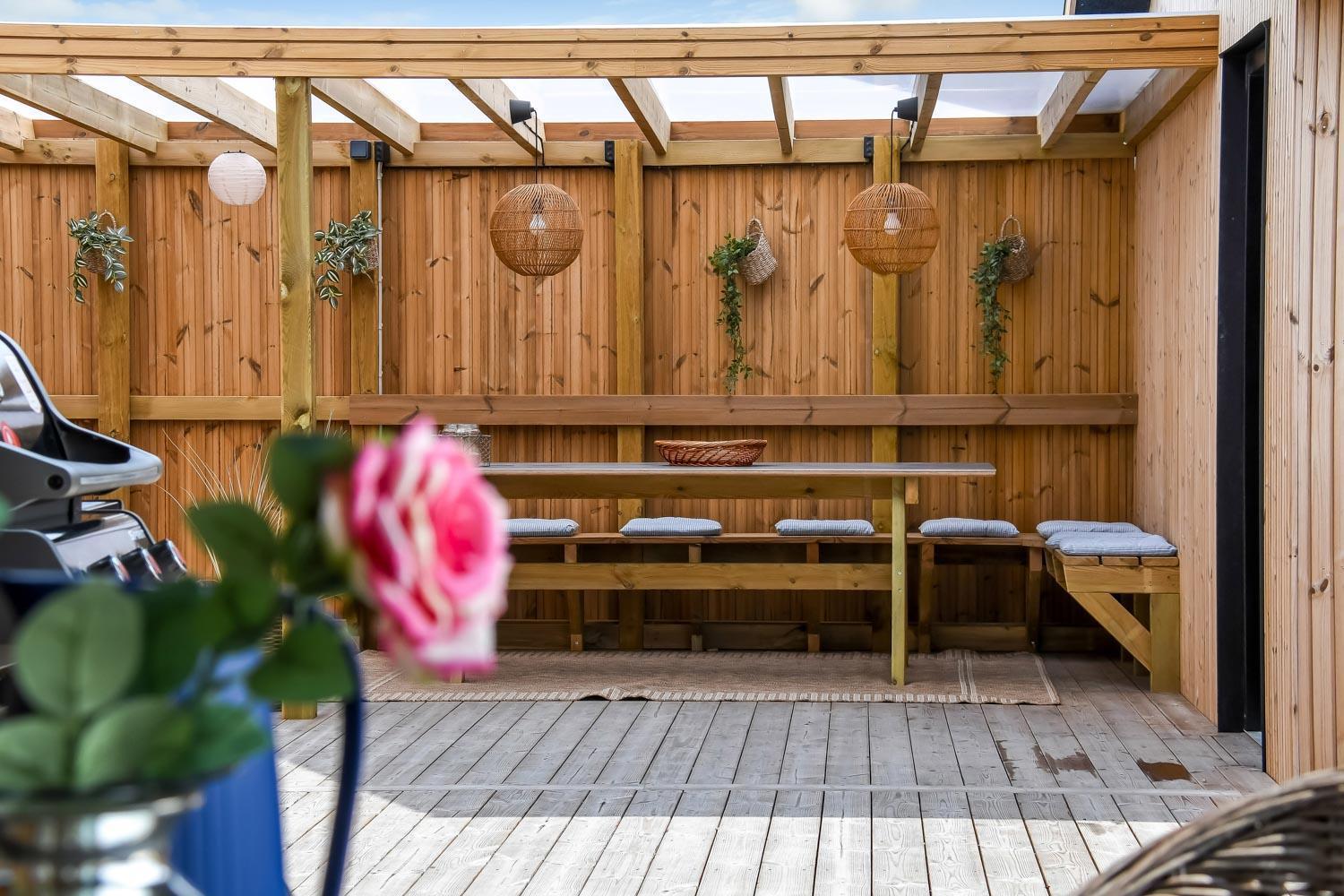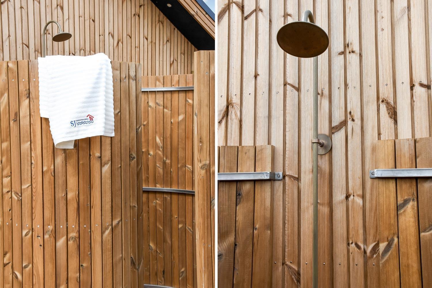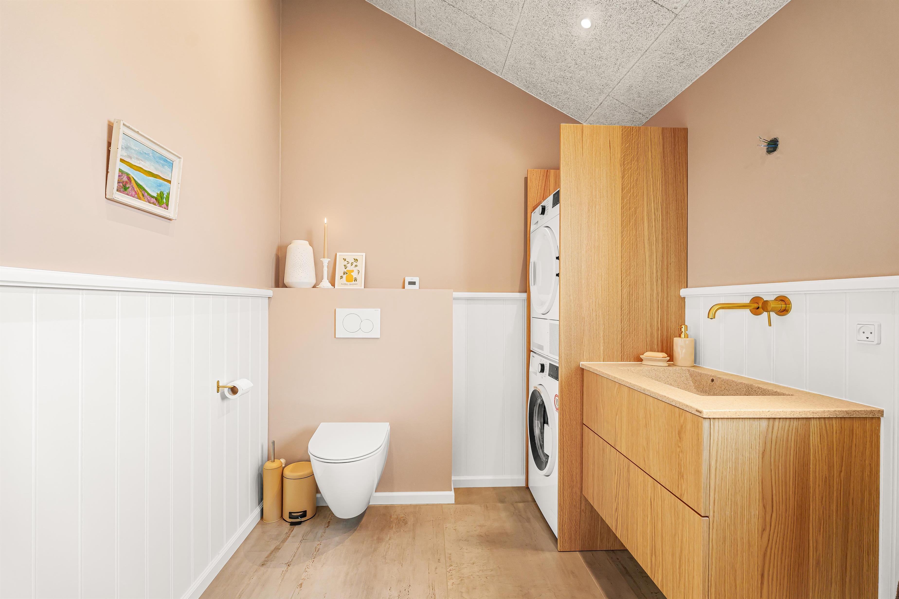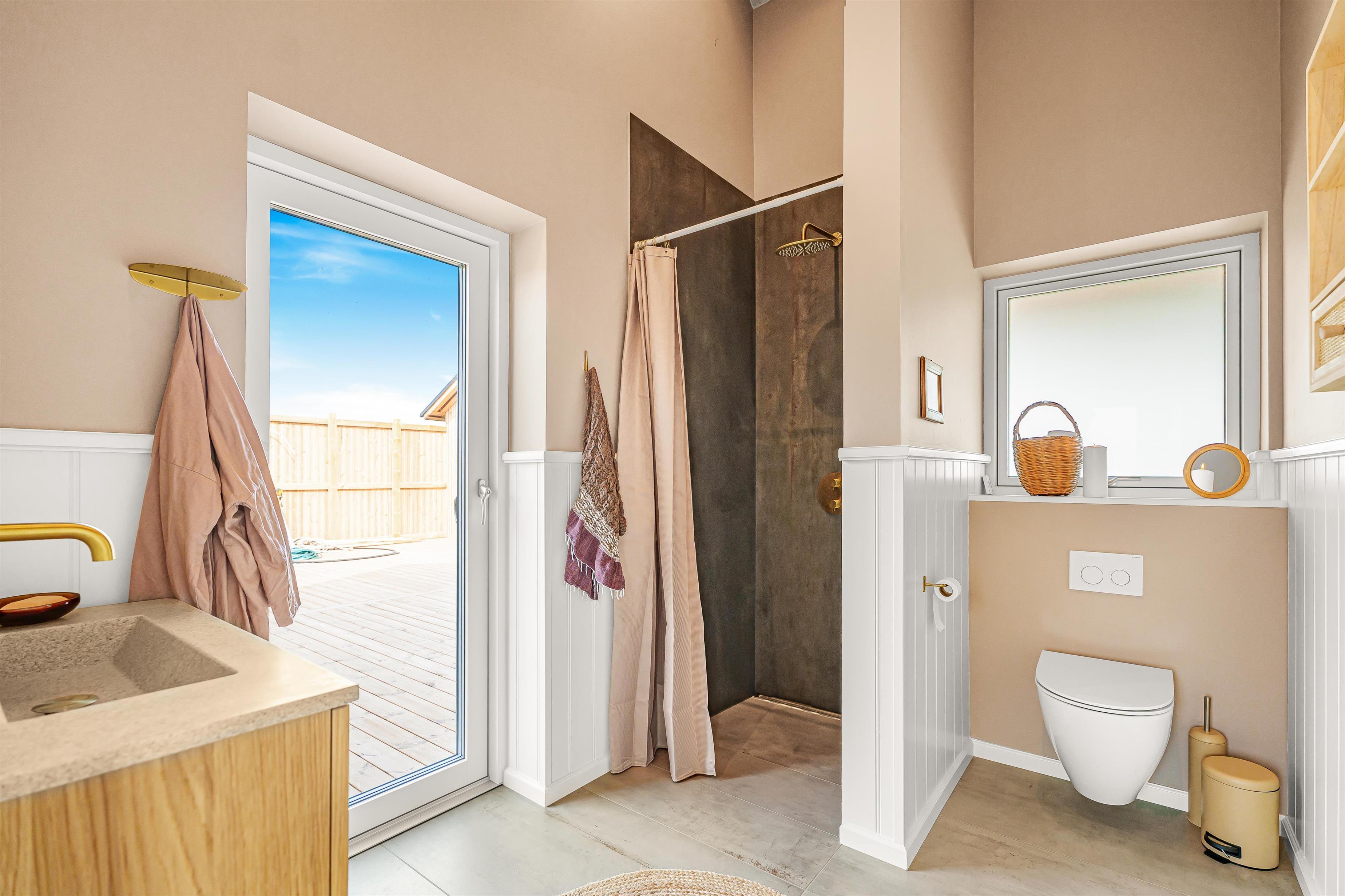 Der er udgang til det store og unikke terrasse anlæg, hvor der også er en udendørs spa og 2 udendørs brusere med koldt og varmt vand. 2 badeværelser begge med toilet, håndvask og bruser samt klinkegulv med gulvvarme, det ene er vaskemaskine og tørretumbler. Fra det ene badeværelse er der desuden udgang til terrassen og en af bruserne, så man kan gå i bruser, hvis man har været en tur i Vesterhavet og derefter gå ind i huset gennem badeværelset. Huset lejes ikke ud til ungdomsgrupper. Har man el-bil eller en Plug-in hybrid, så er der opsat lade boks. Ikke ryger hus. Husdyr ikke tilladt. Obligatorisk slutrengøring