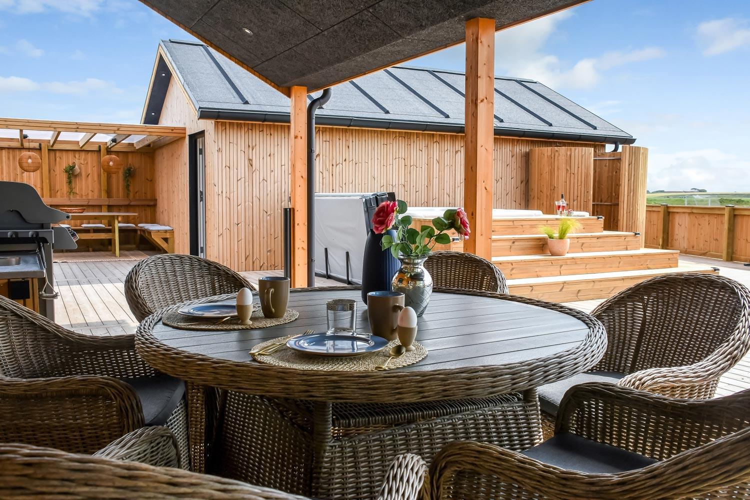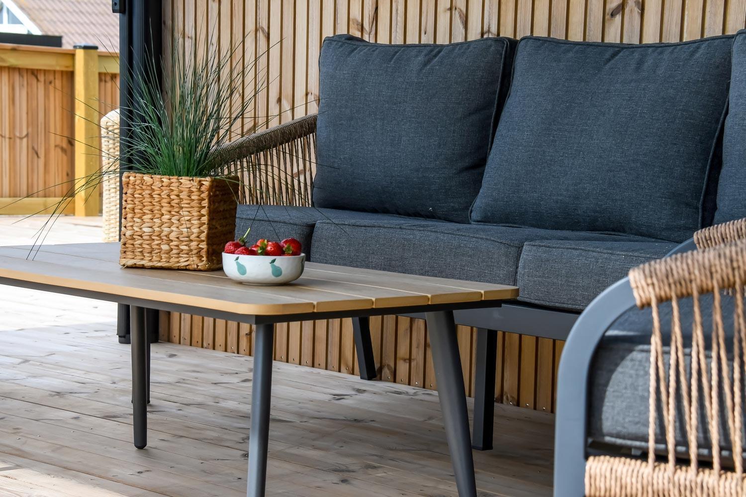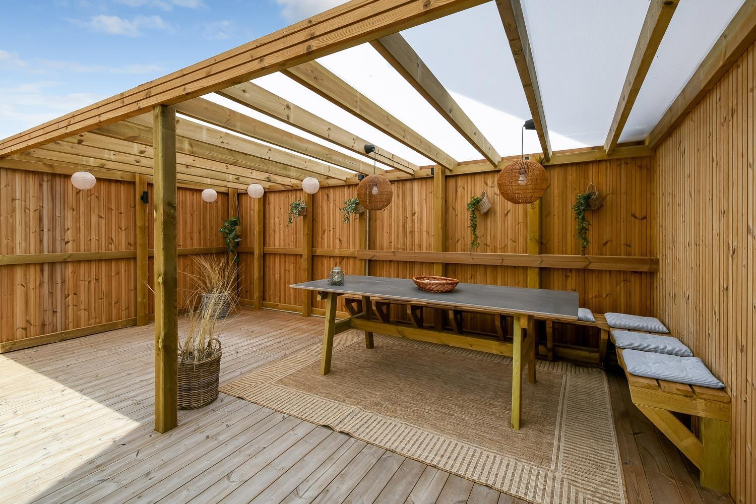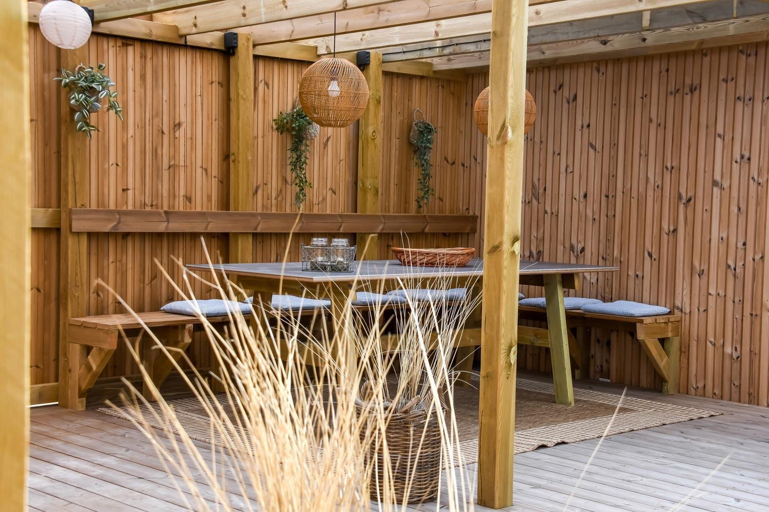 Udekøkkenet er udstyret med stor gasgrill og vask med koldt vand, så der er gode muligheder for at tilberede lækre måltider, mens man hygger sig med familie og venner. Her er rigeligt med havemøbler og liggestole.