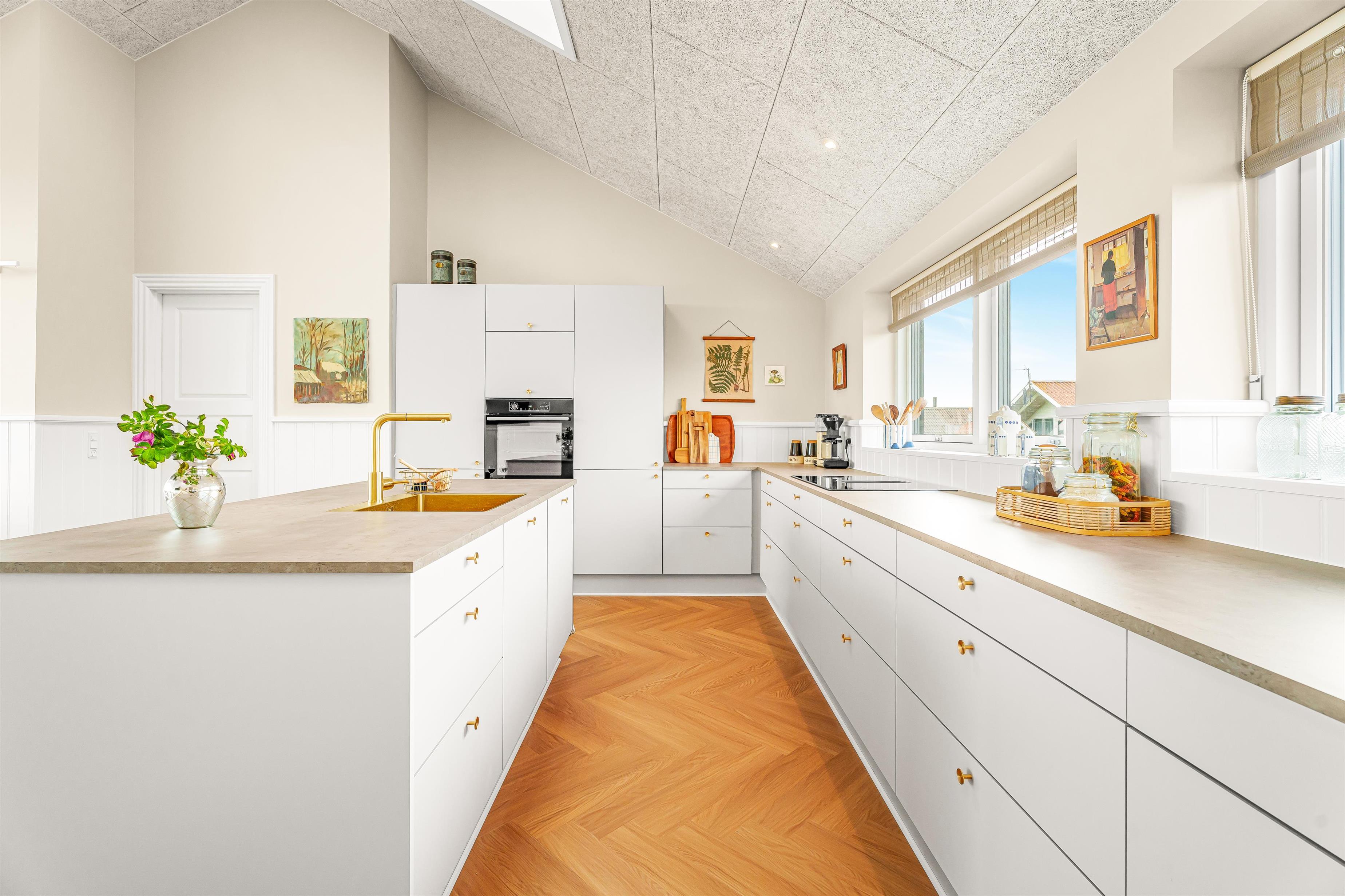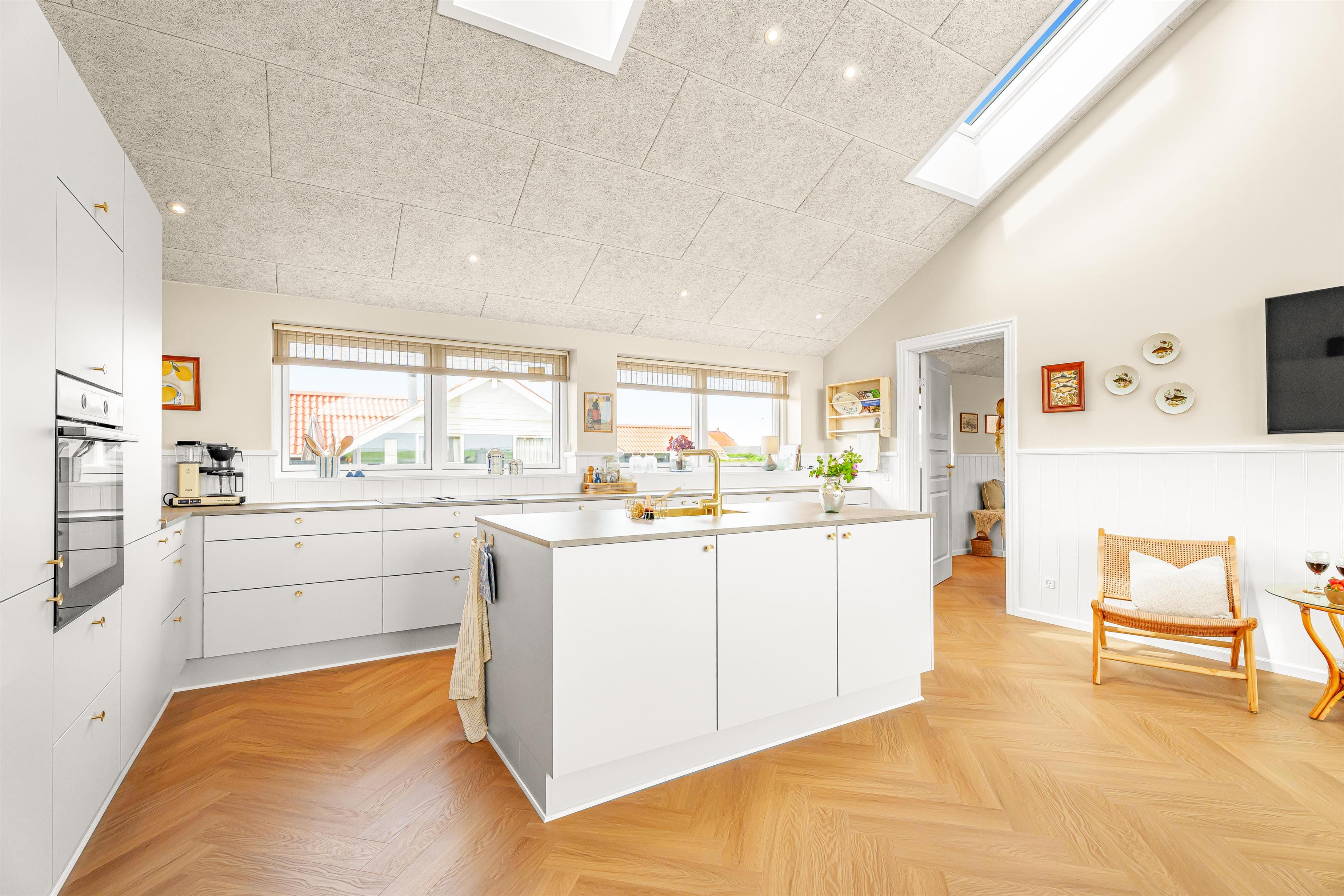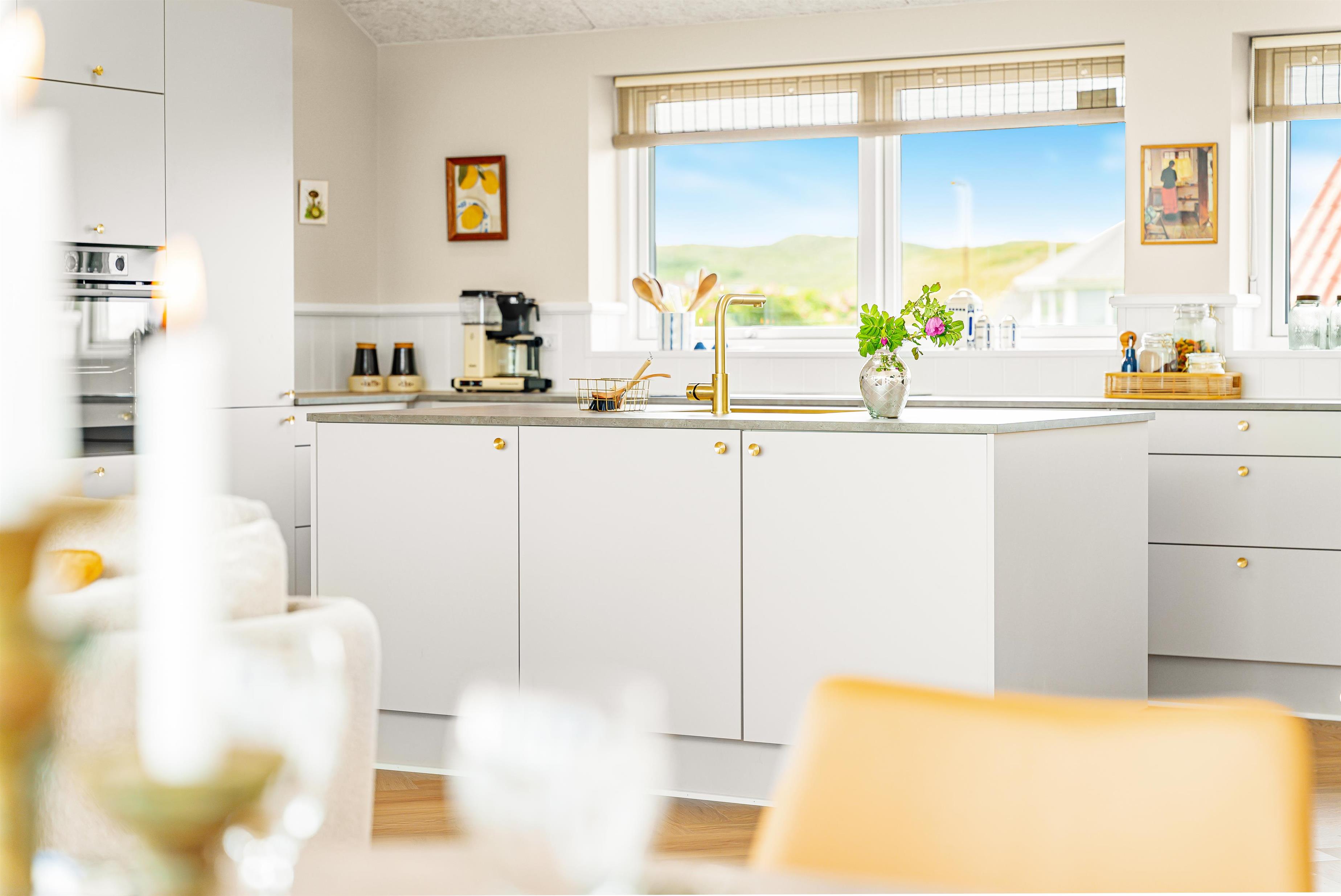 Det åbne køkken er bl.a. udstyret med induktionskogeplade med indbygget emhætte, indbygningsovn, opvaskemaskine, mikroovn samt køle-/fryseskab. Den tilberedte mad kan nydes ved spisebordet, som er placeret tæt ved køkkenet, mens man betages af udsigten til Ferring Sø og det omkringliggende område.