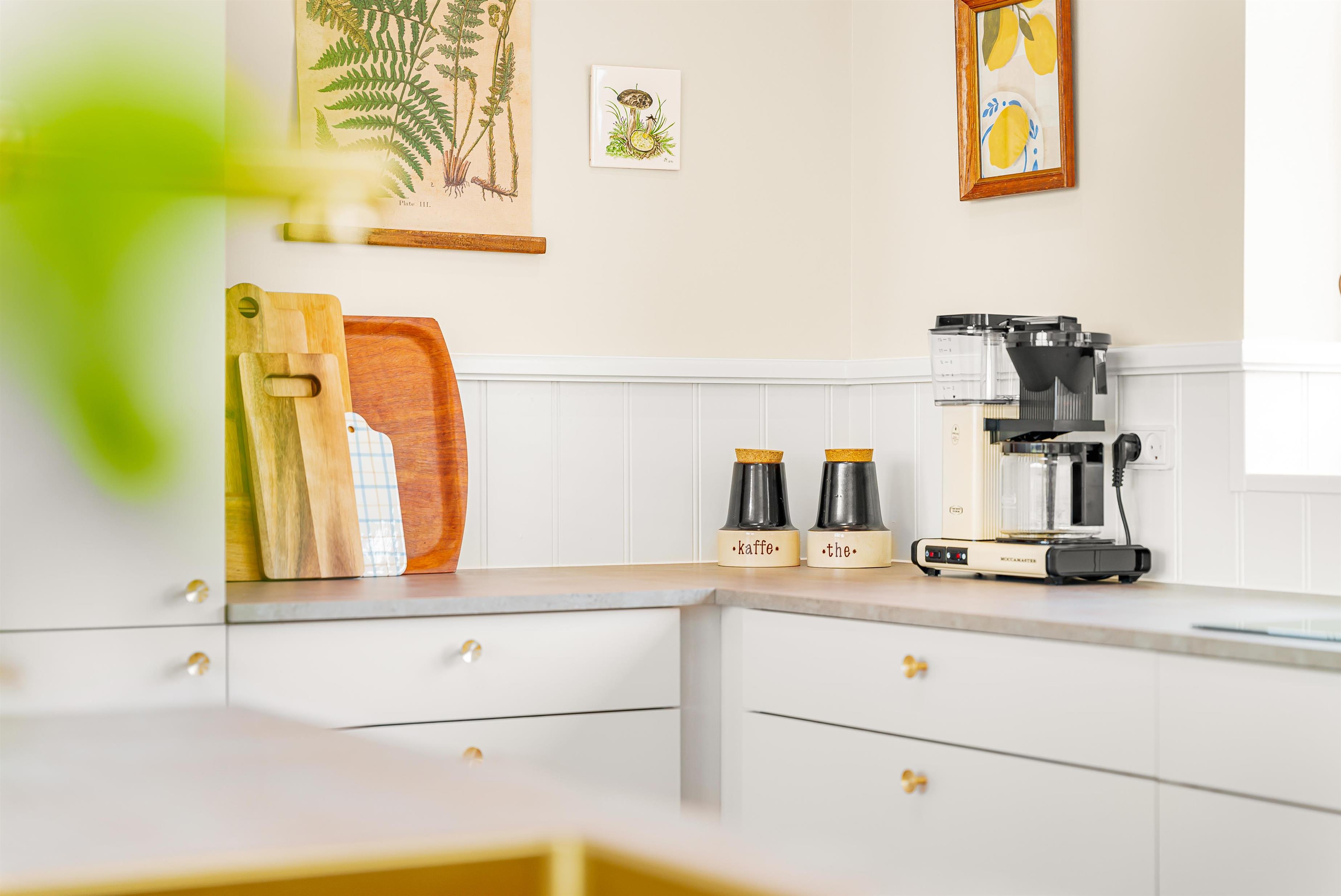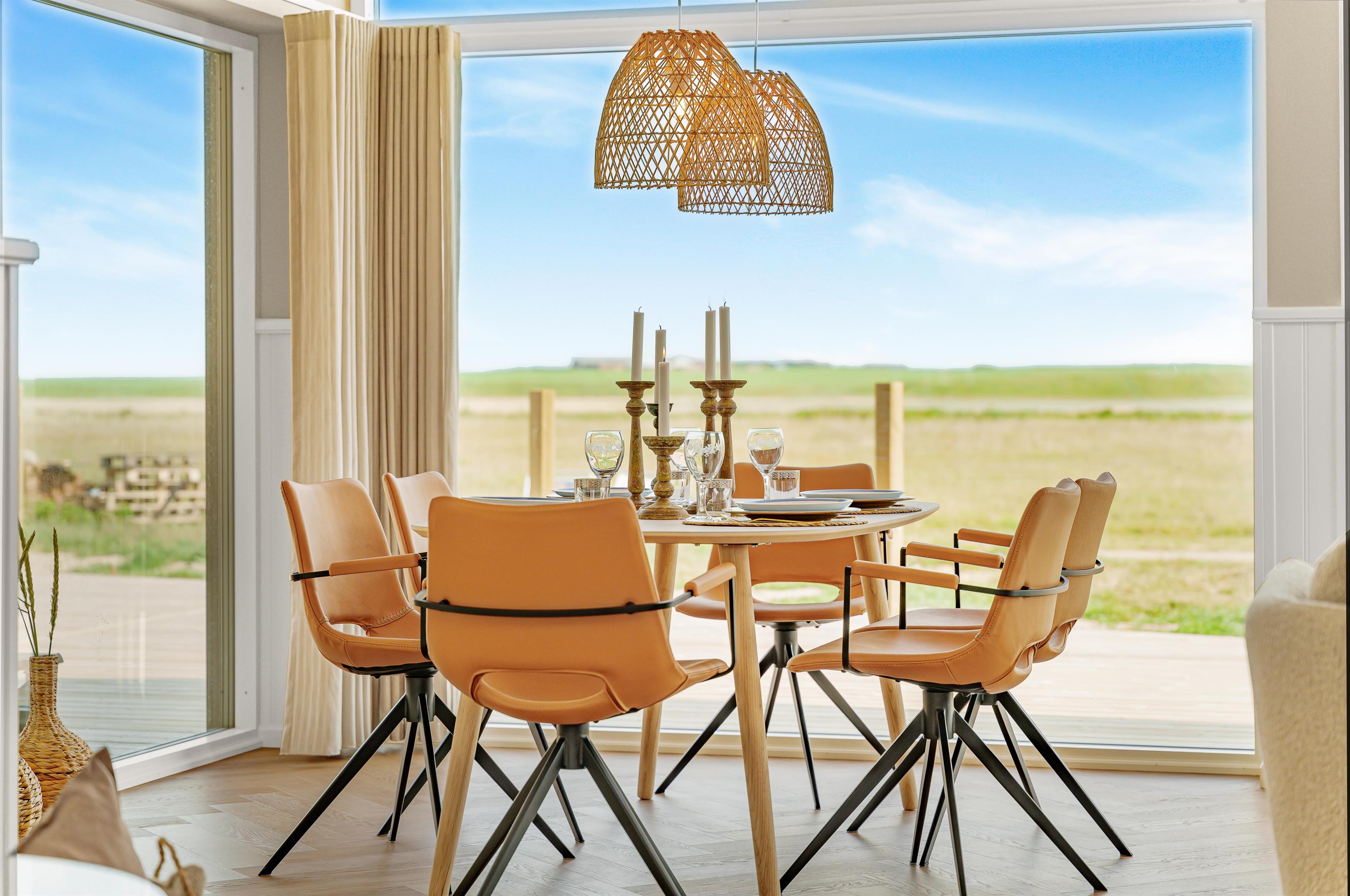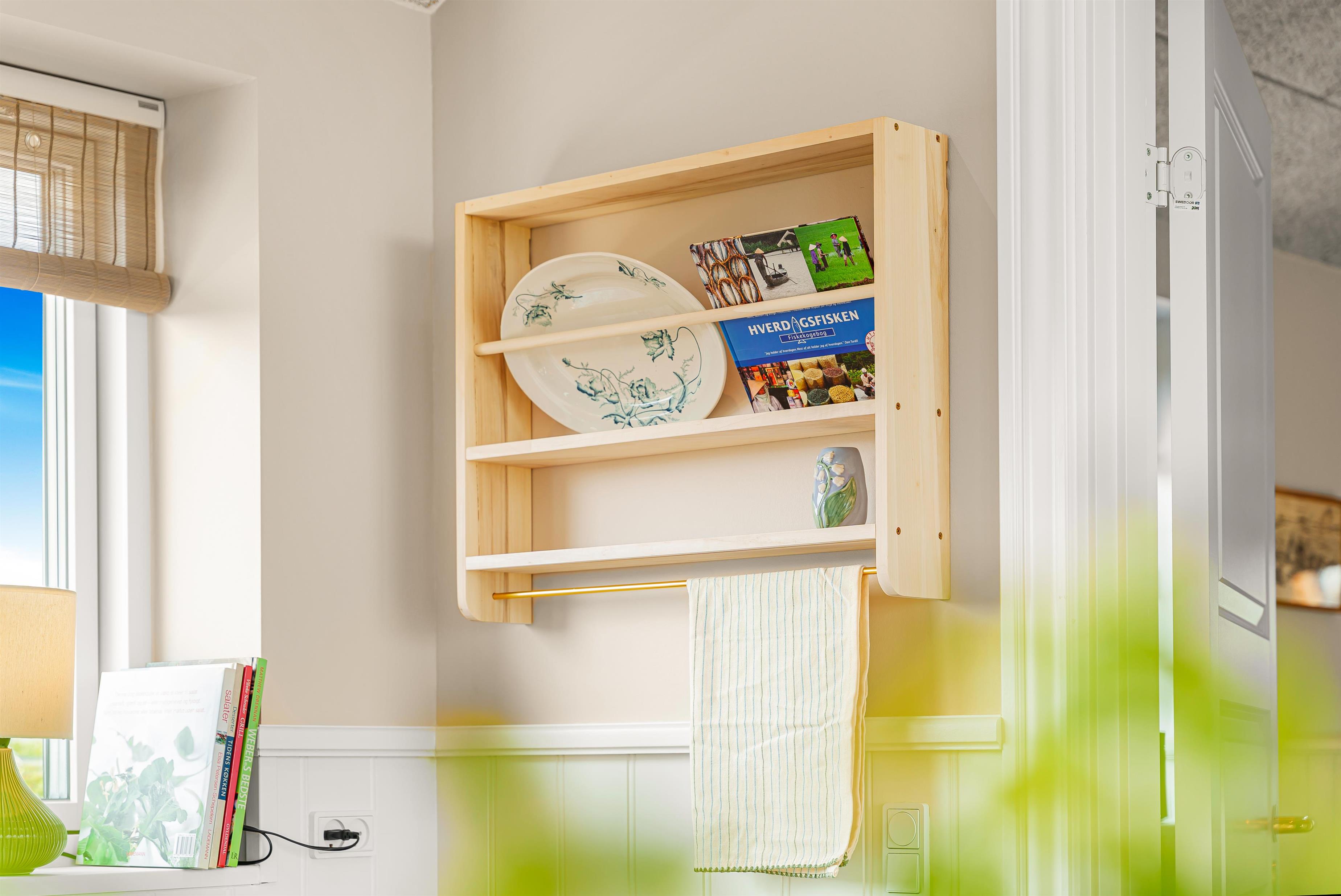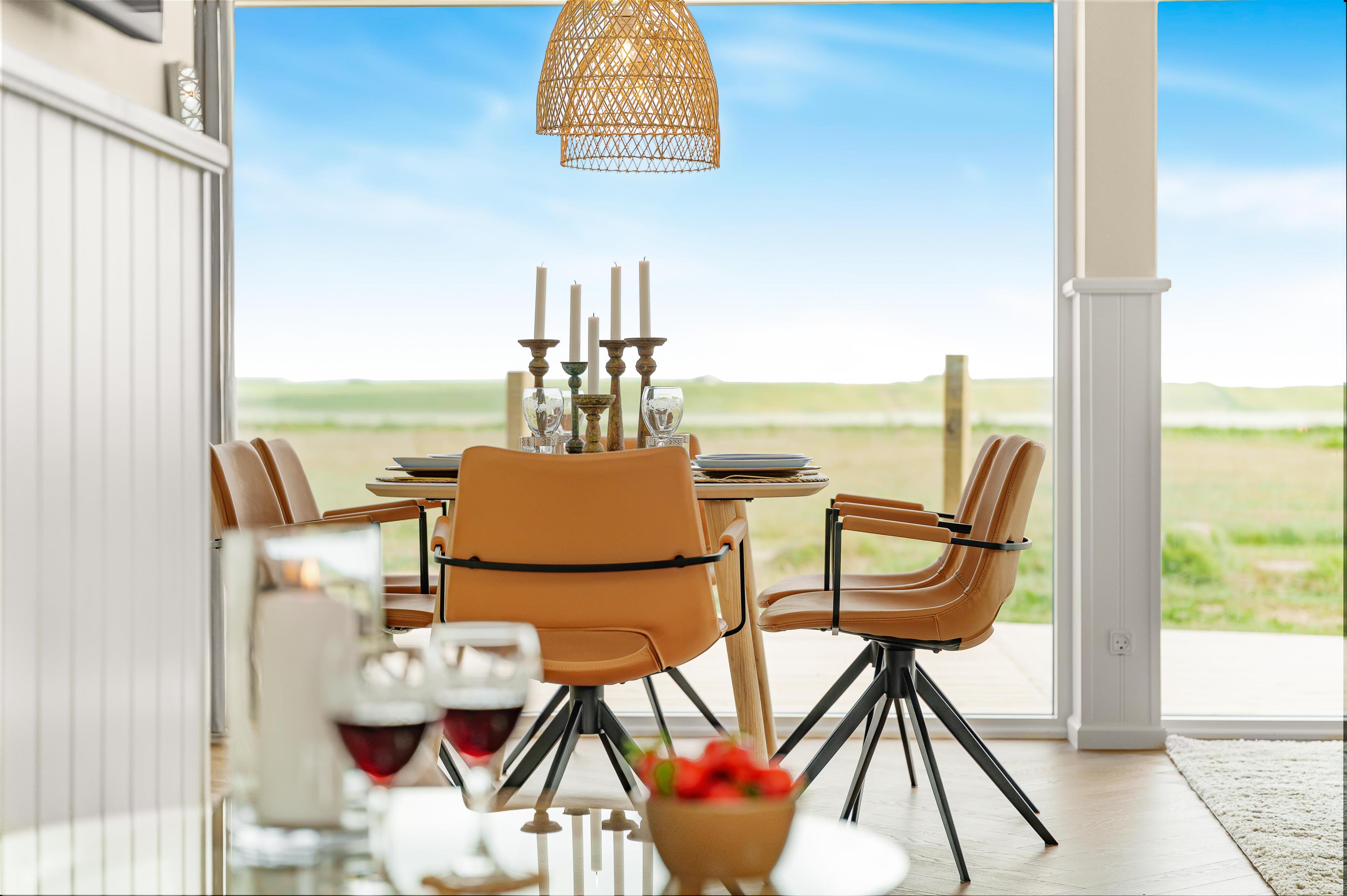 Det åbne køkken er bl.a. udstyret med induktionskogeplade med indbygget emhætte, indbygningsovn, opvaskemaskine, mikroovn samt køle-/fryseskab. Den tilberedte mad kan nydes ved spisebordet, som er placeret tæt ved køkkenet, mens man betages af udsigten til Ferring Sø og det omkringliggende område.