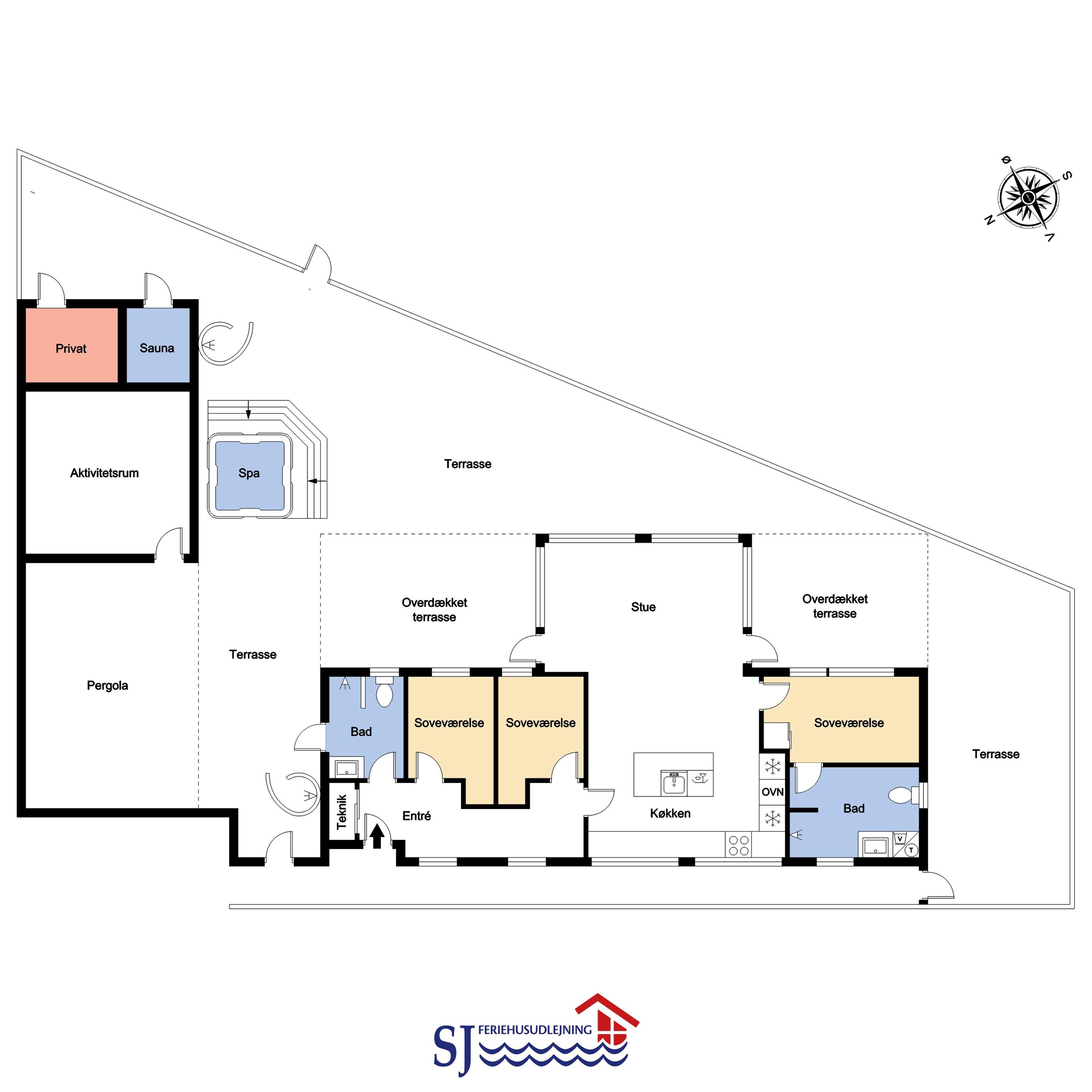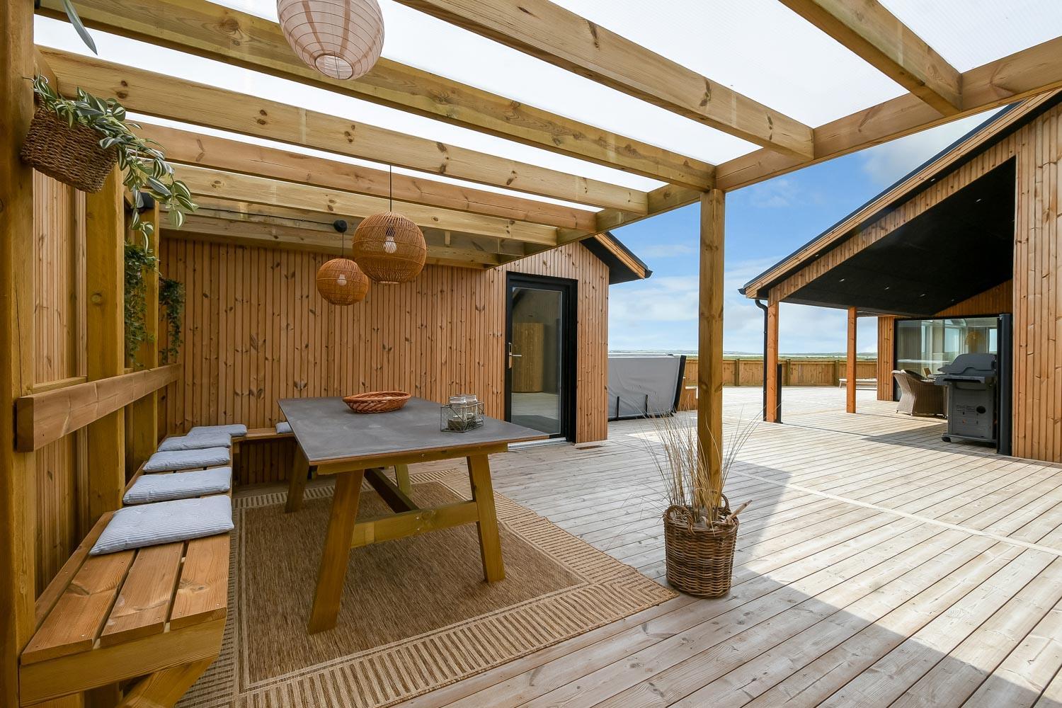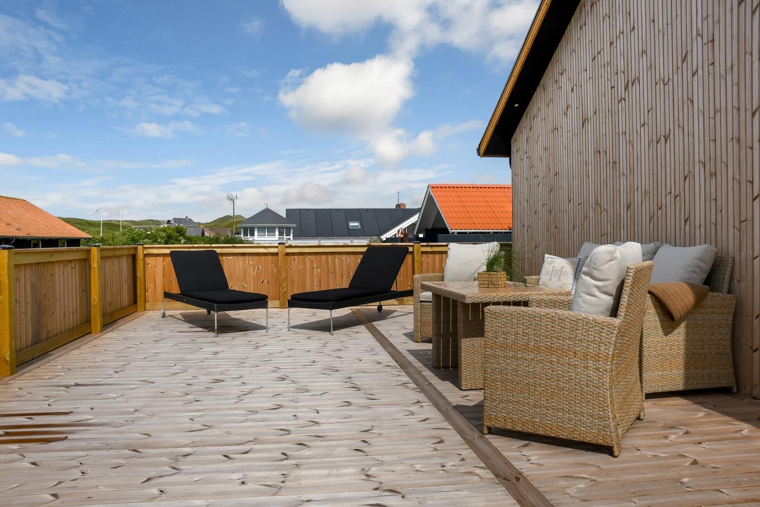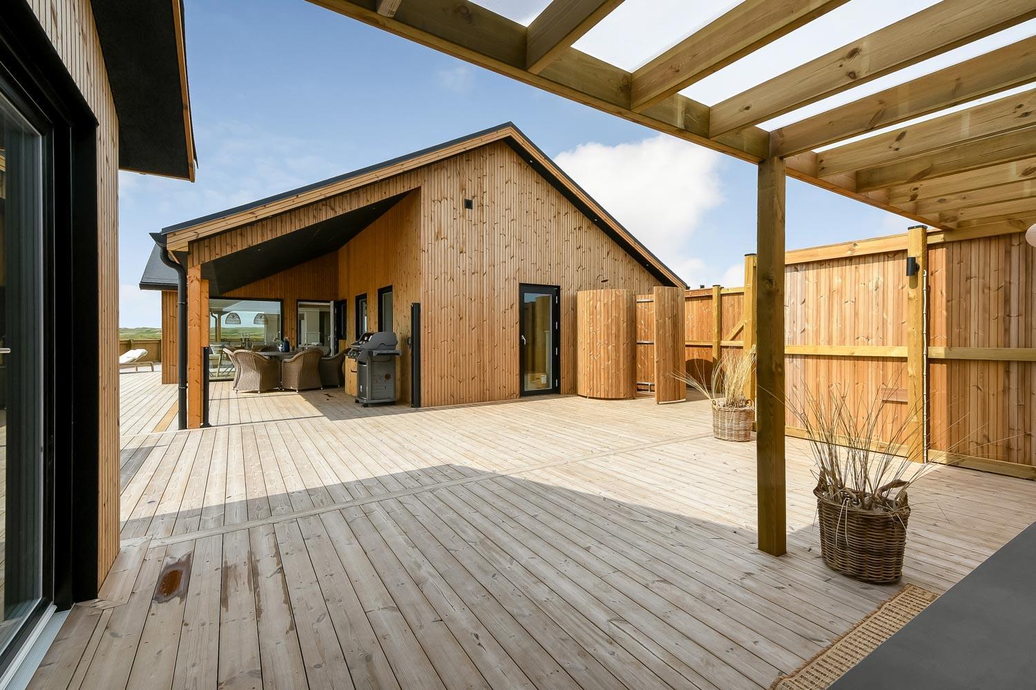 Der er en meget stor terrasse rundt om huset, som er indhegnet og delvist overdækket. Her findes bl.a. en udendørs spa samt to udendørs brusere med både koldt og varmt vand. Der er gratis fibernet.