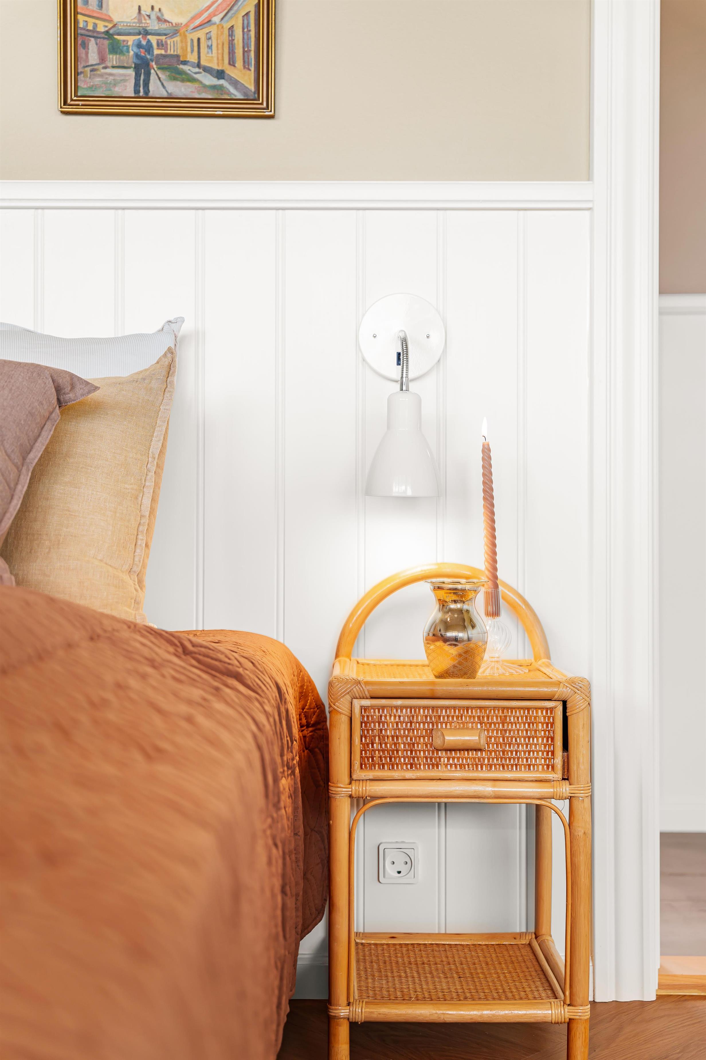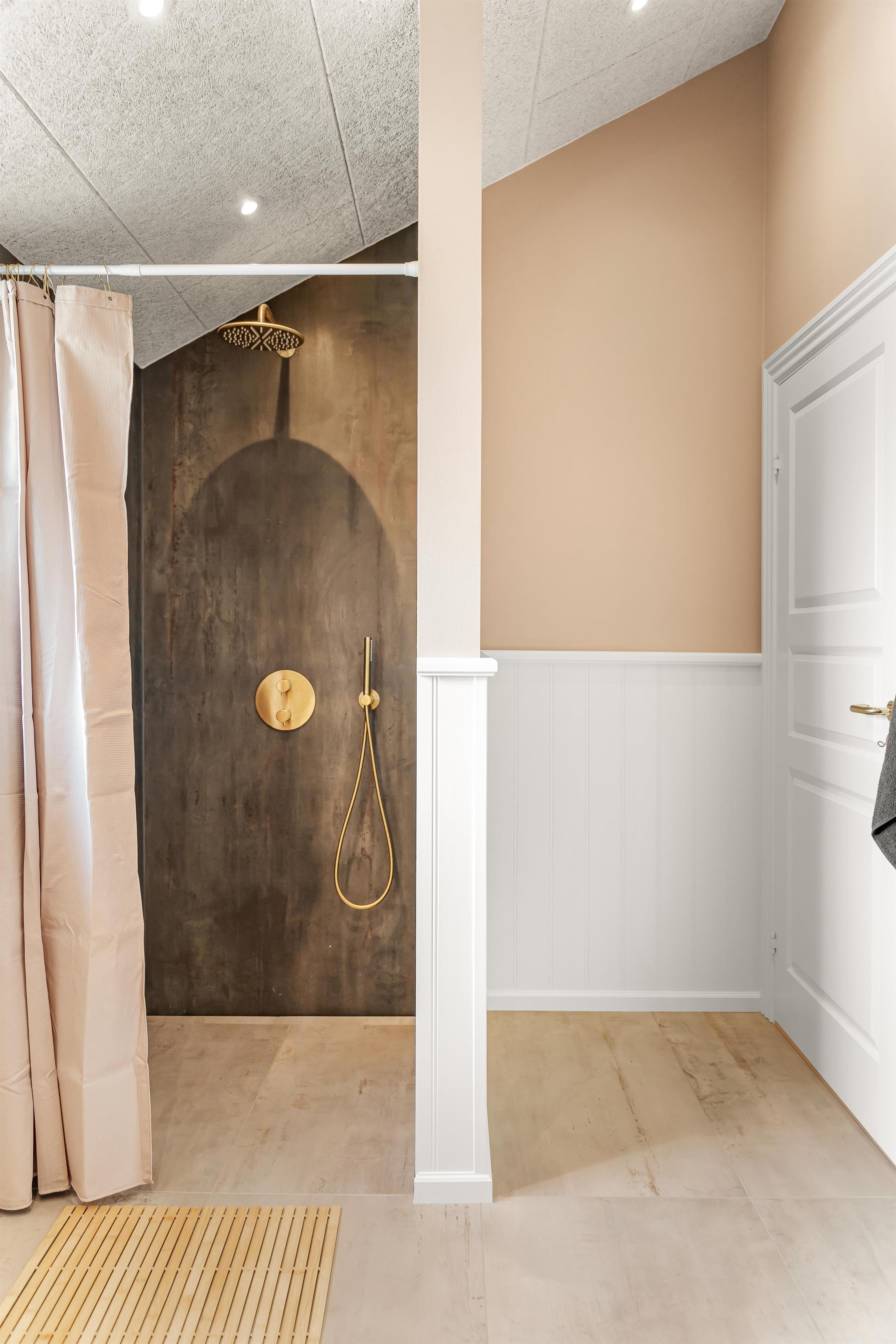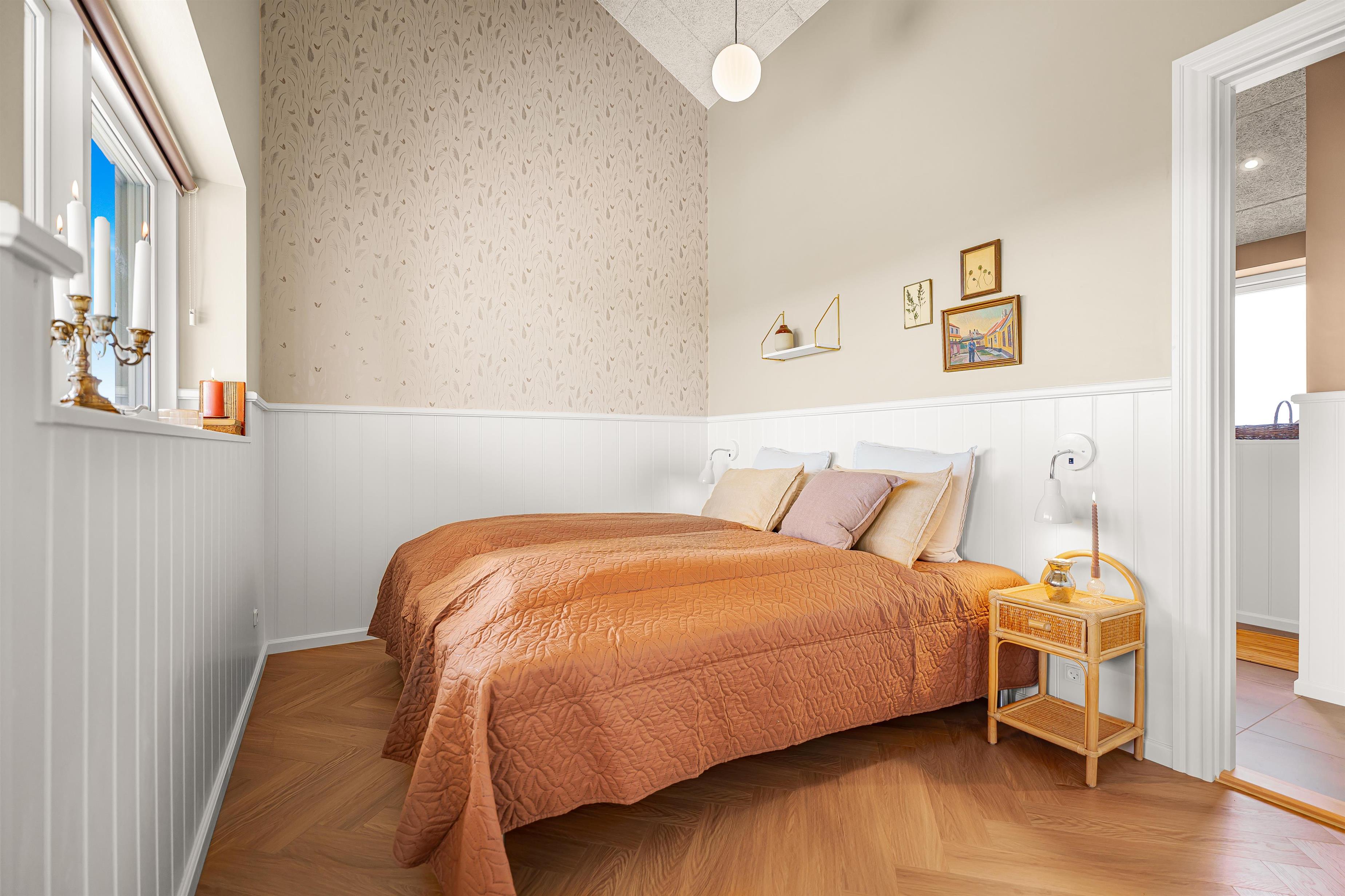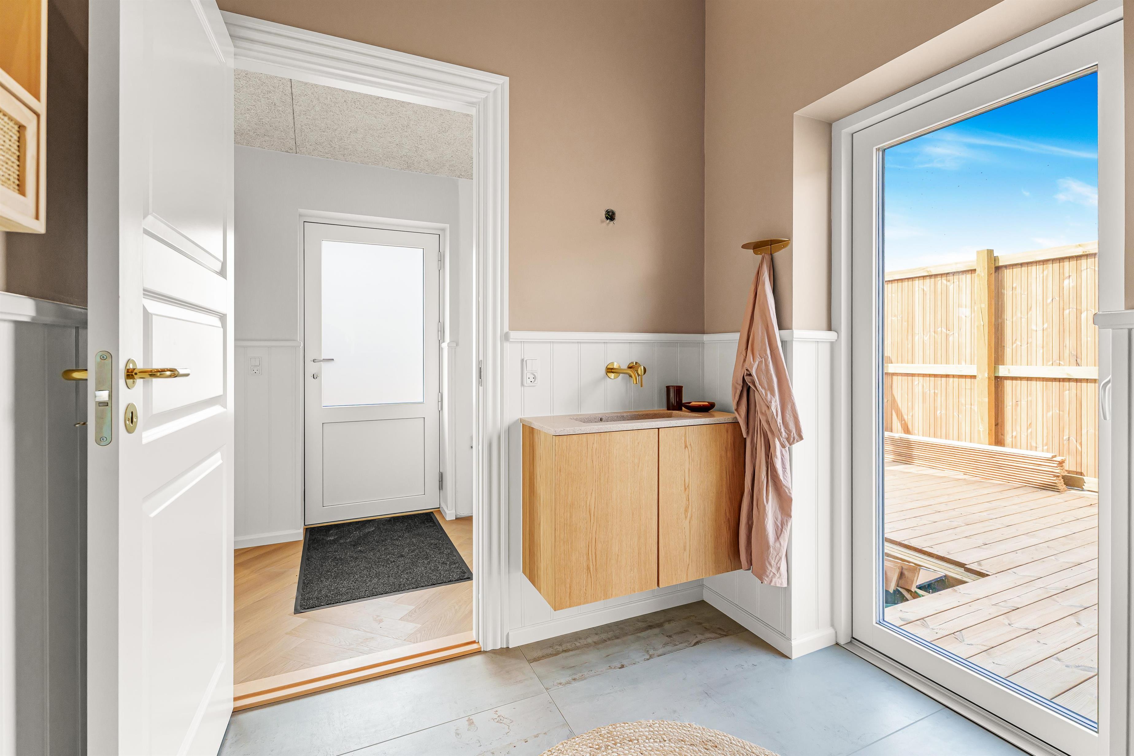 Der er praktiske laminatgulve med gulvvarme i alle opholdsrum, og badeværelserne har klinkegulv med gulvvarme. Fra både stuen og det store soveværelse er der direkte udgang til den store, delvist overdækkede terrasse.