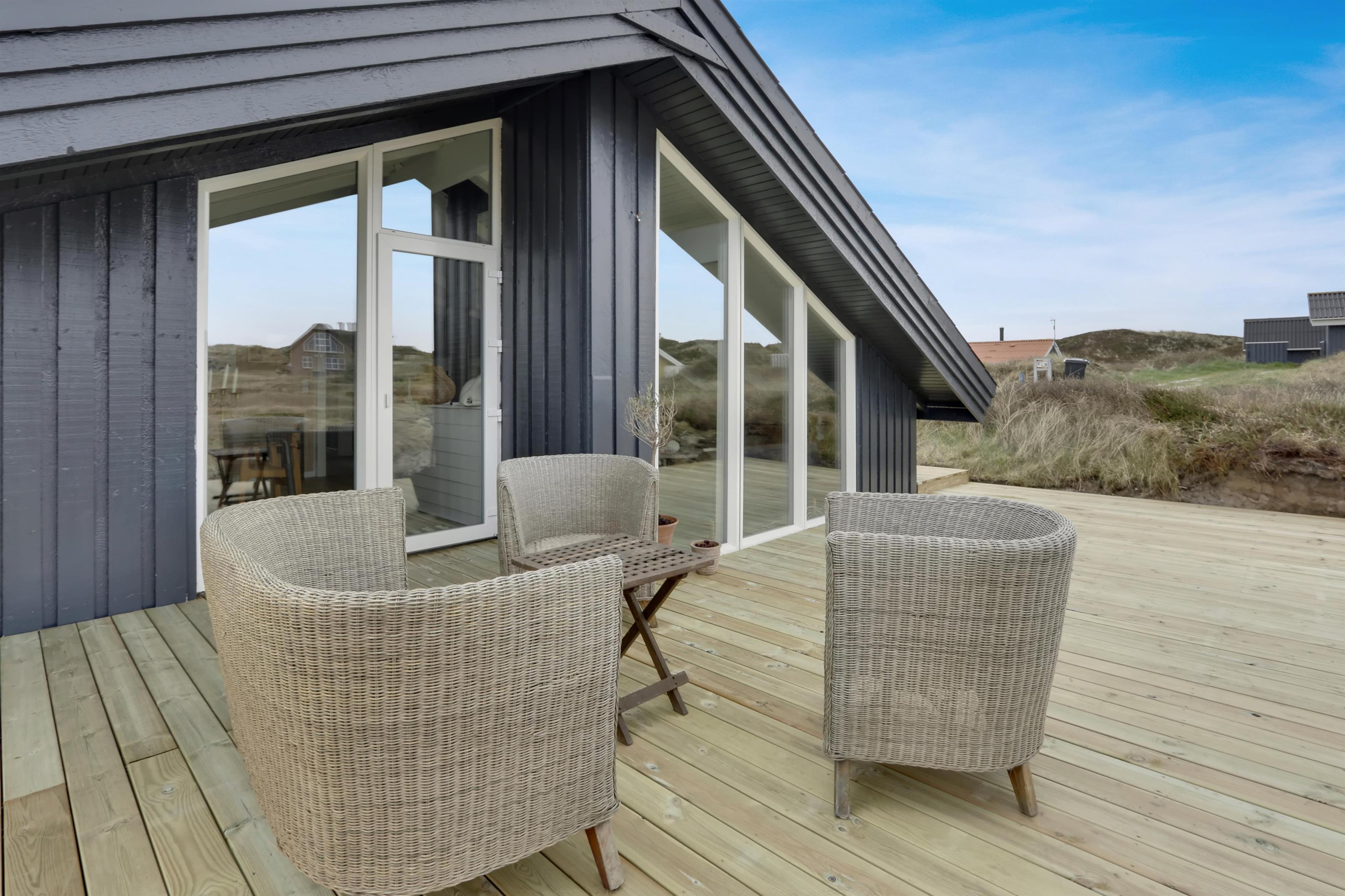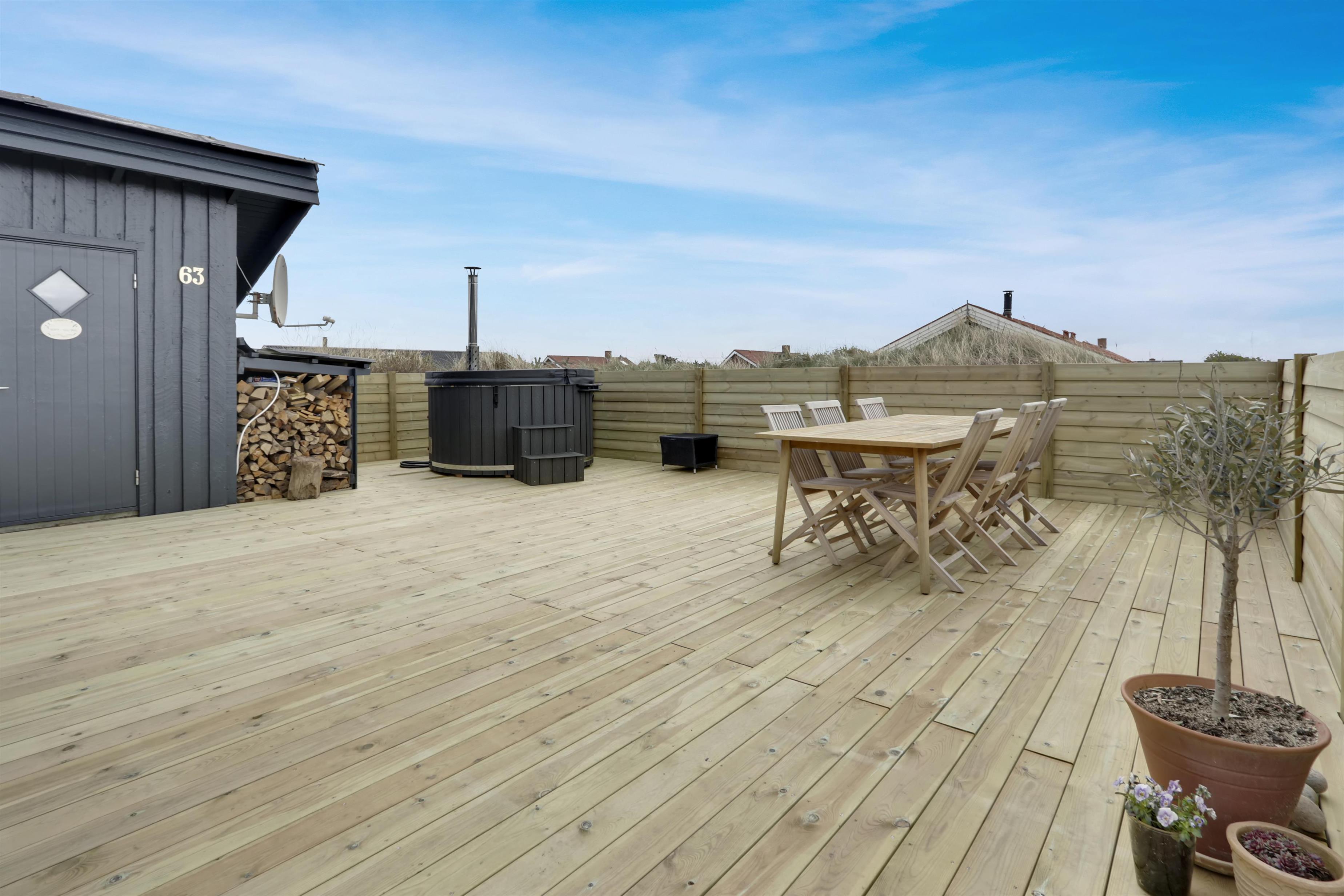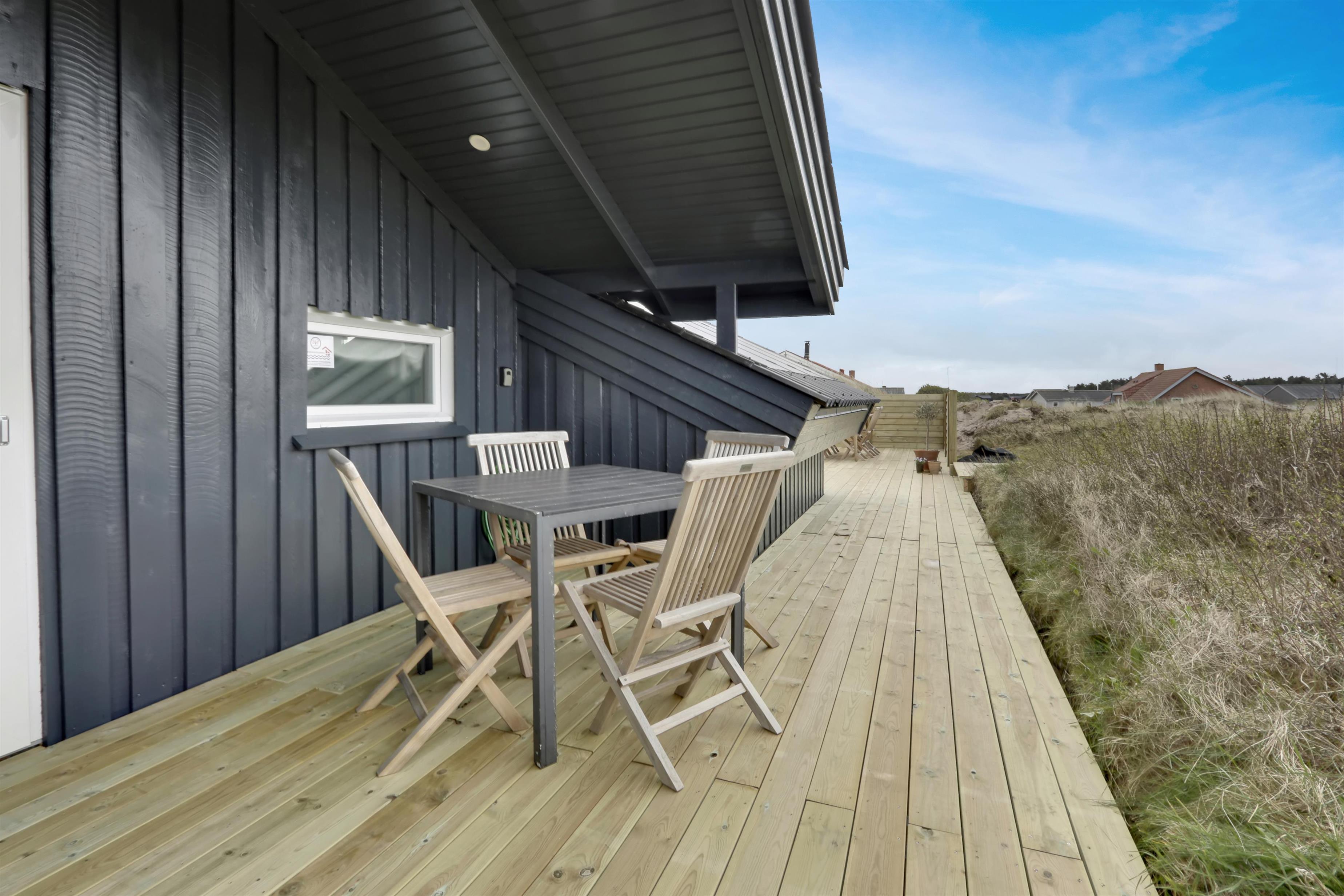 Huset ligger på en ca. 2.600 m2 stor klitgrund. På den store terrasse er der vildmarksbad som opvarmes med jeres medbragte brænde. Der er udgang til 3 dejlige terrasser som er forbundet med en dejlig flisebelagt gangsti, i 2025 er terrasserne blevet gjort størrer. Terrassen med udgang fra køkkent er delvis overdækket. Der er havemøbler og solvogne til rådighed samt en gasgrill. Fra terrasserne kan man høre havets brusen. Nyd en gåtur ved Vesterhavet. Find sten og rav eller sæt jer i klitterne og nyd solnedgangen over havet.
