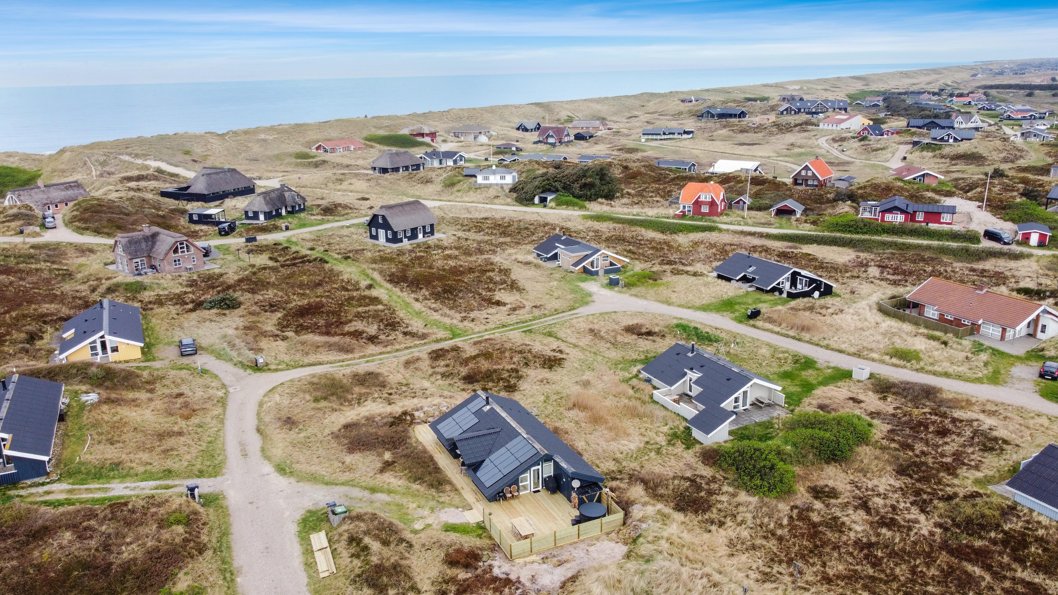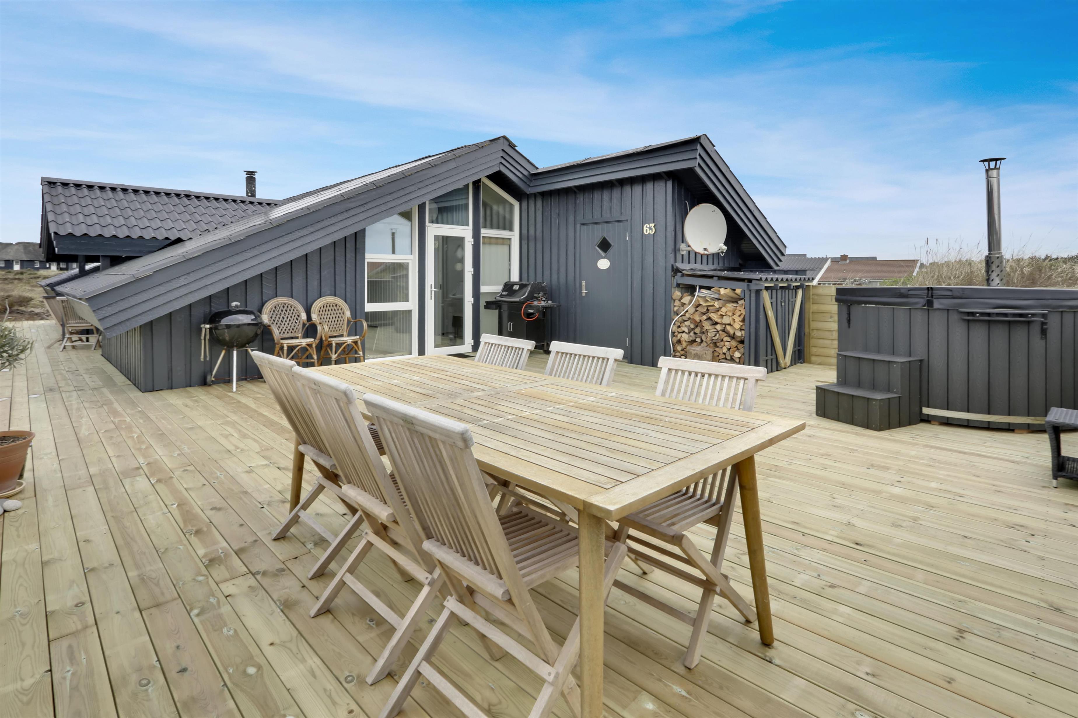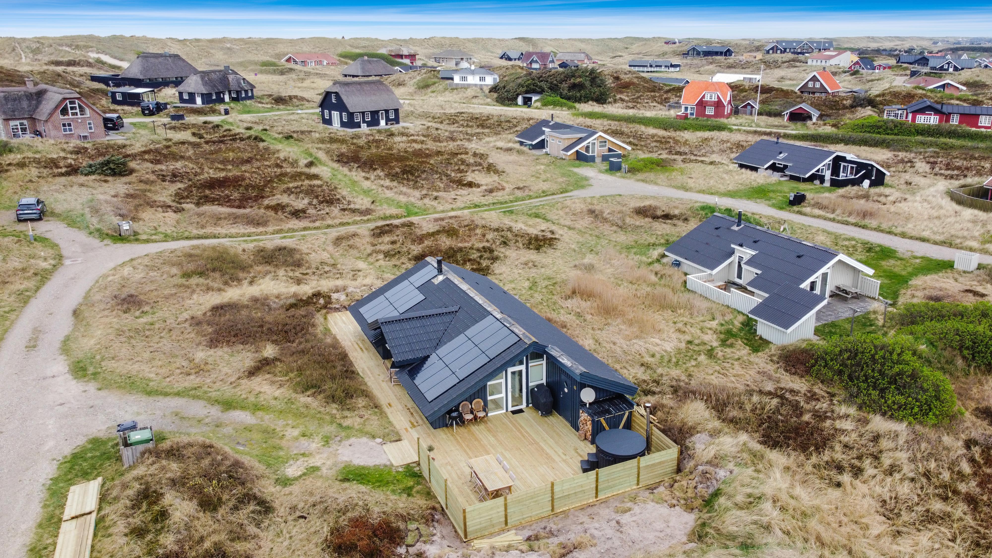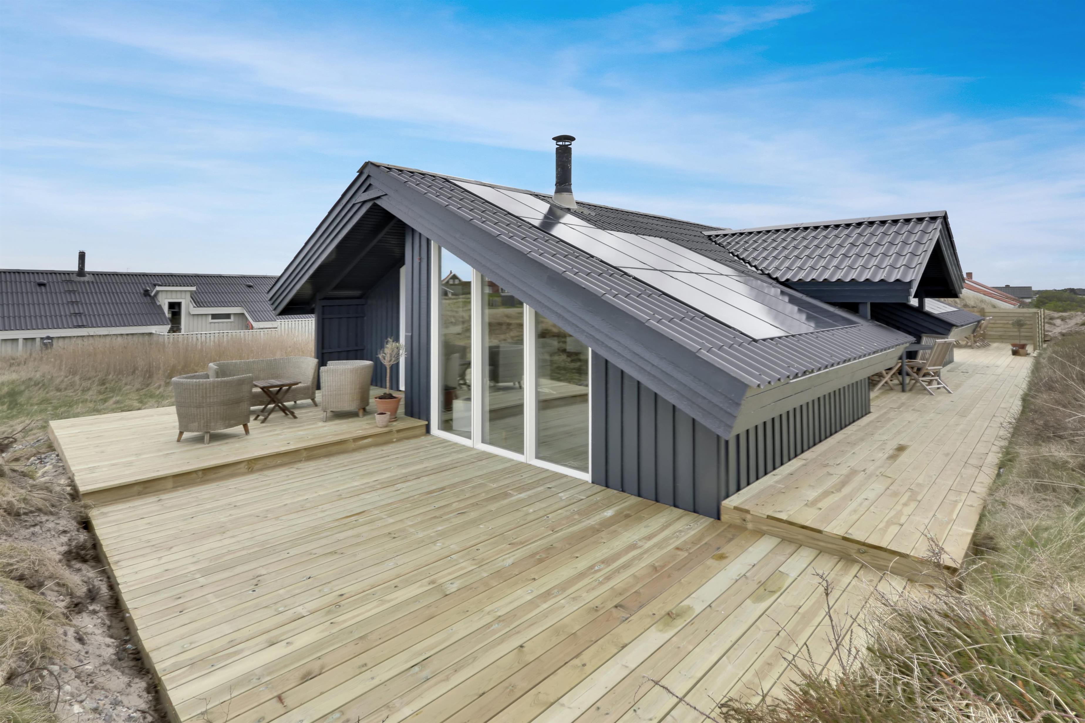 Huset ligger på en ca. 2.600 m2 stor klitgrund. På den store terrasse er der vildmarksbad som opvarmes med jeres medbragte brænde. Der er udgang til 3 dejlige terrasser som er forbundet med en dejlig flisebelagt gangsti, i 2025 er terrasserne blevet gjort størrer. Terrassen med udgang fra køkkent er delvis overdækket. Der er havemøbler og solvogne til rådighed samt en gasgrill. Fra terrasserne kan man høre havets brusen. Nyd en gåtur ved Vesterhavet. Find sten og rav eller sæt jer i klitterne og nyd solnedgangen over havet.
