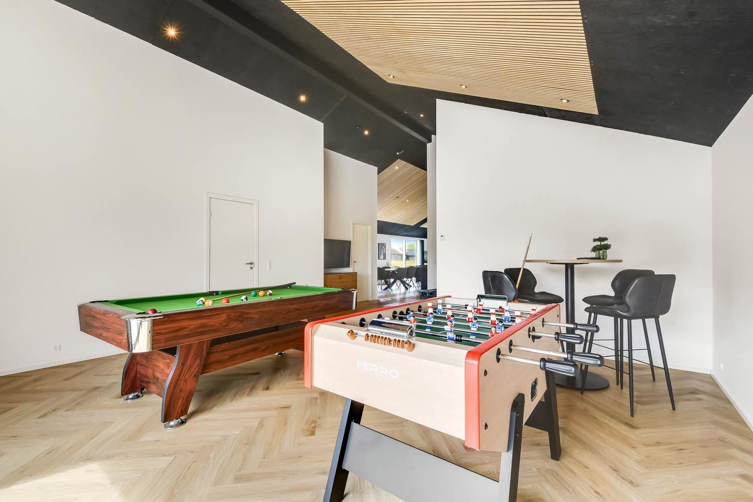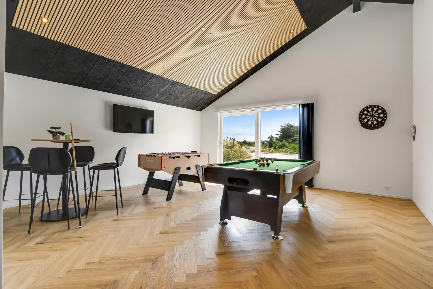 Husets wellness afdeling har bla. indendørs spabad. Der er udgang til det store og unikke terrasse anlæg, hvor der hvor der også er en udendørs spa og sauna. Det separat aktivitetsrummet indeholder: Bordfodbold og billardbord. Her kan man få flere timer til at gå. 2 badeværelser, med dobbelt brusekabine i hver samt toilet, håndvask og gulvvarme. Vaskemaskiner og tørretumblere er en selvfølge. Luft til vand varmepumpe gør huset særdeles energivenligt og bevirker også et billigere forbrug. Huset lejes ikke ud til ungdomsgrupper. Har man el-bil eller en Plug-in hybrid, så er der lade boks til Type 2 lade stik, der kan lade op til 11 kWh. Ikke ryger hus. Max. 1 hund tilladt.
