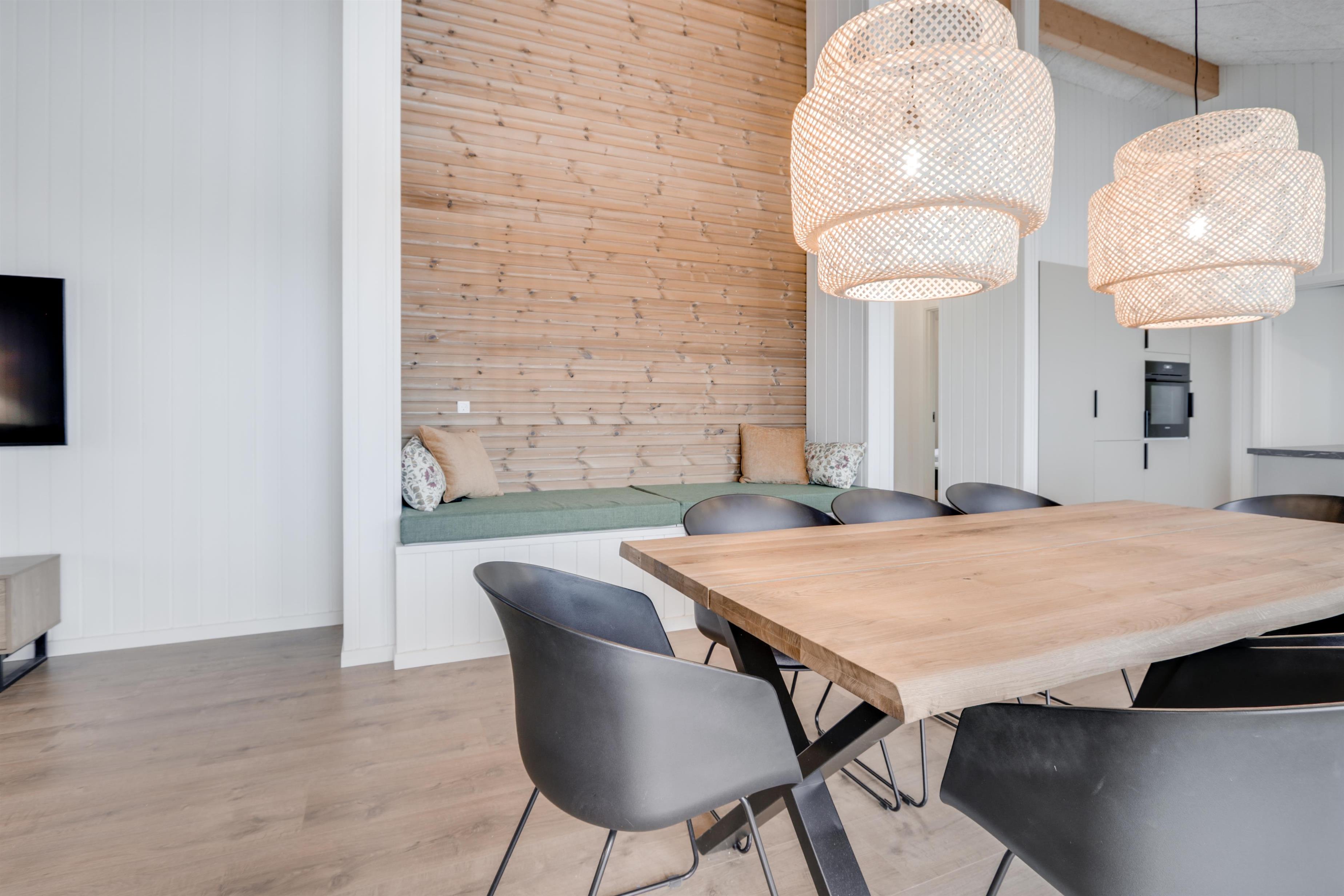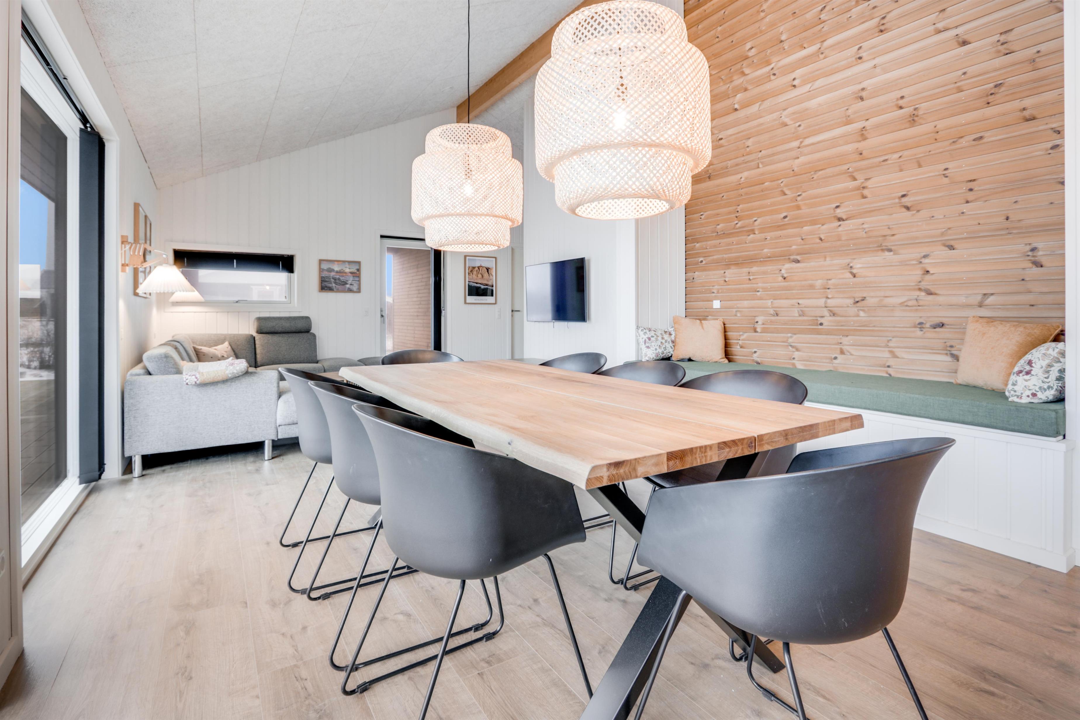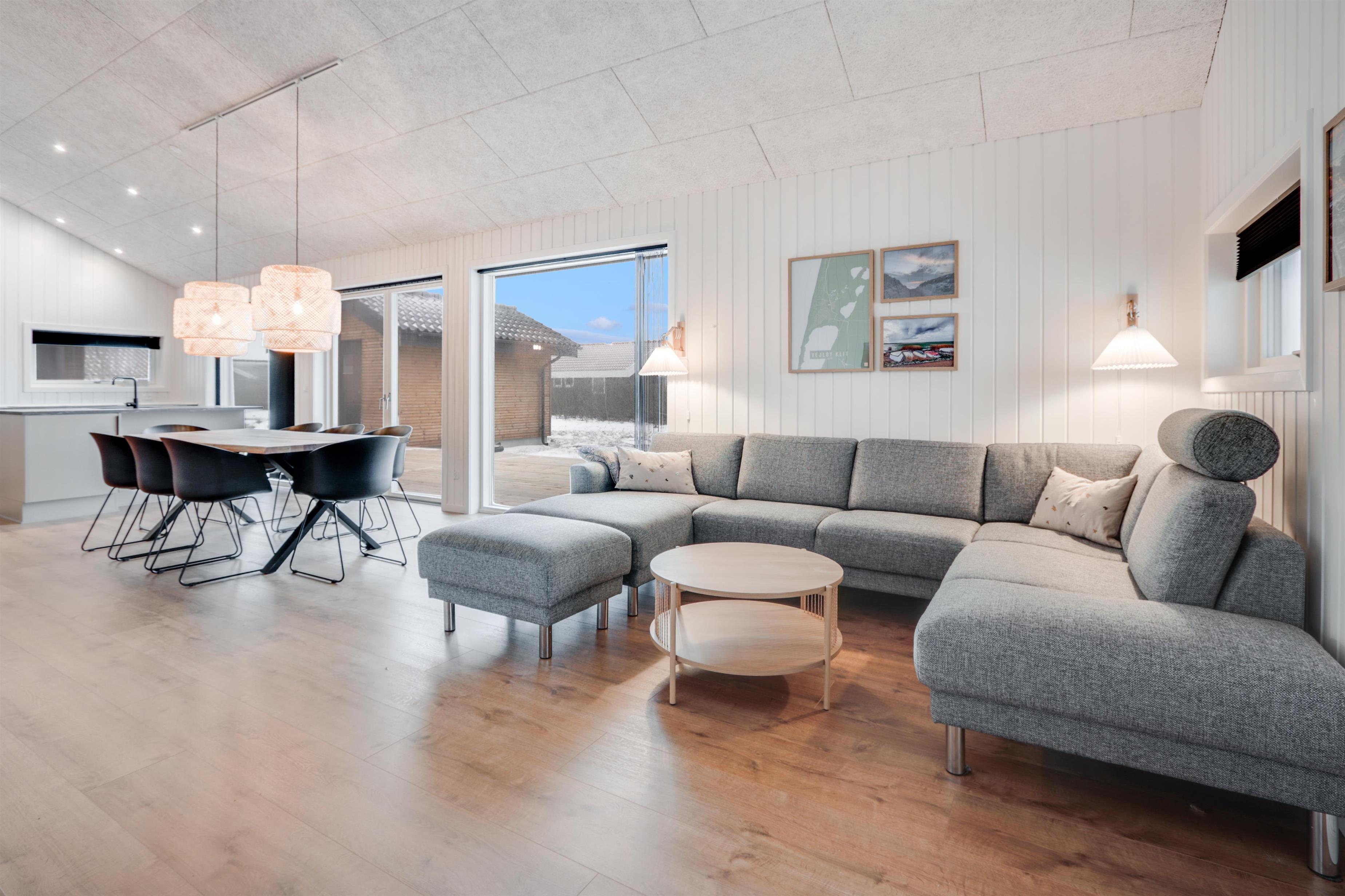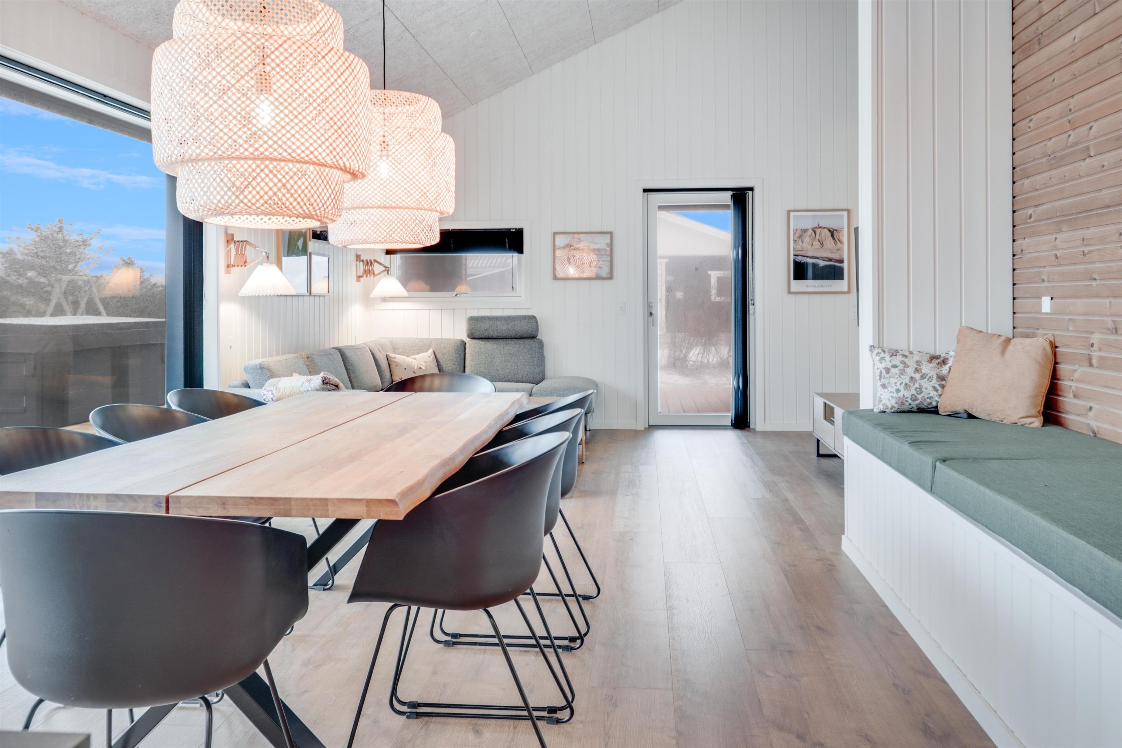 Det 118 m² store feriehus er moderne og velindrettet med god plads og høj funktionalitet. Det centrale køkken/alrum er kombineret med en hyggelig opholdsstue – husets hjerte, hvor hele familien kan være sammen, uanset om der laves mad, spilles spil eller ses film. I alrummet findes også en indbydende alkove, perfekt til afslapning. Store vinduespartier giver masser af lys og udsigt til det smukke klitlandskab.