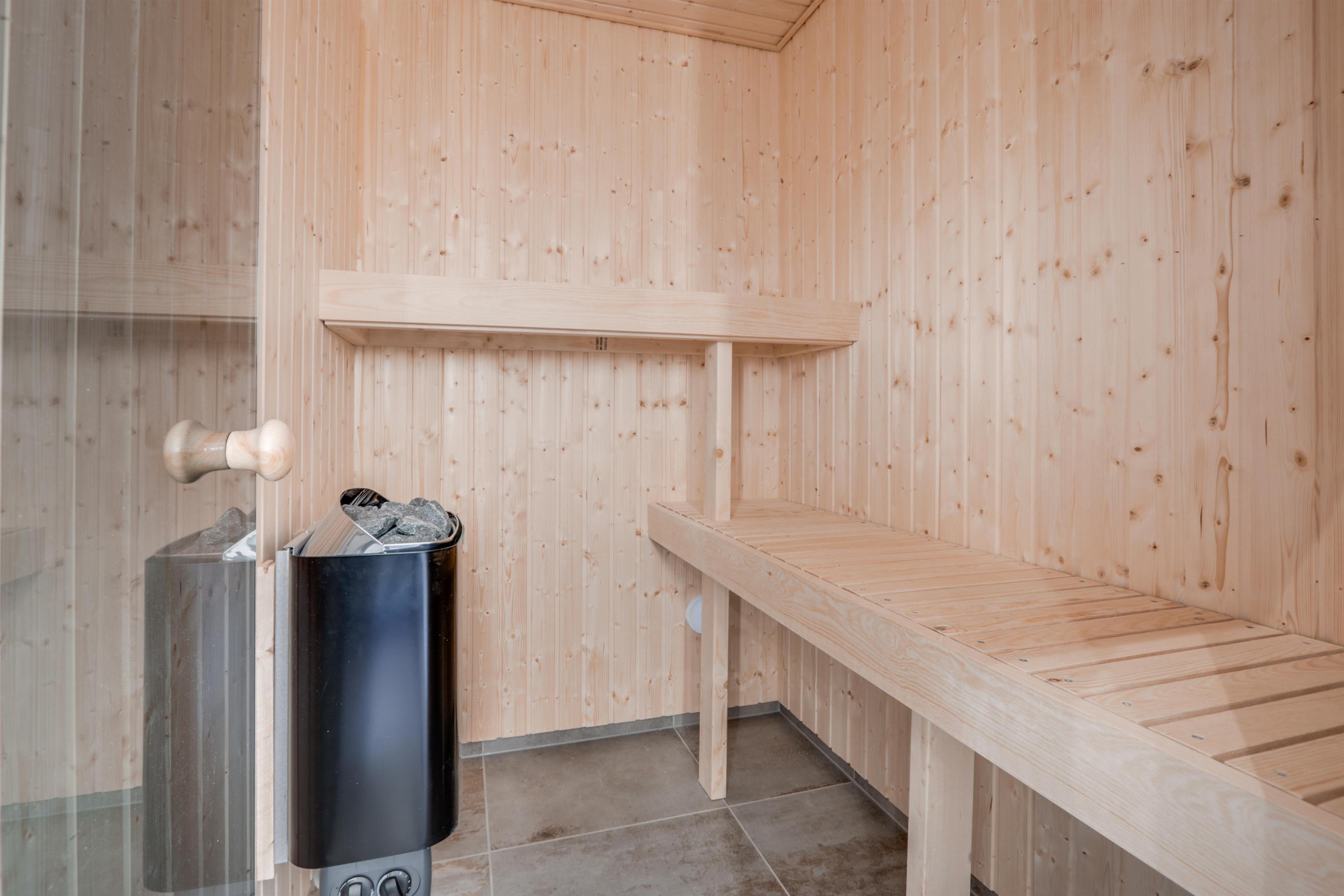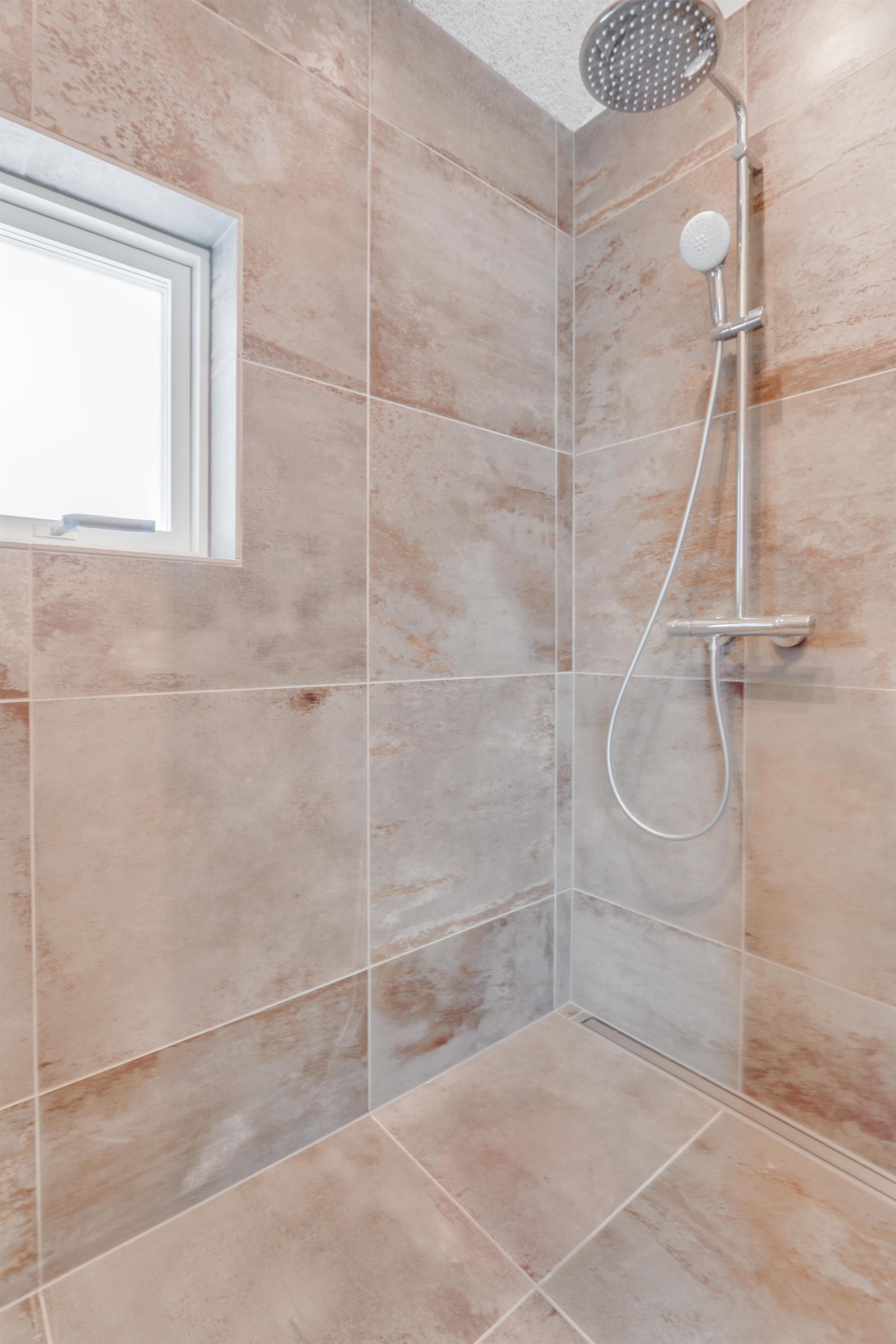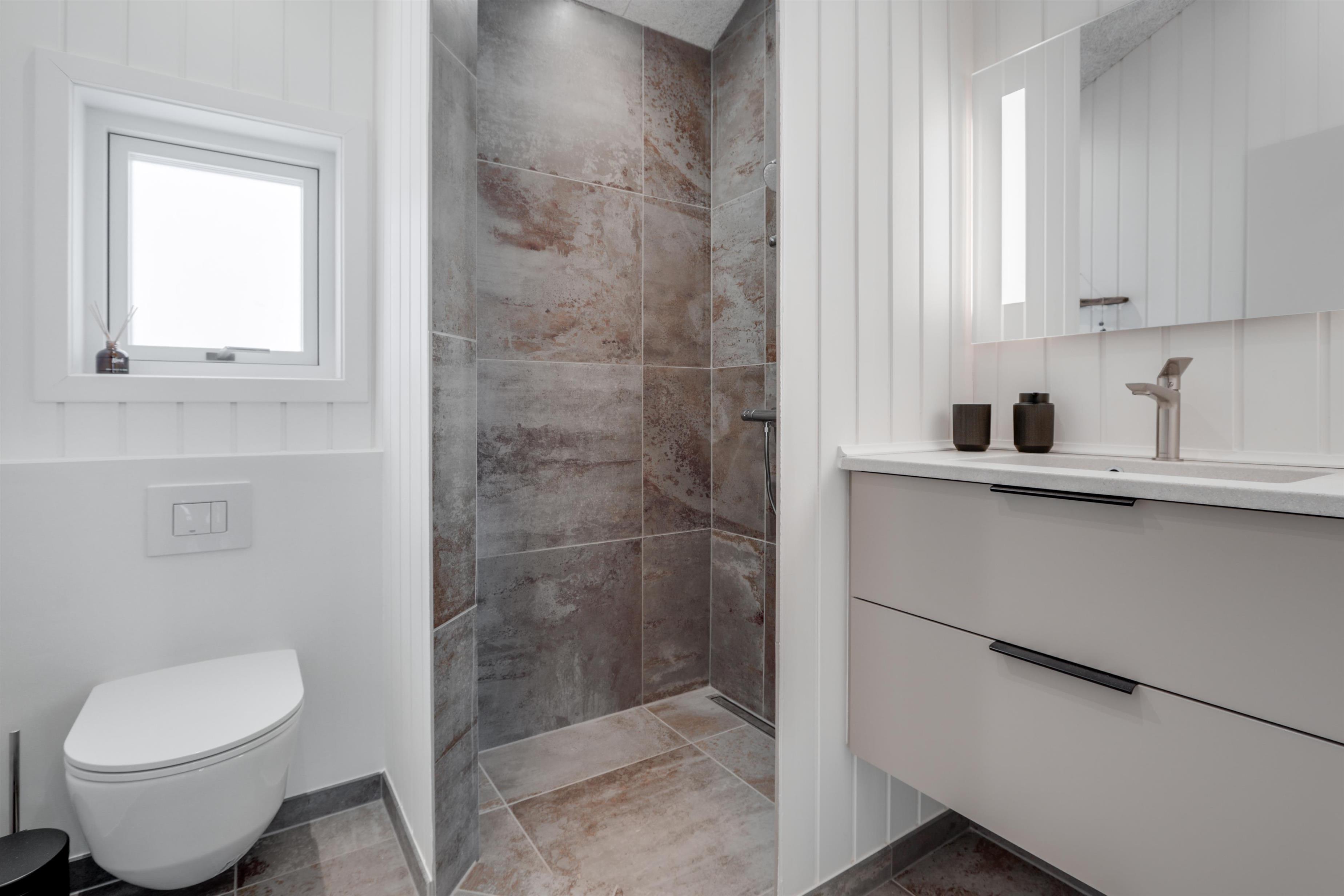 Der er to badeværelser, begge med bruser – det ene desuden med sauna og direkte adgang til terrassen og jacuzzien.