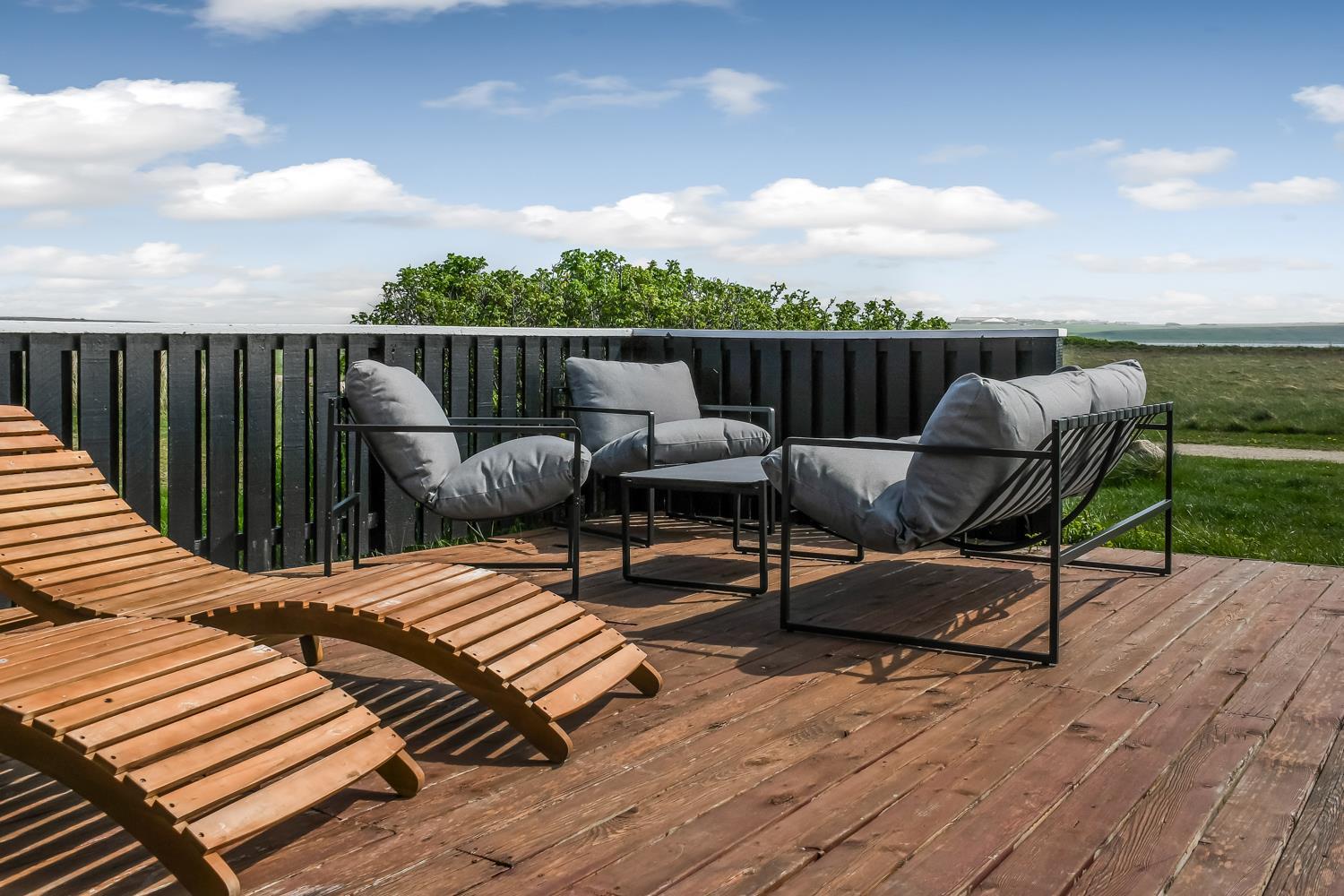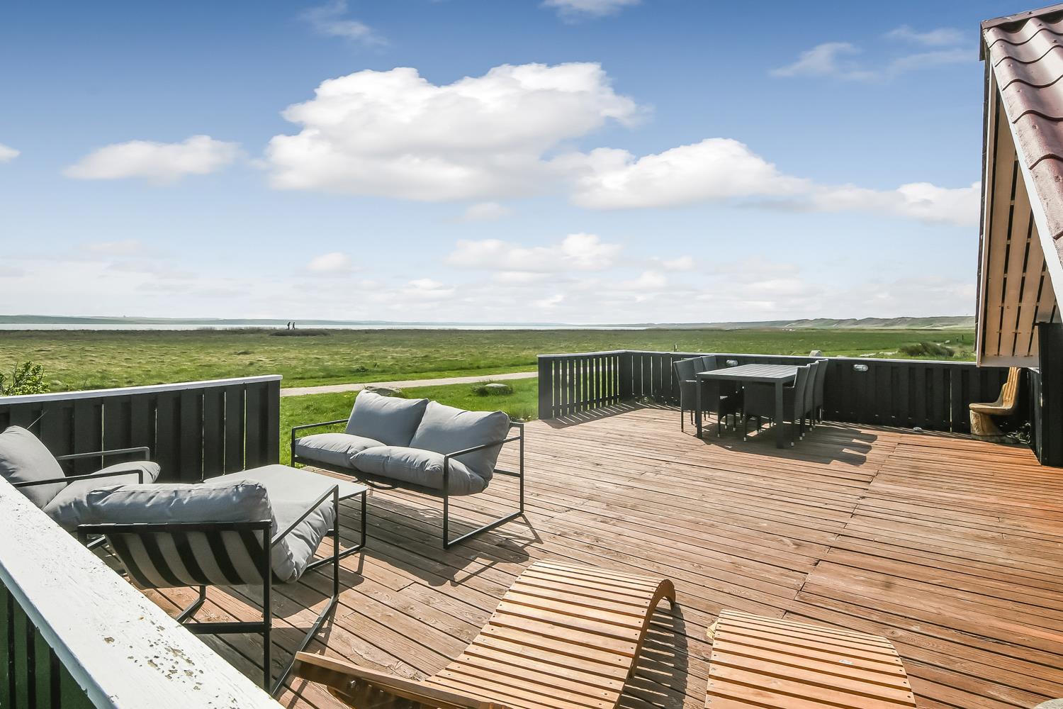 Huset ligger på en af de absolut bedste grunde i området - direkte ud til fredningslinjen. Dejlig sydvendt, delvis overdækket terrasse med nye havemøbler, gas grill og liggestole. Herfra kan man uforstyrret nyde en flot udsigt over Ferring Sø og området. Afstand til Ferring Sø er 70 m og Vesterhavets vandkant ligger blot 250 meter fra huset. Herudover ligger huset tæt på en af Vestjylland smukkeste cykel- / vandre ruter der bl.a. byder på mulighed for at se både sø og hav på samme tid samt tæt på indkøb og restaurant.