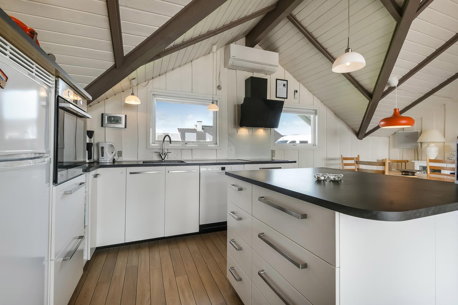 Huset har i 2019/20 gennemgået gennemgribende istandsættelse, hvor det også har fået ny dejlig brændeovn og økonomisk varmepumpe, som sammen sørger for hygge, samt muliggør et altid varmt og rart hus, uanset vejr og årstid. Det nye lækre køkken er veludstyret. Der er bl.a. varmluftsovn og keramiske kogeplader, emhætte, opvaskemaskine, mikroovn gemt væk i skab og køleskab med fryser. Desuden æggekoger, brødrister, kaffemaskine, kogekande, håndmixer og stavblender. Badeværelse med sauna, toilet, bruser, håndvask og klinkegulv med gulvvarme. Fra både terrasse og stue har man en fantastisk panorama-udsigt til Ferring Sø samt udsigt til de høje klitter ved Vesterhavet. Ikke ryger hus. 1 husdyr er tilladt. Har man el-bil eller en Plug-In hybrid, så er der ved huset 3-faset 16amp CEE stik, der kan lade op til 11 kWh.