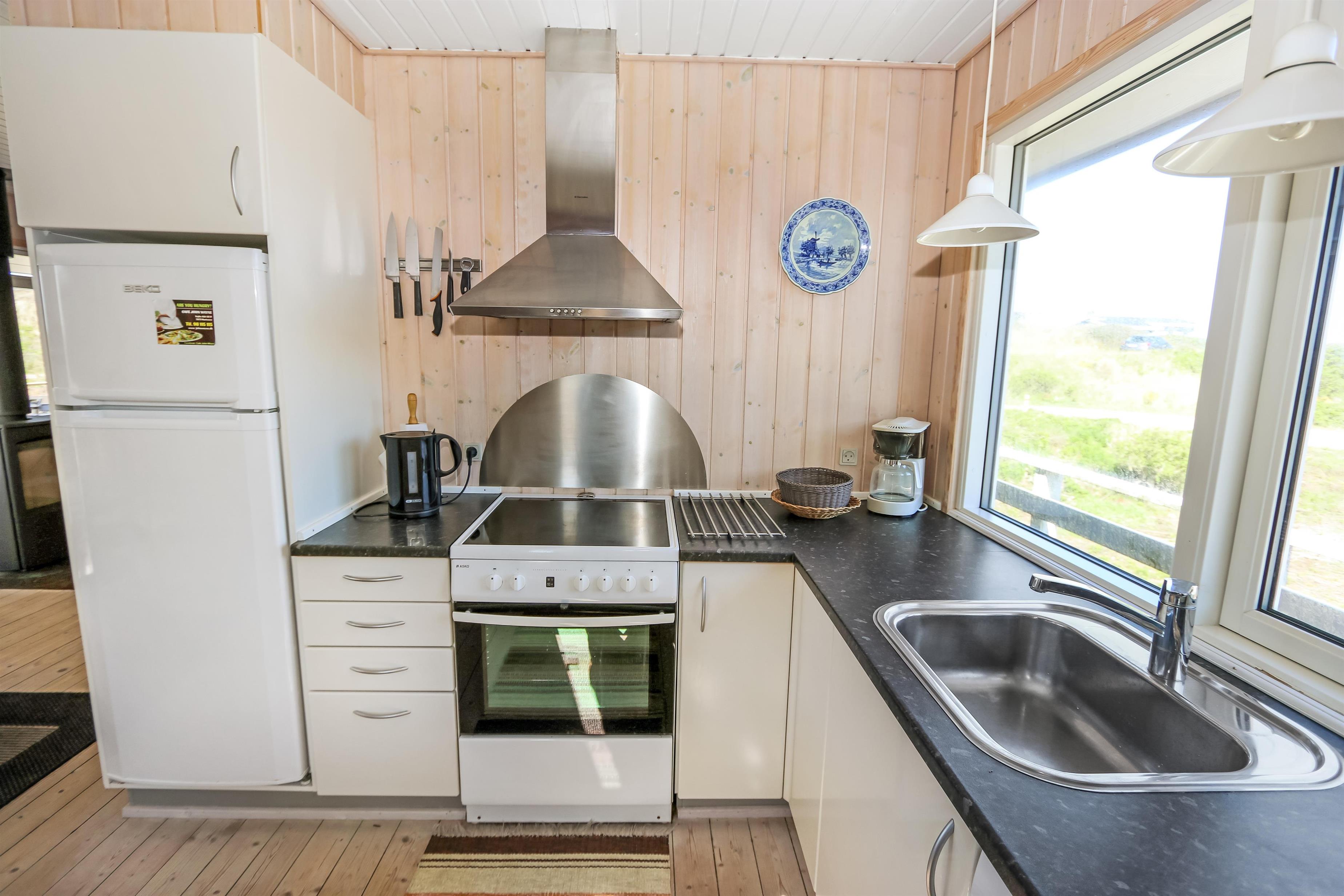 Køkkenet er funktionelt og veludstyret med glaskeramisk komfur, opvaskemaskine, mikroovn samt køle-/fryseskab – perfekt til både hurtige feriemåltider og hyggelige middage. Spisepladsen ligger i naturlig forbindelse med opholdsstuen, så samvær og nærvær er i centrum.