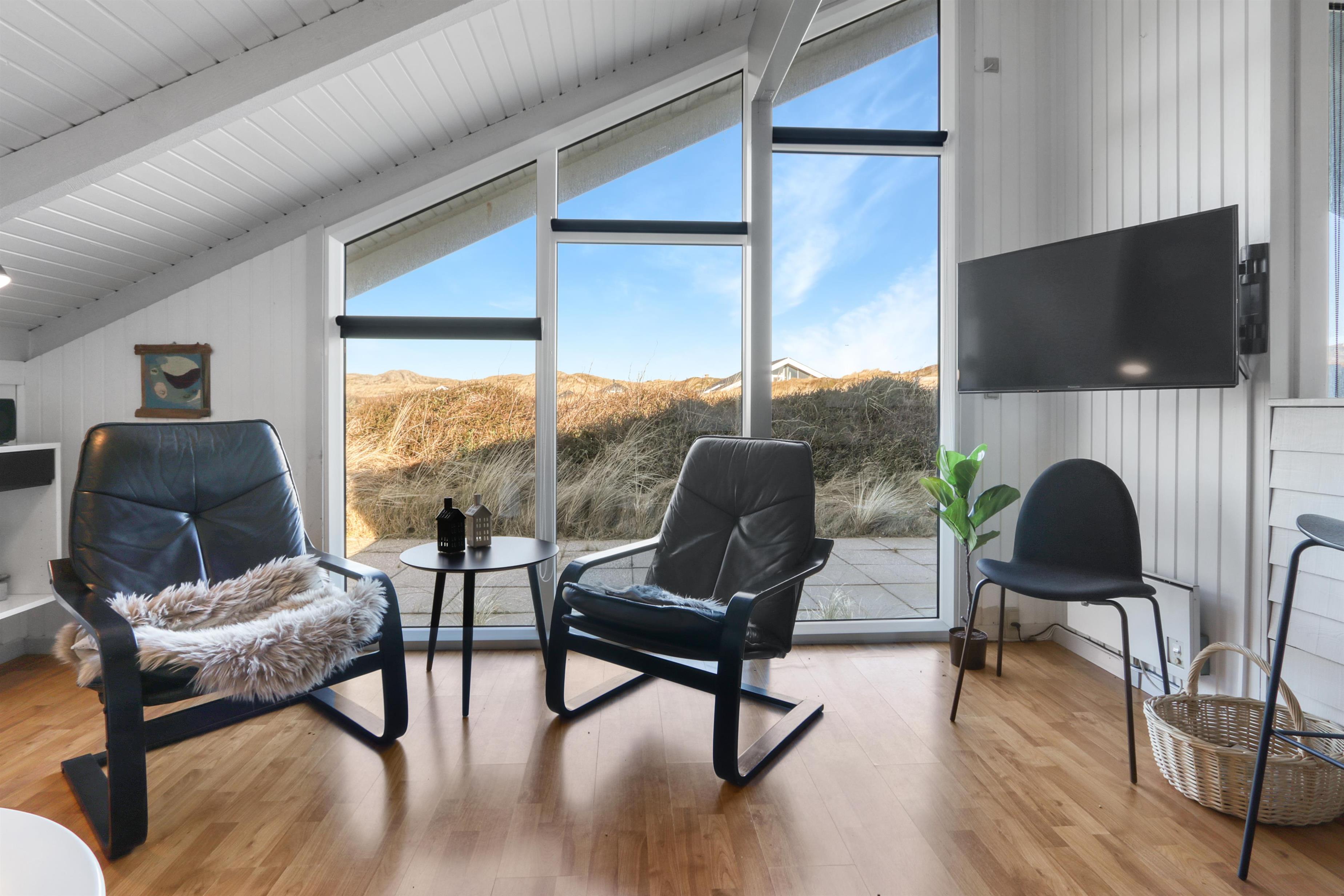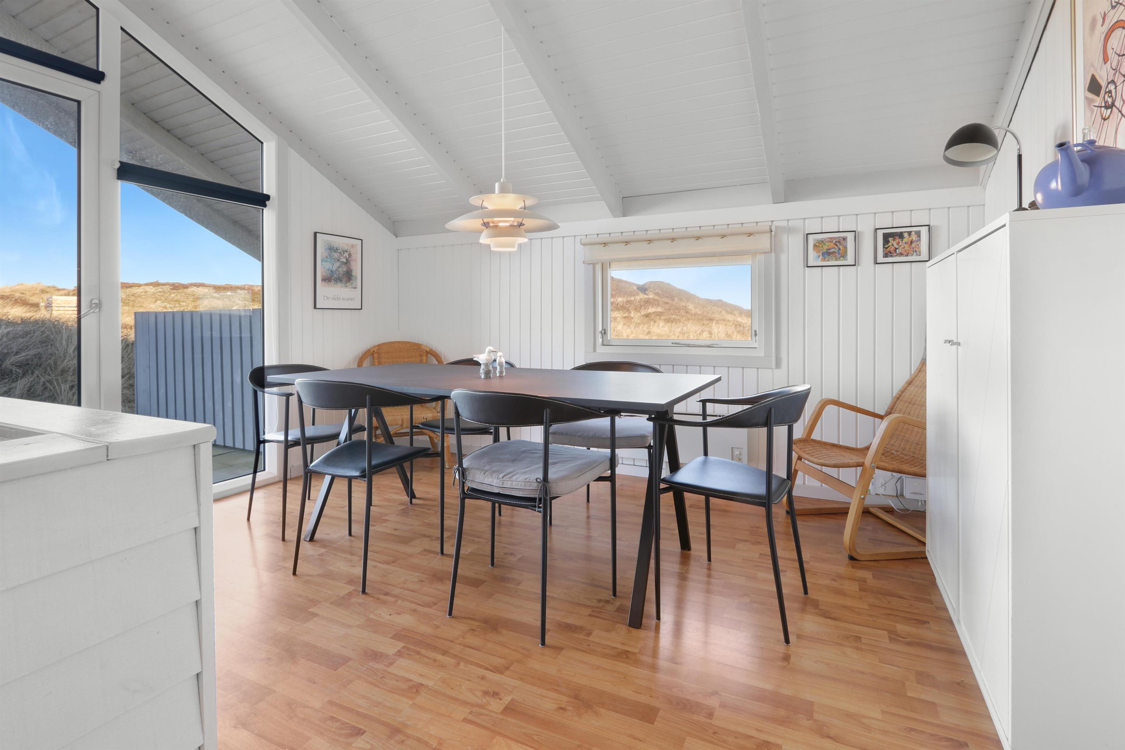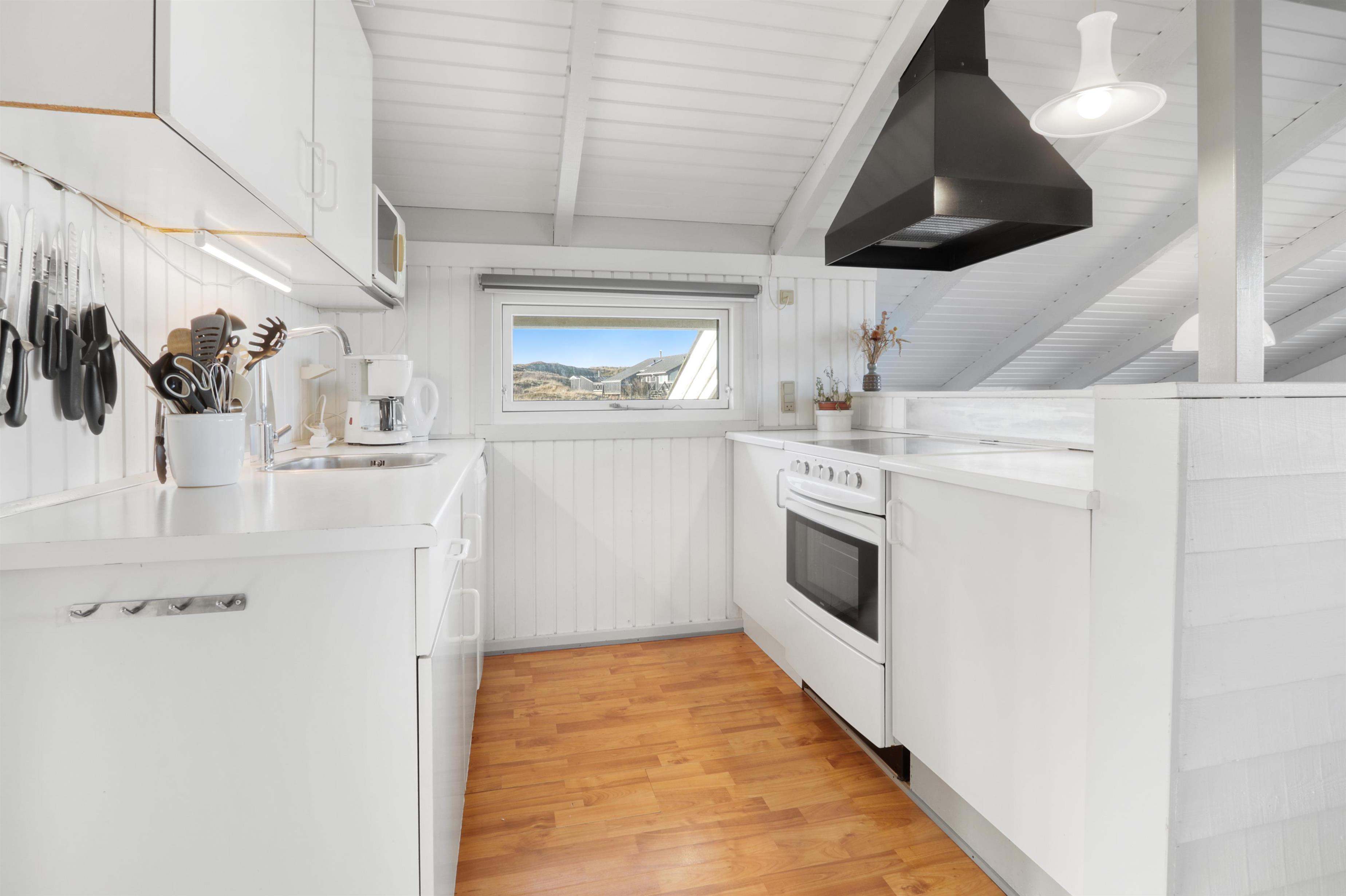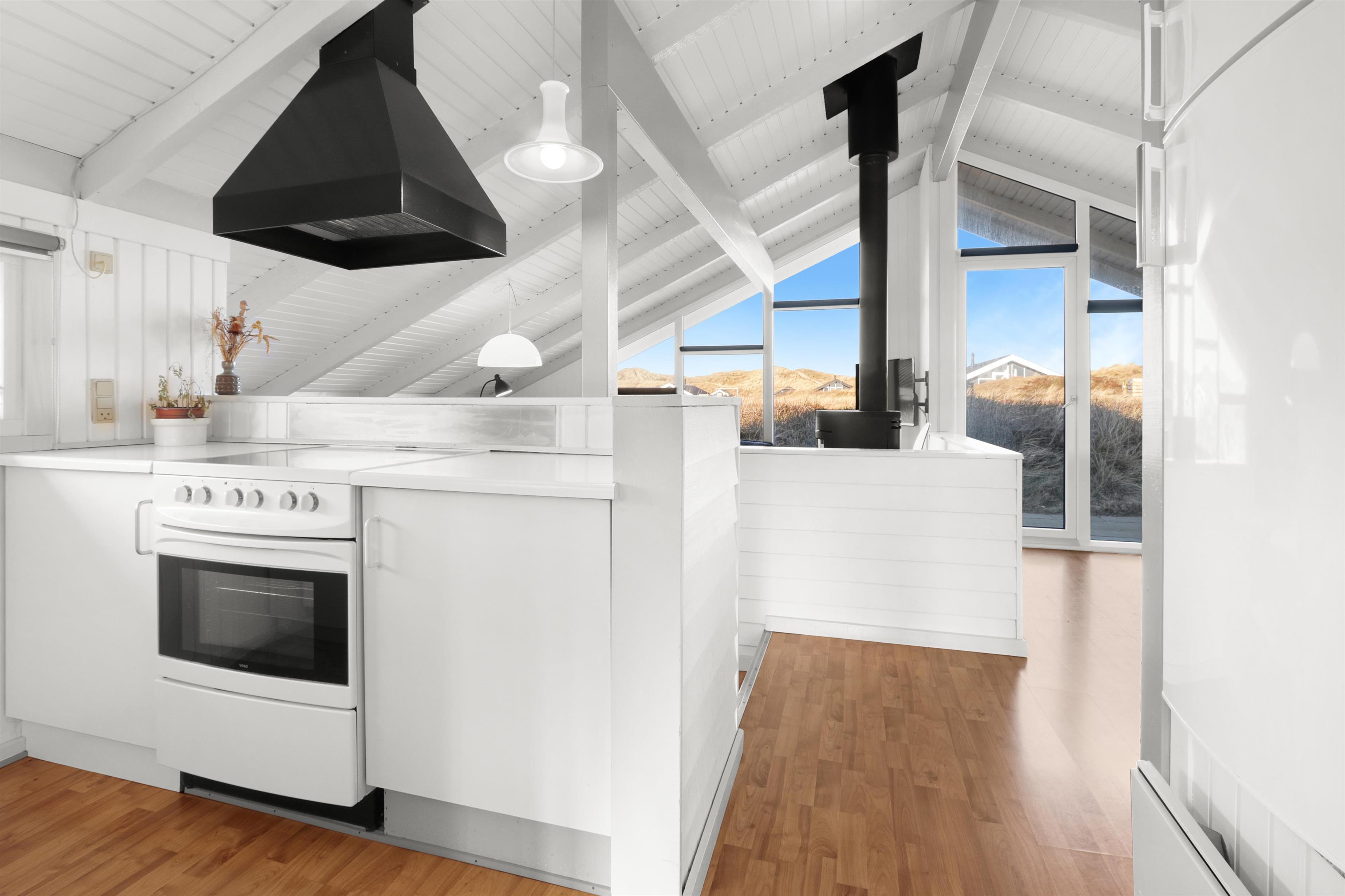 Stue og køkken er kombineret med større vinduespartier mod vest, så man kan følge vejrforandringen på himlen ude over Vesterhavet. Køkkenet er udstyret med glaskeramisk komfur, mikrobølgeovn, køle-/fryseskab og opvaskemaskine.