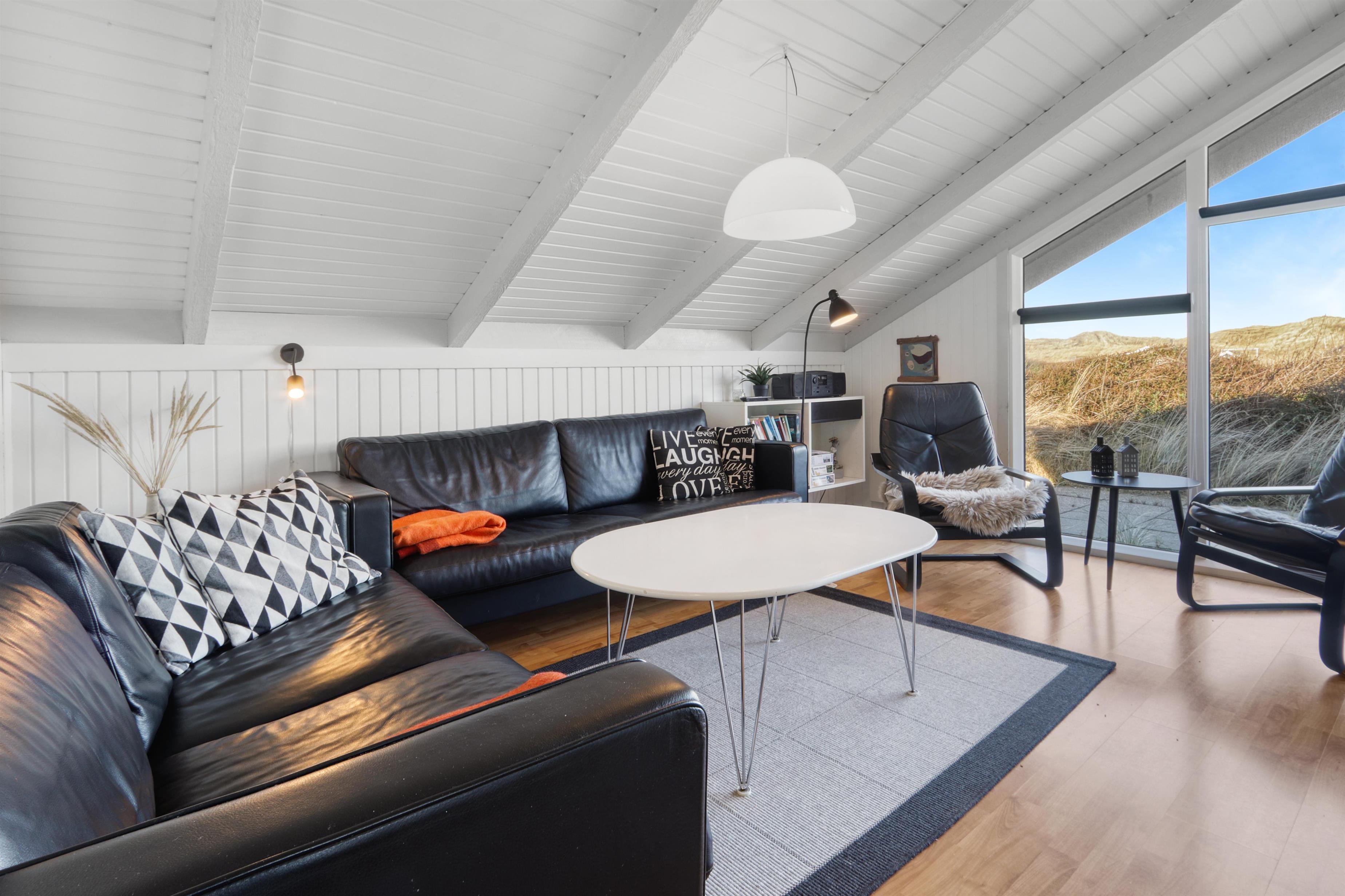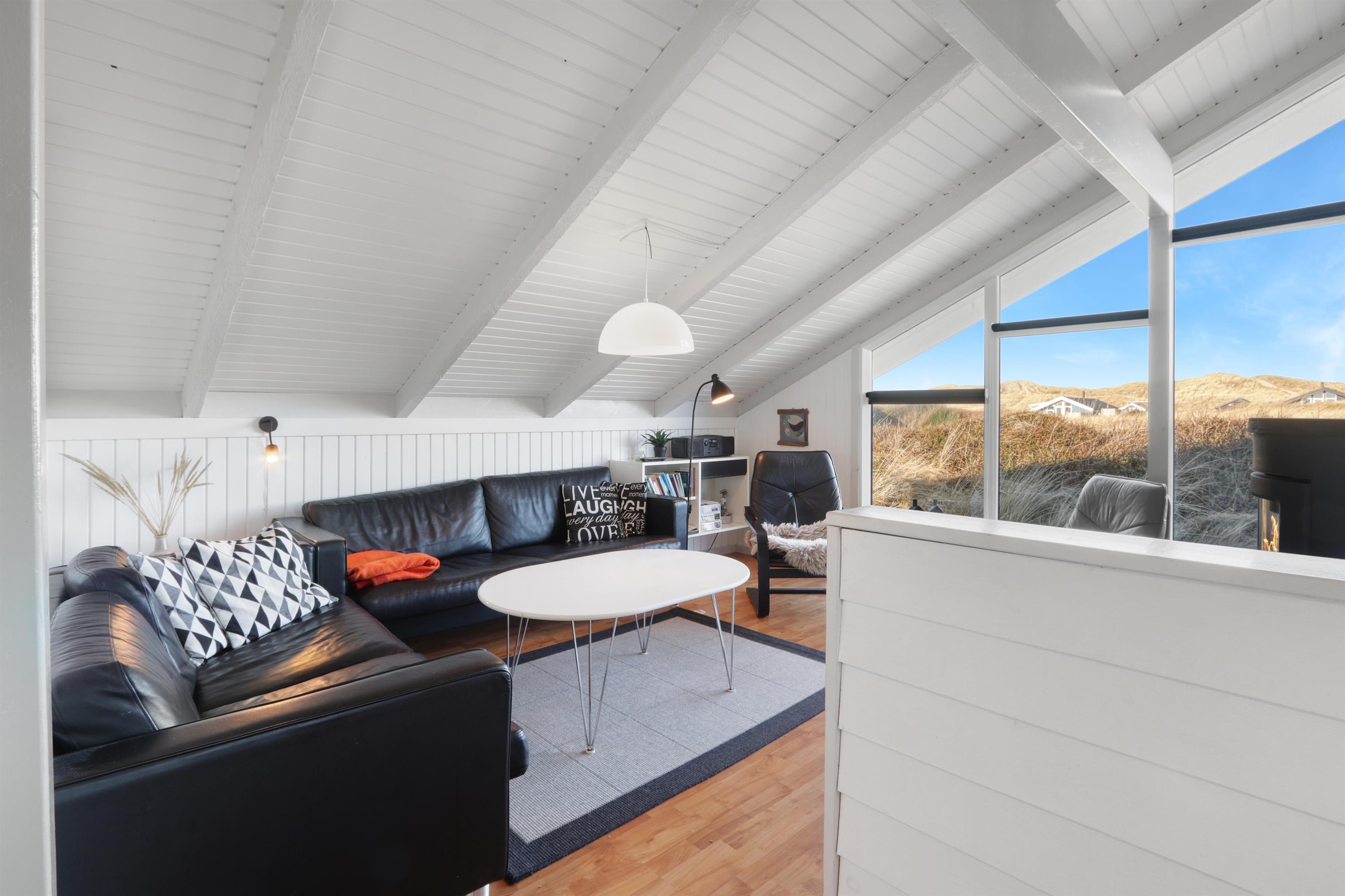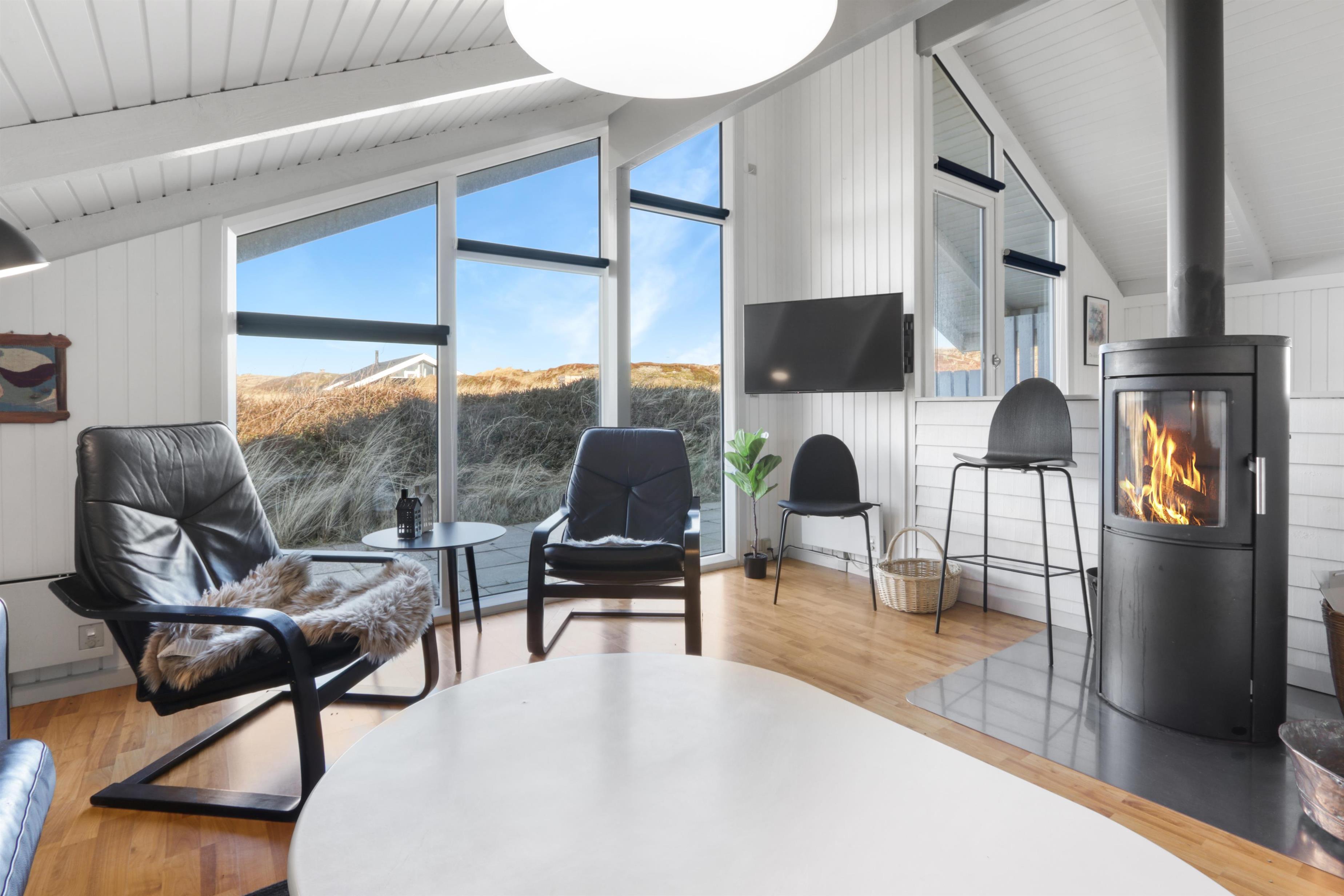 Stue og køkken er kombineret med større vinduespartier mod vest, så man kan følge vejrforandringen på himlen ude over Vesterhavet. Køkkenet er udstyret med glaskeramisk komfur, mikrobølgeovn, køle-/fryseskab og opvaskemaskine.