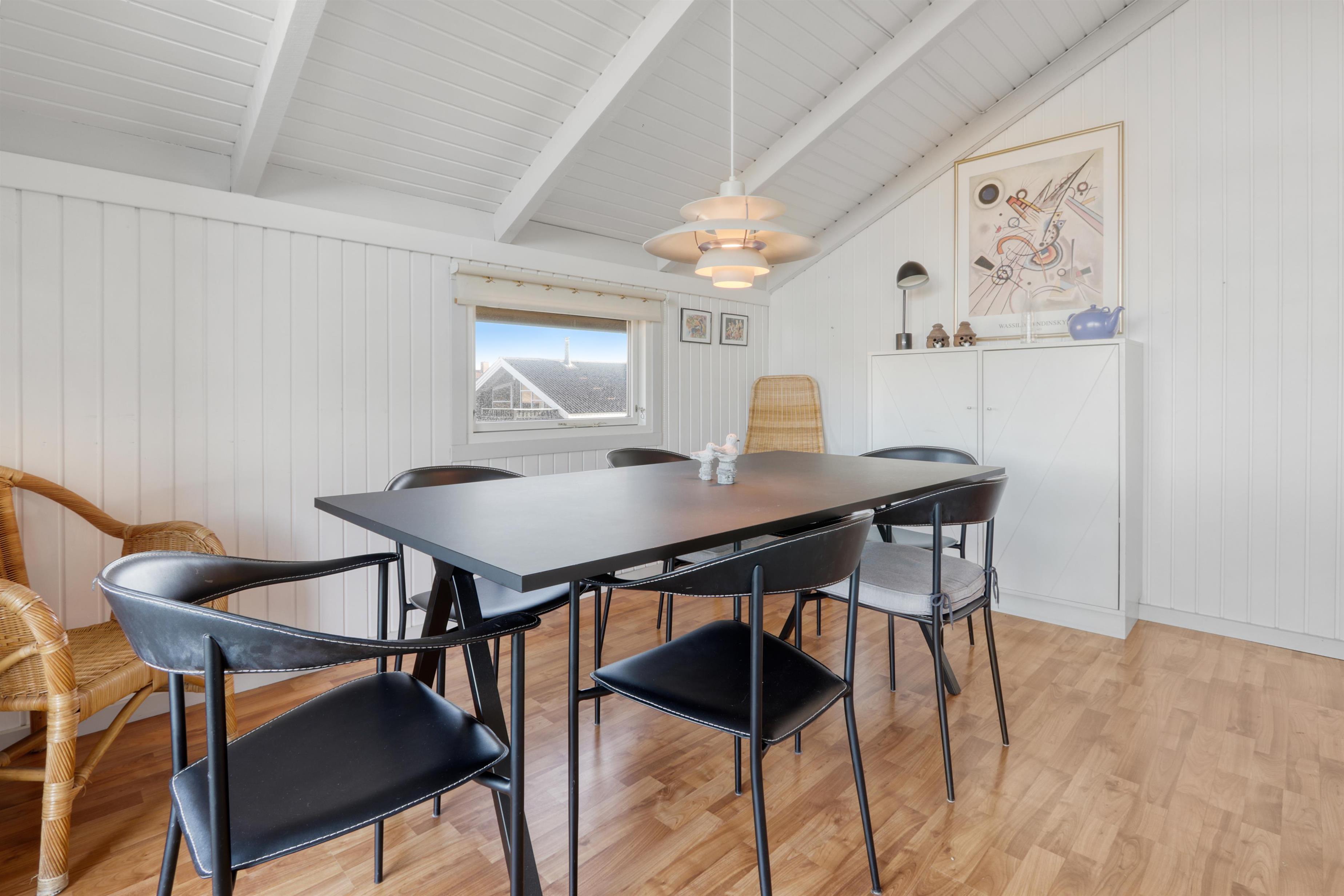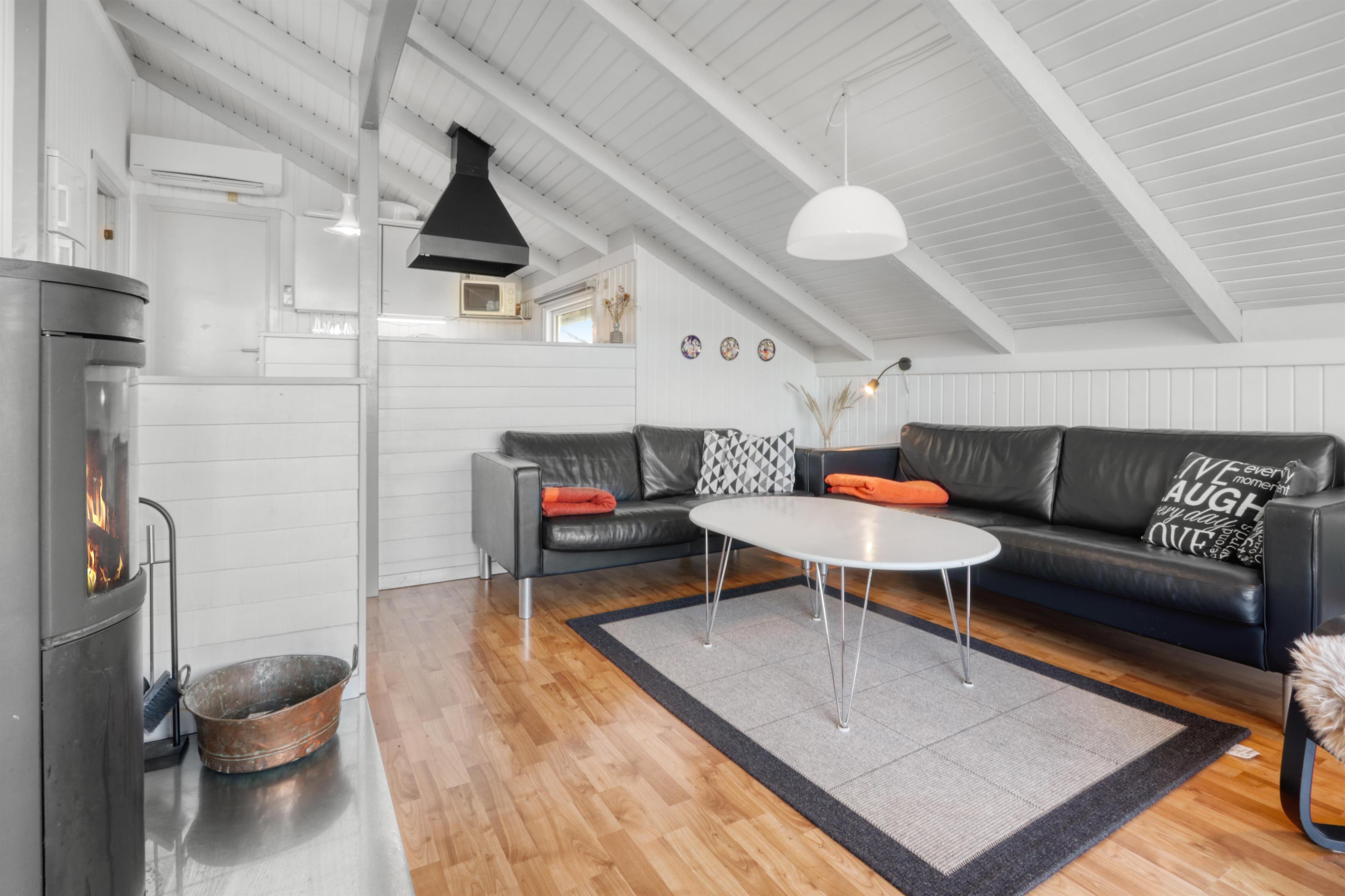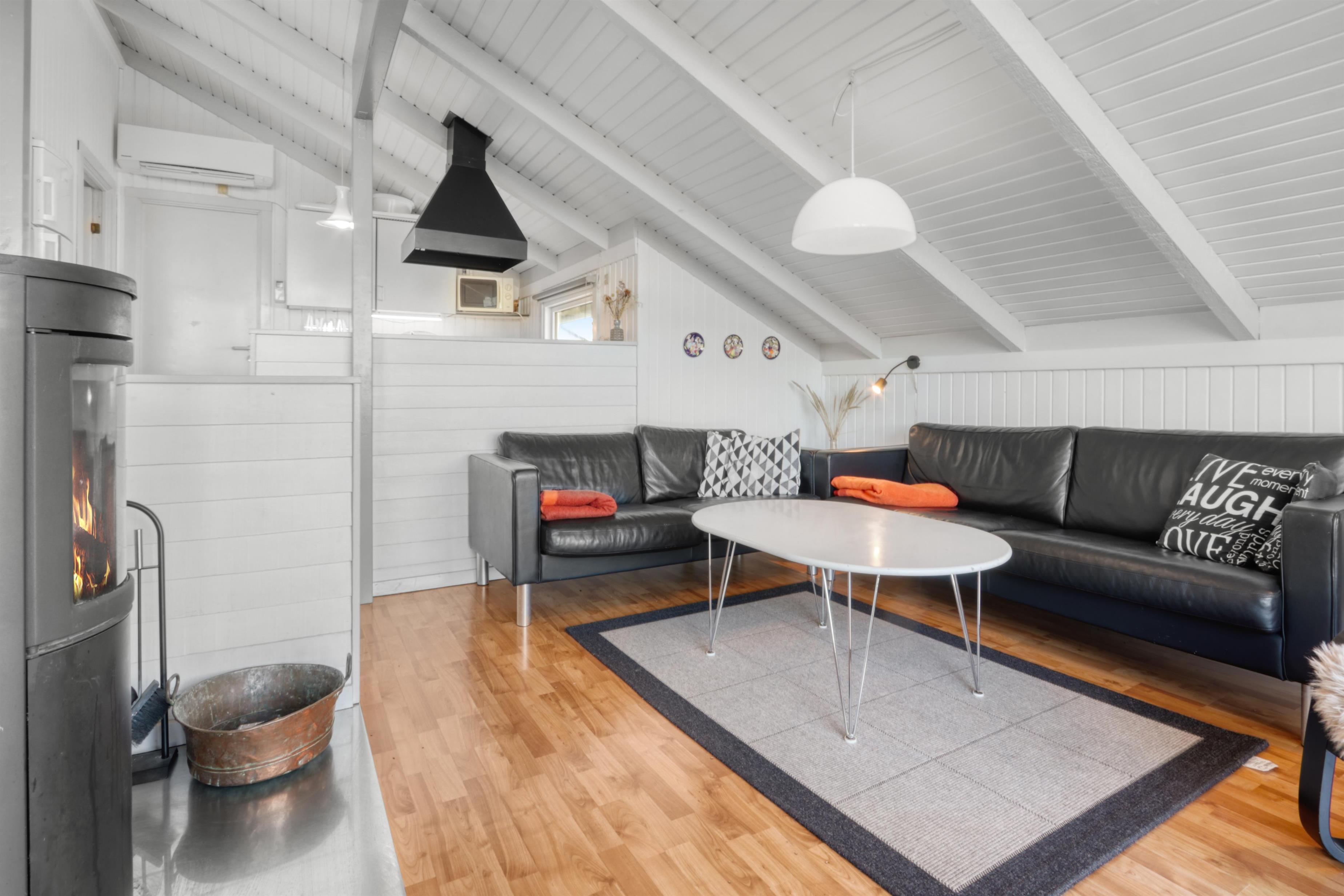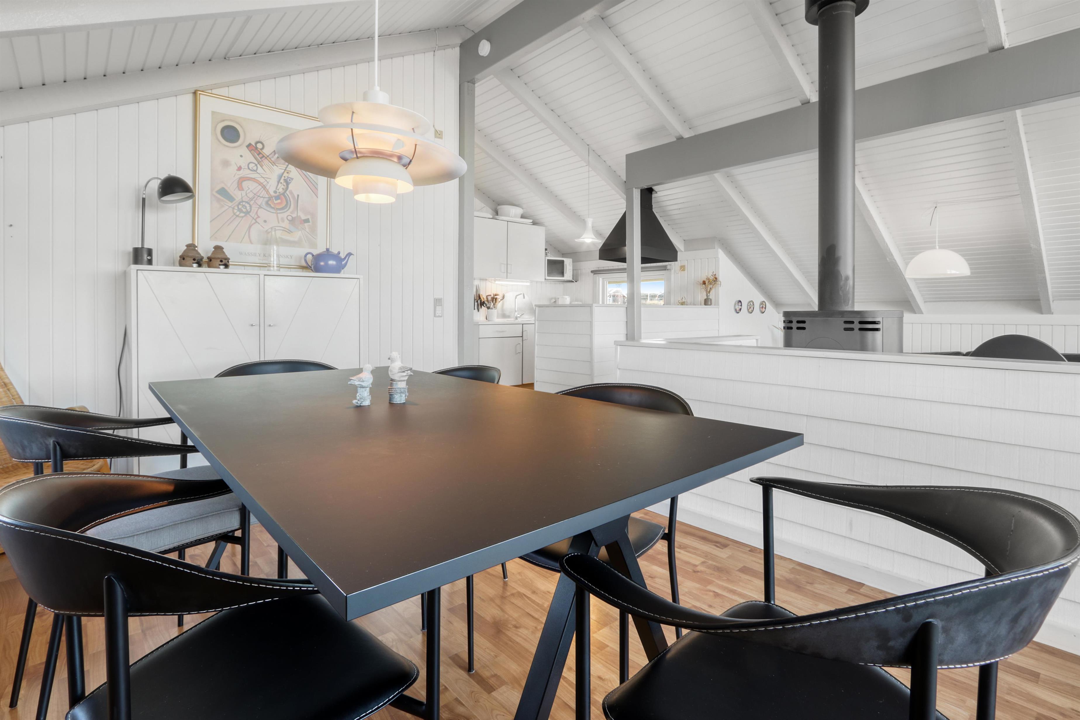 Stue og køkken er kombineret med større vinduespartier mod vest, så man kan følge vejrforandringen på himlen ude over Vesterhavet. Køkkenet er udstyret med glaskeramisk komfur, mikrobølgeovn, køle-/fryseskab og opvaskemaskine.