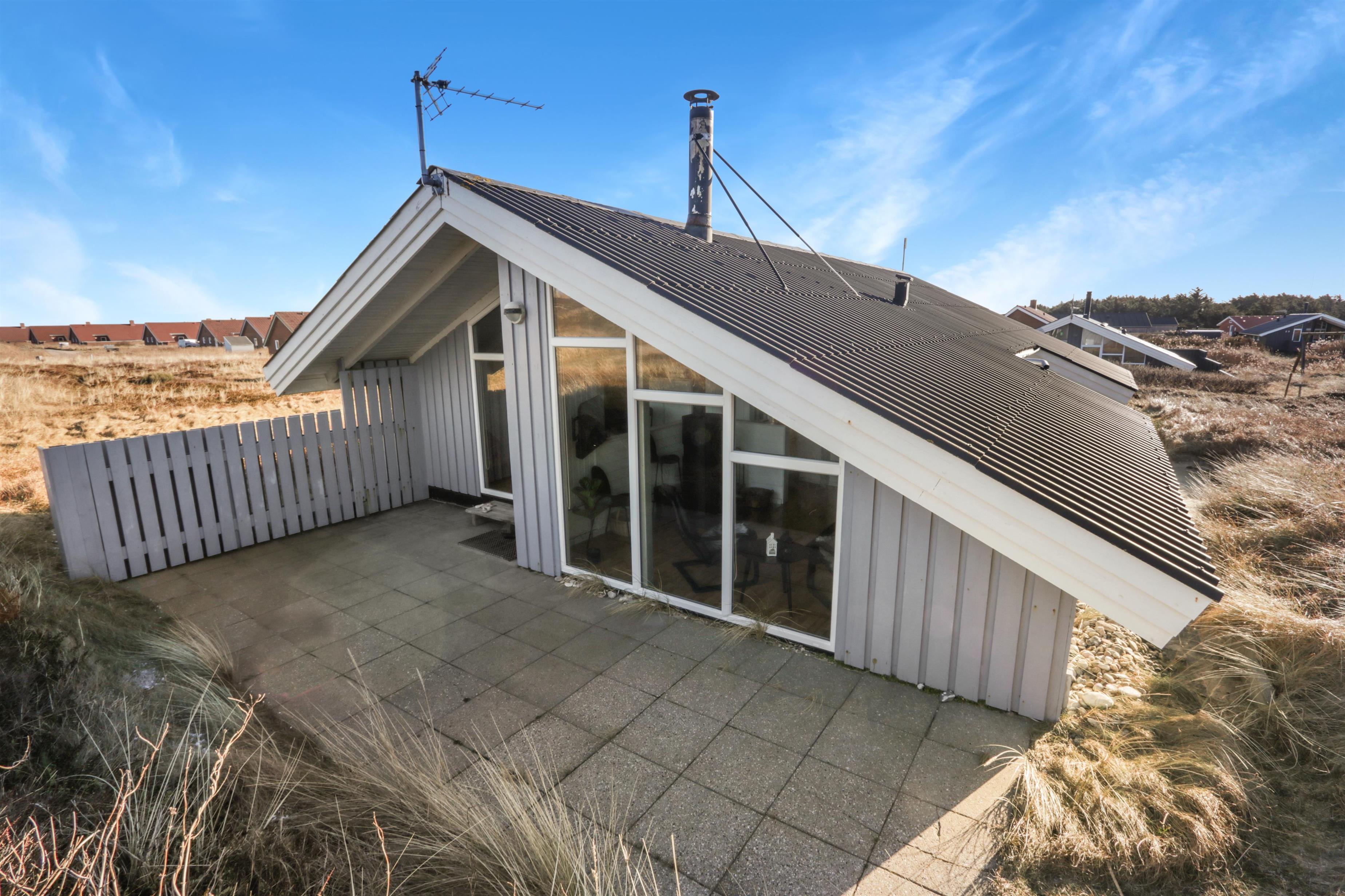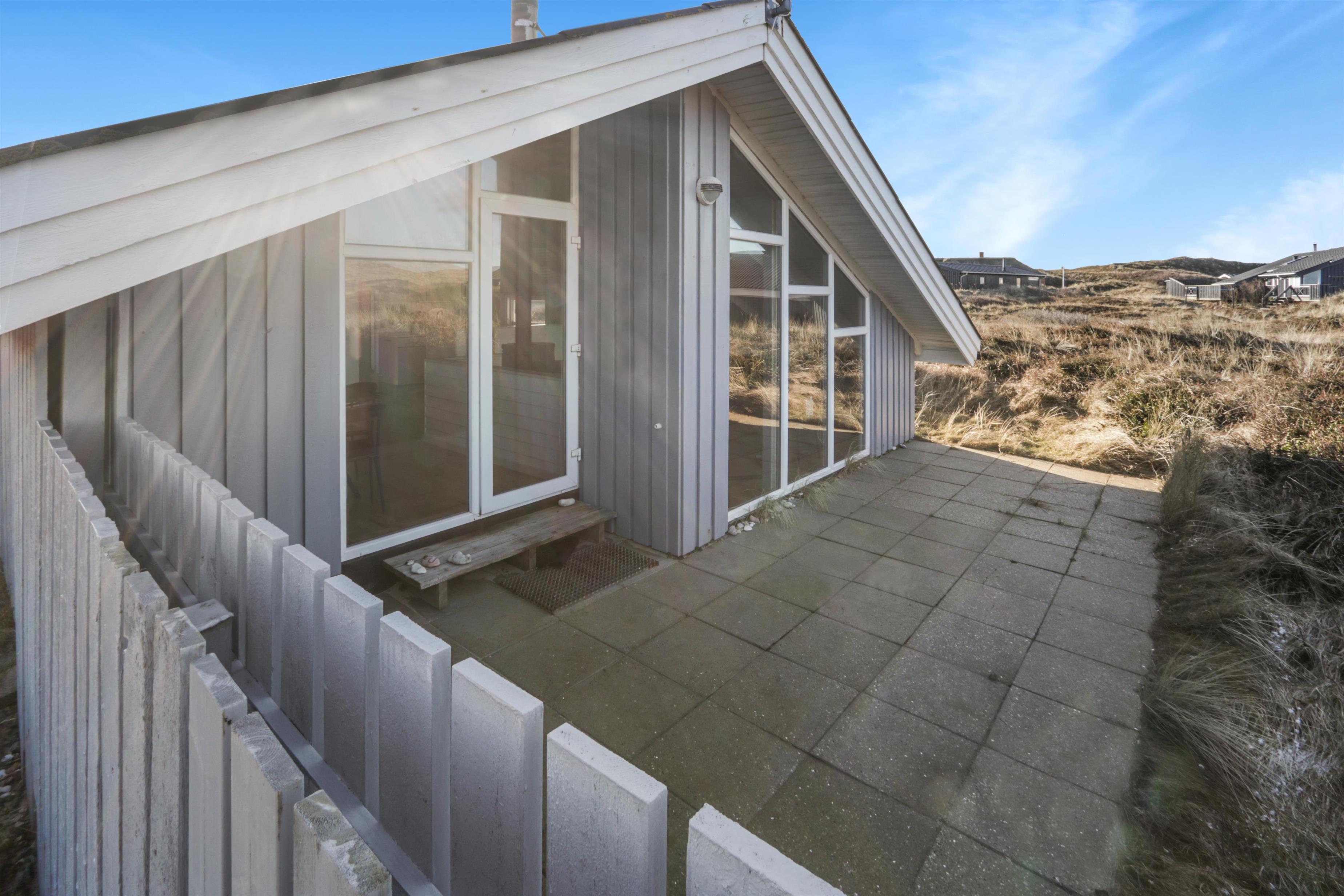Huset har en vestvendt terrasse som er overdækket. Her er havemøbler, grill og 2 solvogne, så man har gode muligheder for at nyde stilheden, lyden fra havet og fuglsang på forskelllige tider af dagen. Vesterhavet ligger kun 100 meter væk og her er adgang til lange spadsereture, badevand og for børnene er der uendelig plads til drageflyvning eller bygge sandslotte. Sommerhuset ligger 600 meter fra købmanden og torvet i Vejlby Klit og ønsker man et andet udvalg er der blot 5 km til Aldi og Brugsen i Harboøre. Skal man på udflugt anbefaler vi Thyborøn 18 km væk, hvor der er en hyggelig havn og flere attraktioner blandt andet Kystcenteret og Jyllandsakvariet. Lemvig som ligger 13 km væk har også en hyggelig havn, en lille legeplads, gode shoppingmuligheder og en skaterbane. Tag eventuelt den landskendte jernbane VLTJ til Lemvig eller Thyborøn - Vejlby Klit har nemlig sit helt eget trinbræt der hedder Viktoria Street Station.