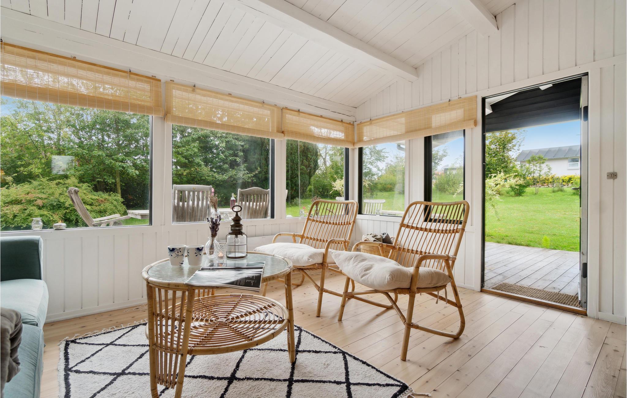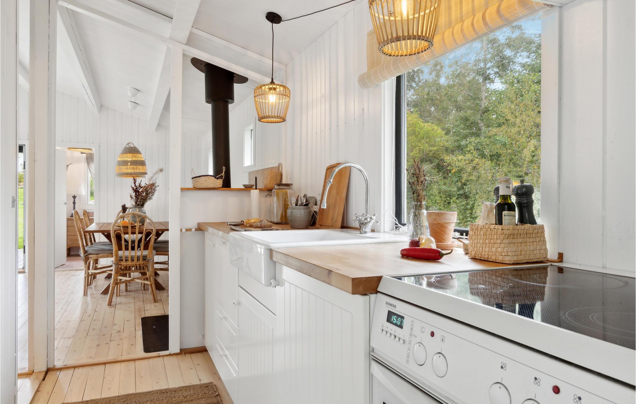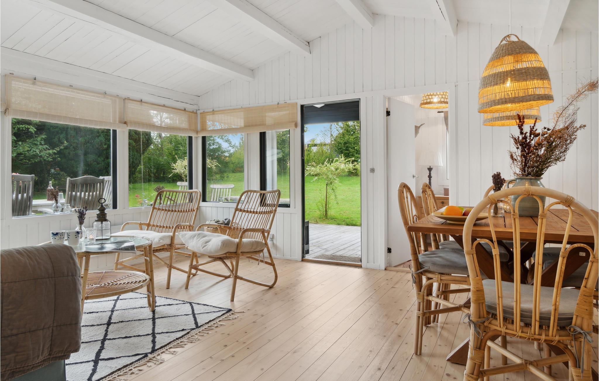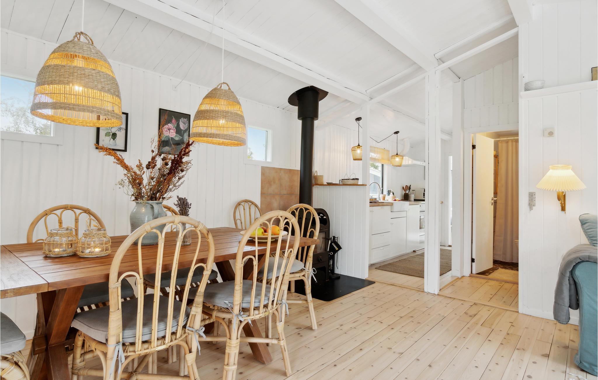 Velkommen til dette hyggelige feriehus med en idyllisk beliggenhed, ikke mange skridt fra fjorden. De lyse værelser får deres charme fra kombinationen af bambus, hvid, lyst træ og det smukke dagslys fra de store vinduer. Gennem vinduerne i opholdsstuen vil I føle jer meget tæt på naturen, uanset hvad I foretager jer. Hold hyggelige spilleaftener ved det store spisebord og skab en særlig hyggelig stemning med ild i brændeovnen. Slå jer ned på terrassen og nyd solen og udsigten over den velplejede naturgrund, mens jeres børn leger lystigt. Her kan I afslutte en dejlig feriedag med et lækkert måltid fra grillen. Gå en tur til fjorden, hvor I kan bade og fiske. Her finder I også en badebro.