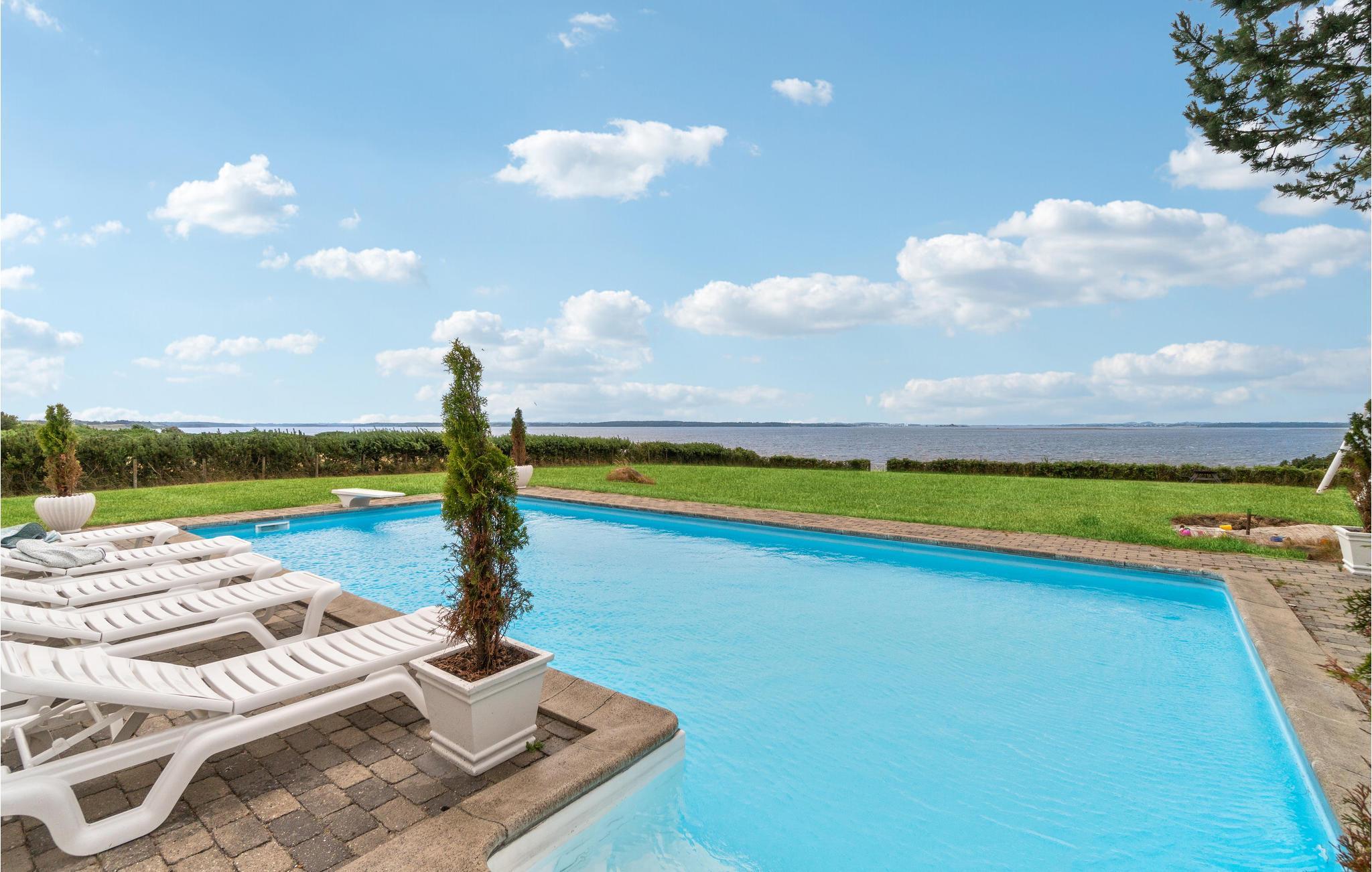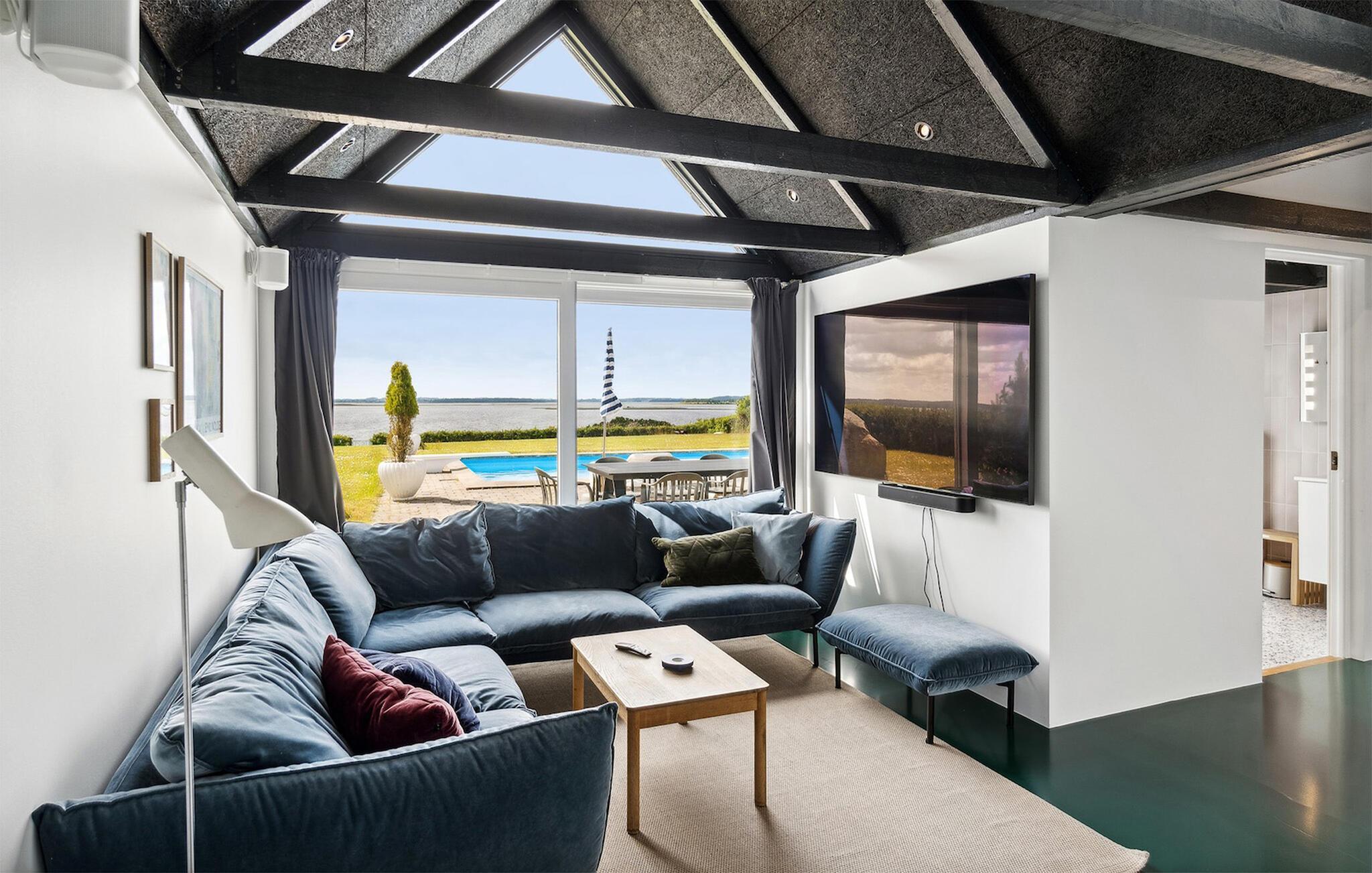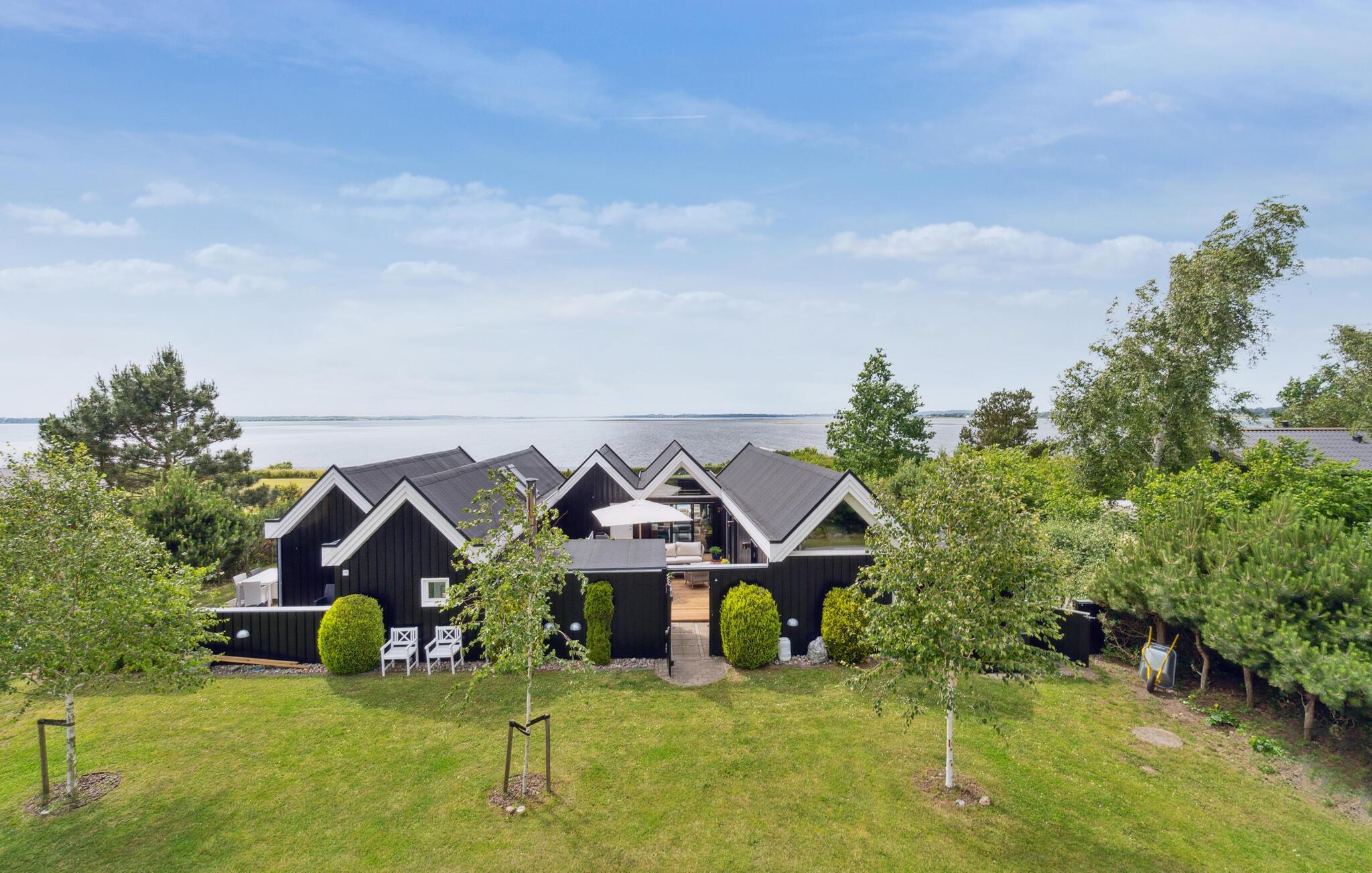 Glæd jer til en skøn ferie i dette lækre feriehus med sauna og udendørs pool, lige ud til fjorden.