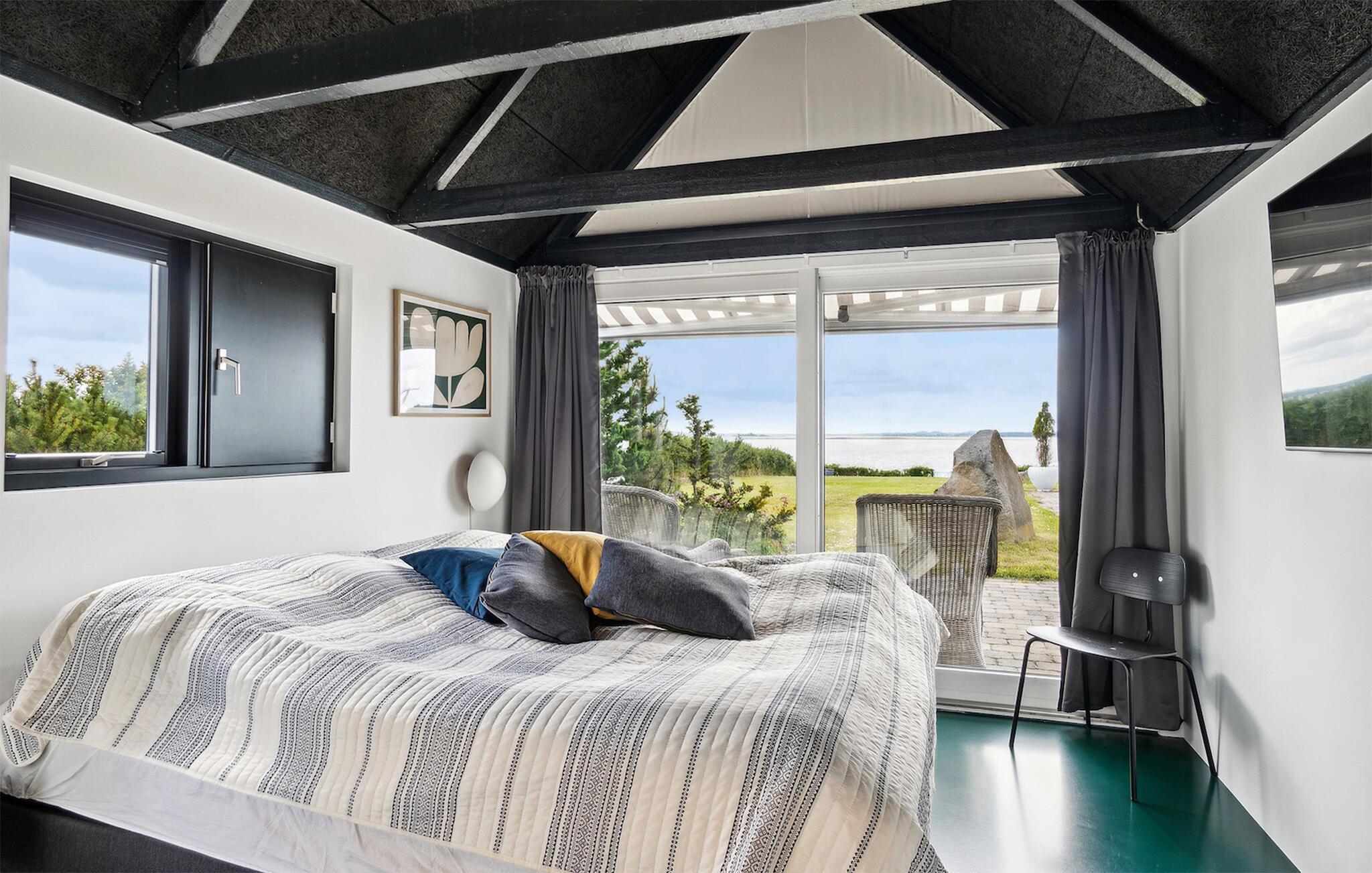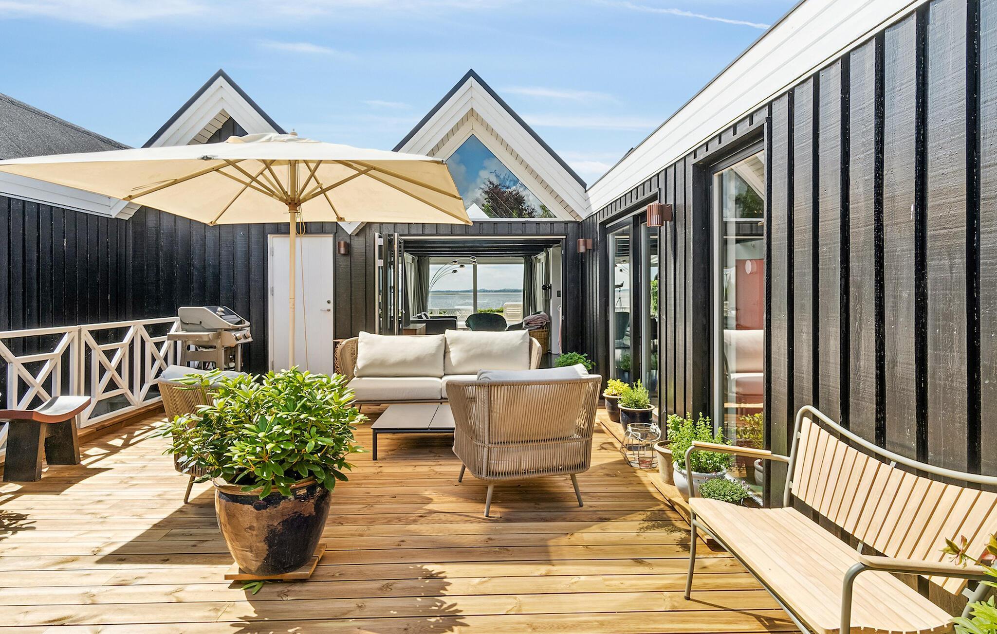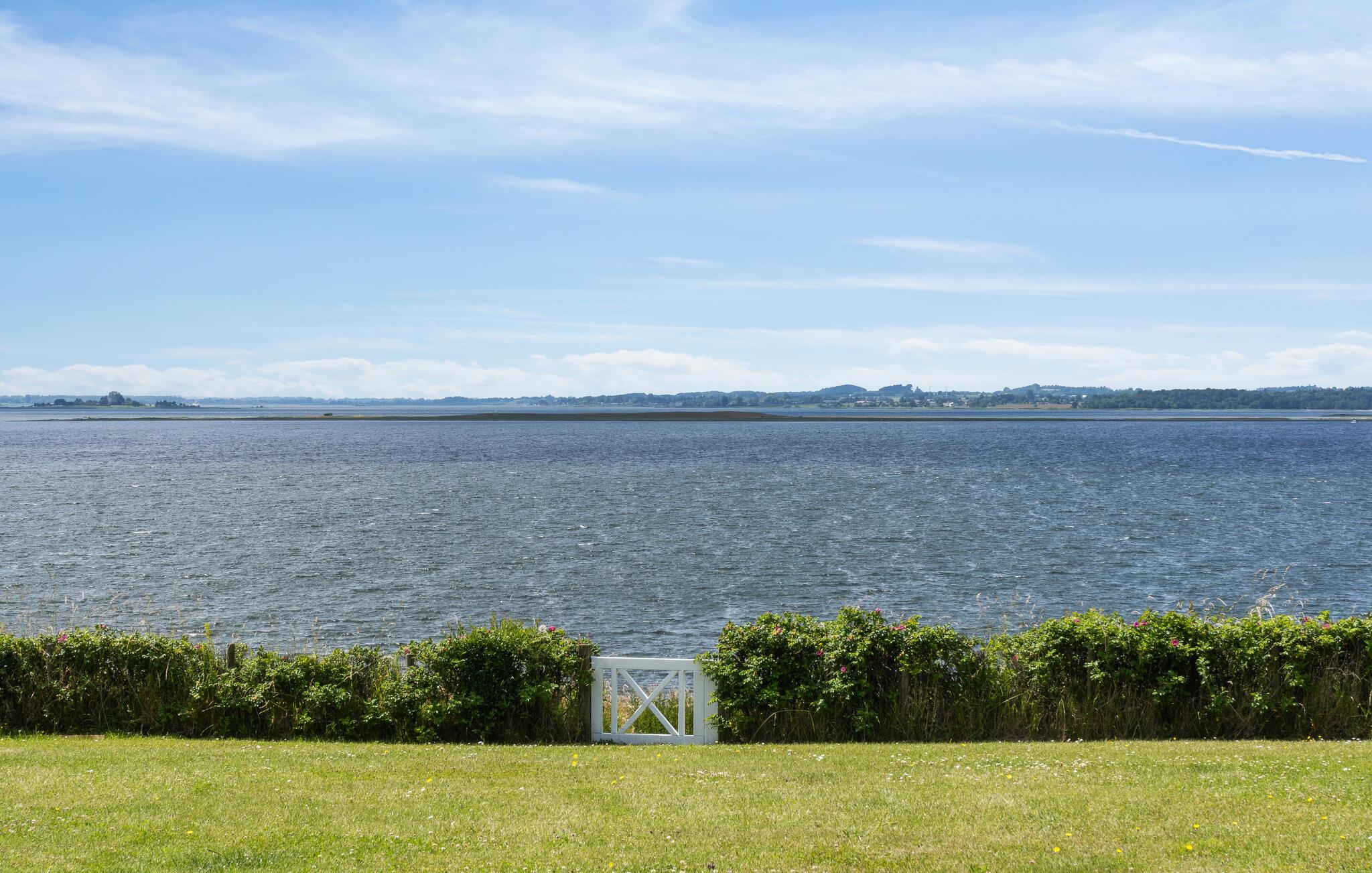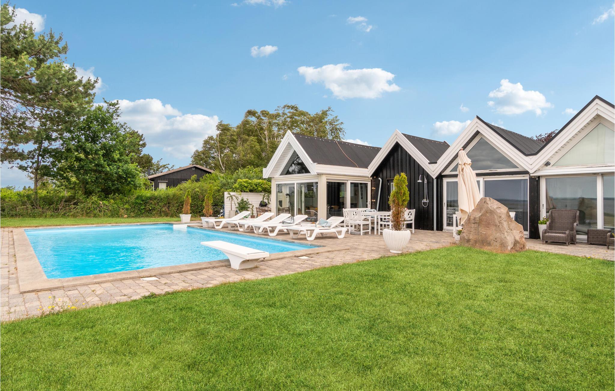 Glæd jer til en skøn ferie i dette lækre feriehus med sauna og udendørs pool, lige ud til fjorden.