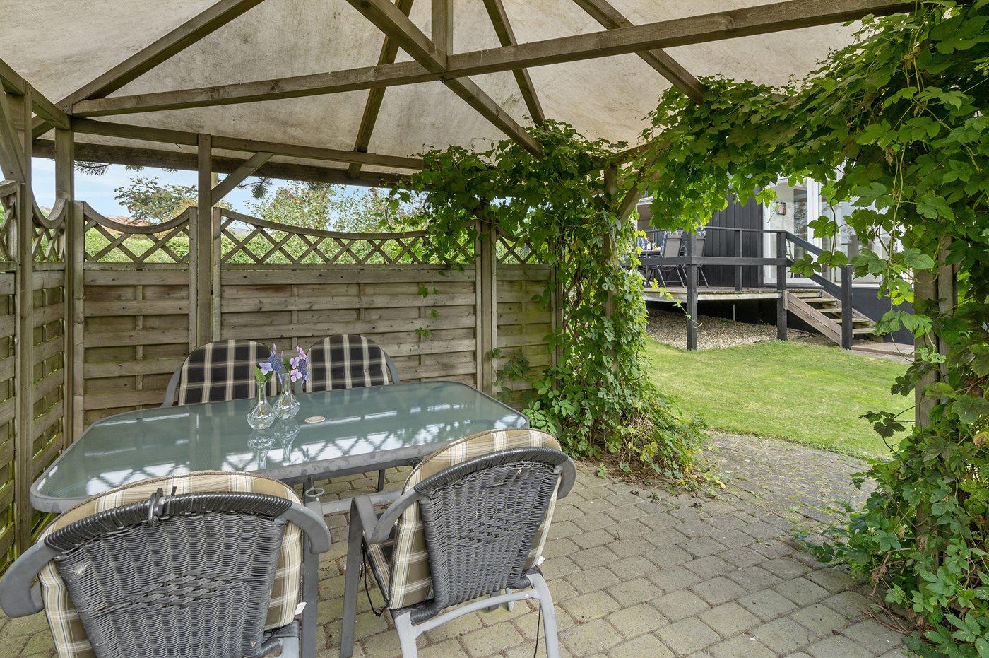 Ferieboligen er beliggende på en 700 m² stor havegrund. Grunden er indhegnet. Der er 250 m til havet. Nærmeste forretning er beliggende i en afstand af 2000 m. Til ferieboligen hører 30 m² terrasseareal. Ligeledes er der adgang til udestue. Grill til rådighed. Parkering ved ferieboligen.