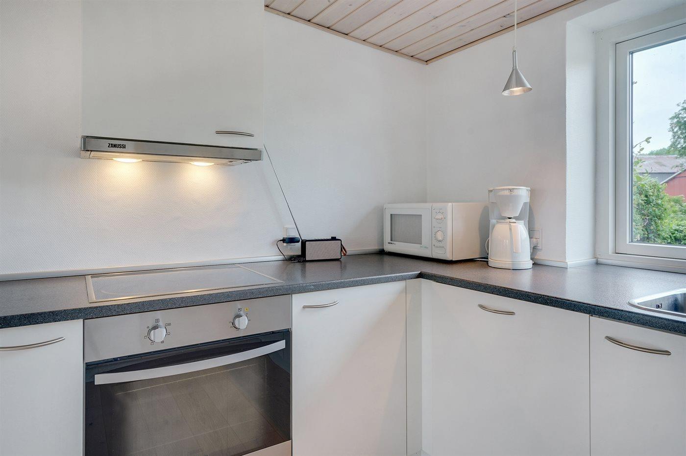 Køkkenet er udstyret med 1 køleskab. Der er 4 keramiske kogeplader, varmluftovn, mikrobølgeovn samt opvaskemaskine.
