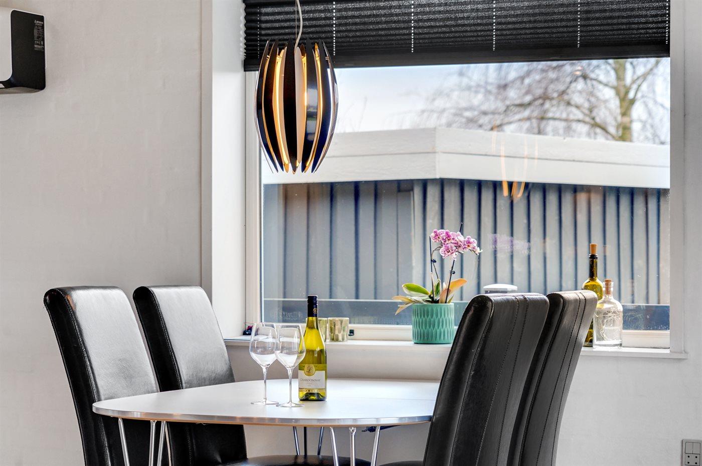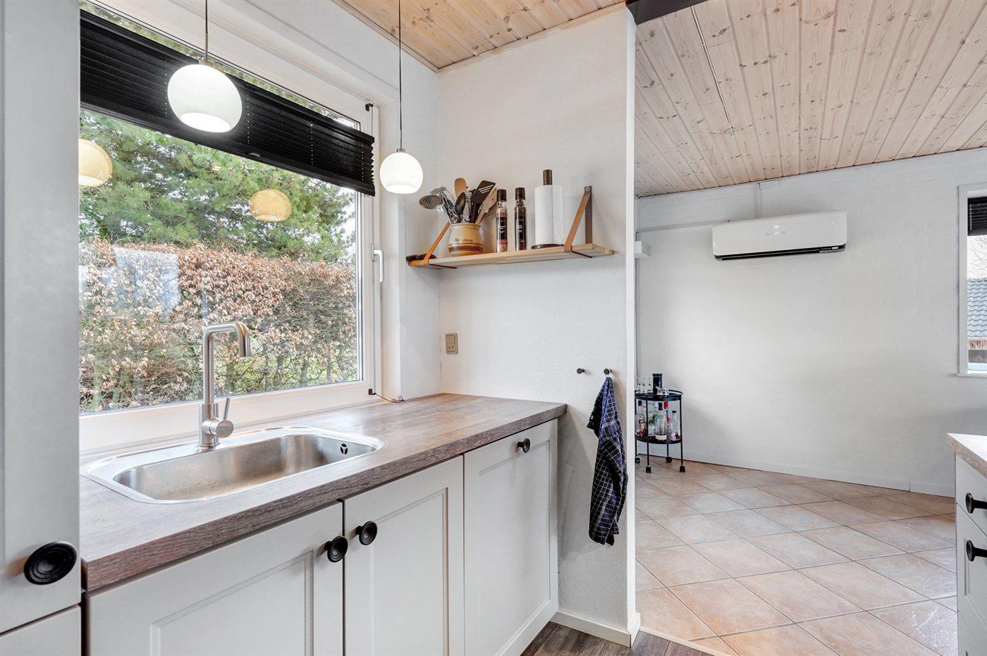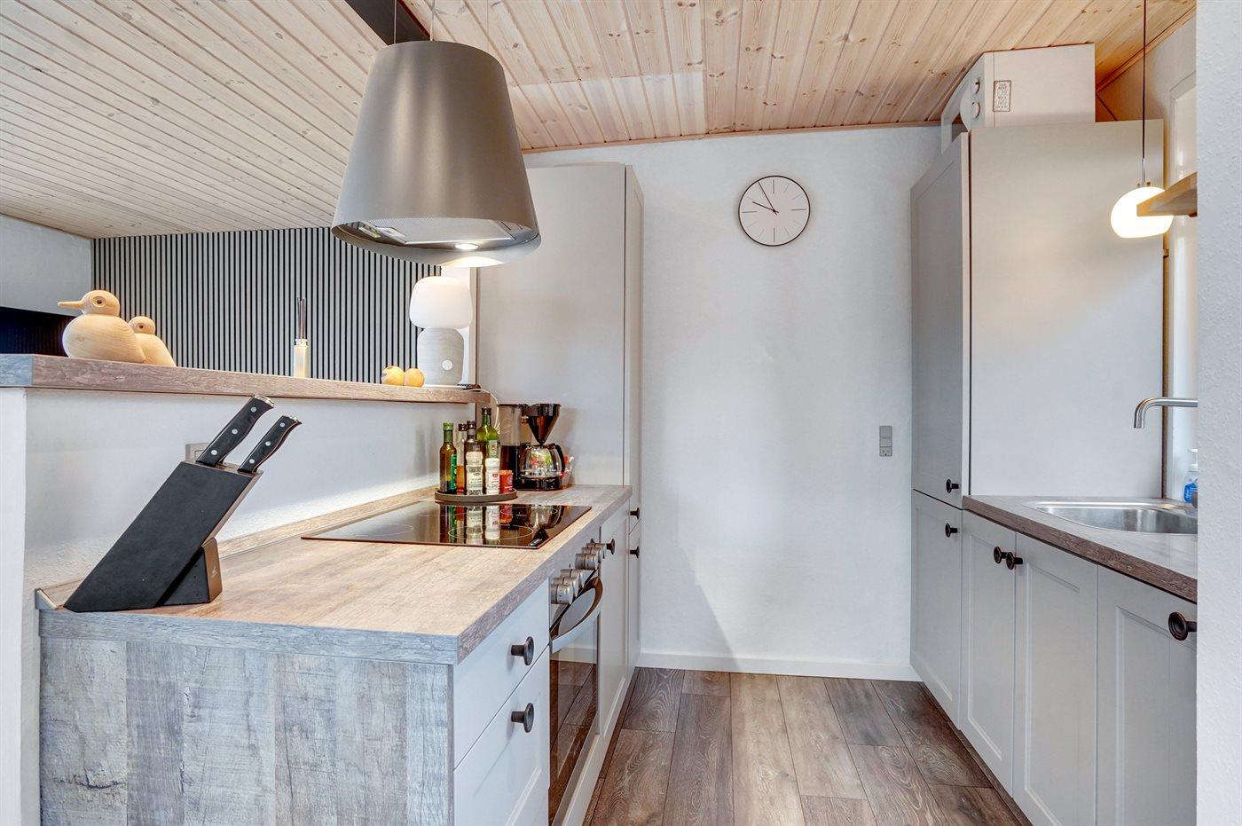 Køkkenet er udstyret med 1 køleskab. Der er 4 keramiske kogeplader, varmluftovn, mikrobølgeovn samt opvaskemaskine.