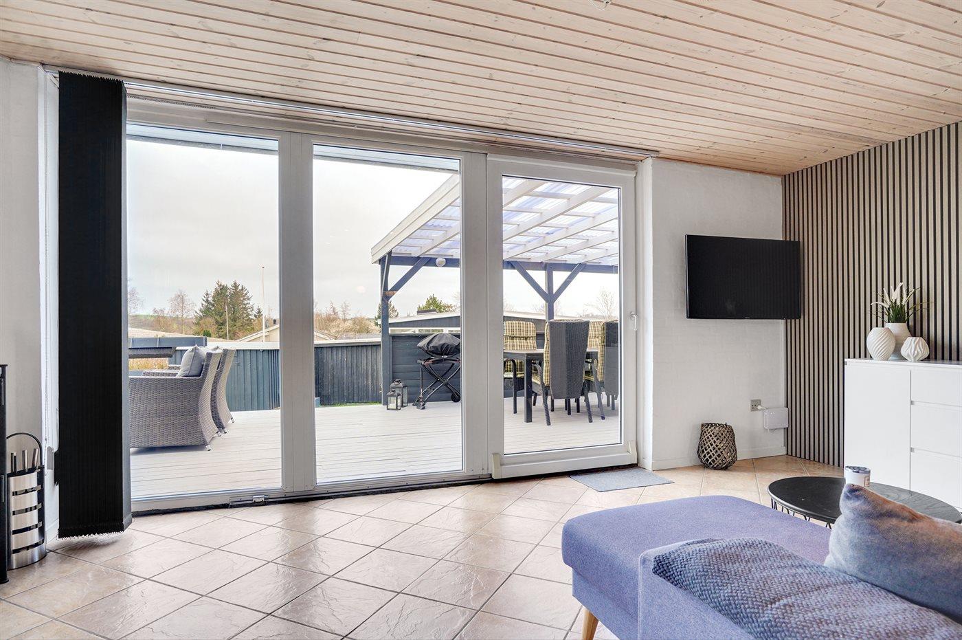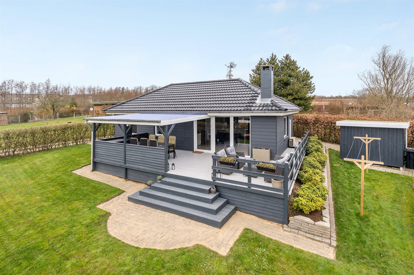 Hyggeligt sommerhus nær sandstrand med stor terrasse og havudsigt, renoveret i 2021.