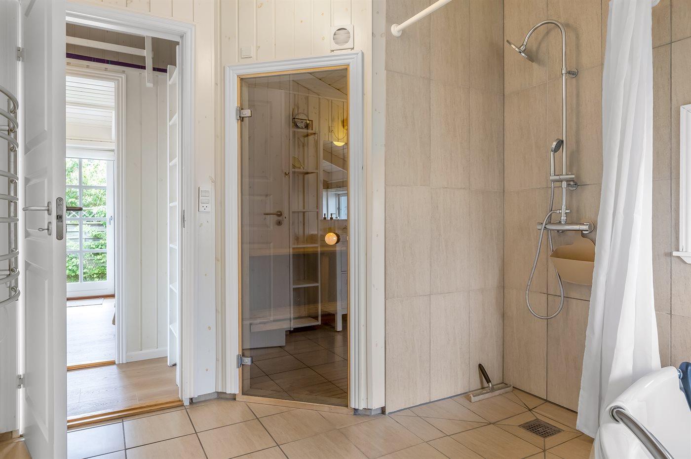 Der er 2 badeværelser med bruseniche og 2 toiletter. Der er gulvvarme på 2 badeværelser. I saunaen er der mulighed for afslapning.