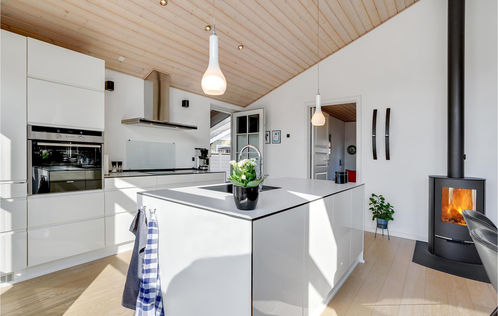 Her vil I straks føle jer hjemme. Det store opholdsrum, der kombinerer køkken, spisestue og opholdsstue, er det naturlige samlingssted for jeres familie. Der kommer meget lys ind i det store rum gennem de store vinduespartier, hvilket bidrager til den særligt behagelige atmosfære. Om aftenen kan I nyde en knitrende åben ild og putte jer sammen i sofaen og se en spændende film. Den skønne terrasse indbyder til fælles grillmiddage. Bliver det lidt køligere eller hvis vejret ikke spiller med, kan I trække jer tilbage til udestuen med komfortable loungemøbler.