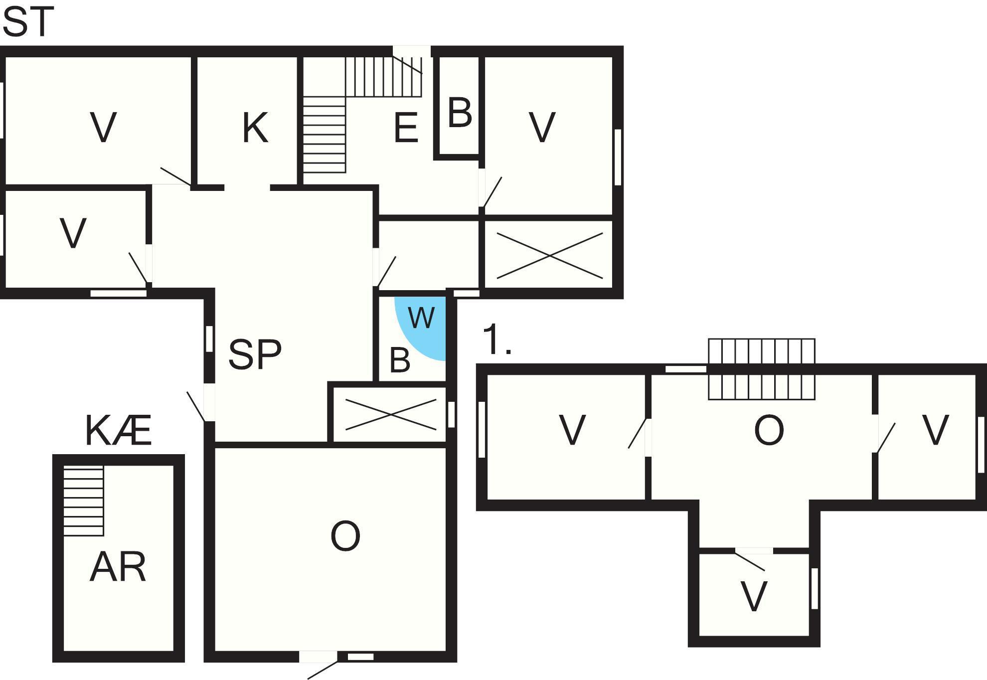 På 1. salen finder I sommerhusets anden opholdsstue og 3 soverum. 2 af soverummene er med dobbeltsenge, mens det sidste soverum er med 2 enkeltsenge og en lille hule, som hurtigt sætter liv i børnenes fantasi.
