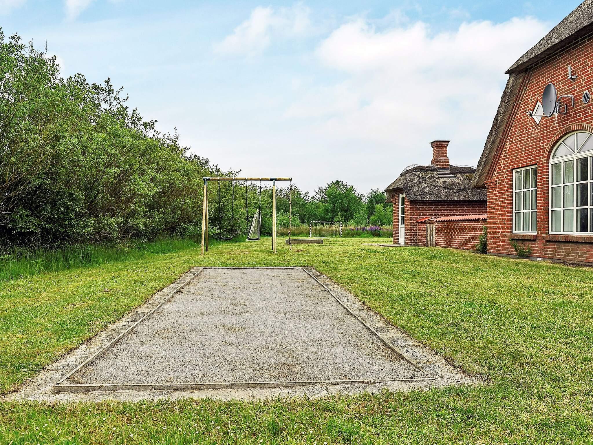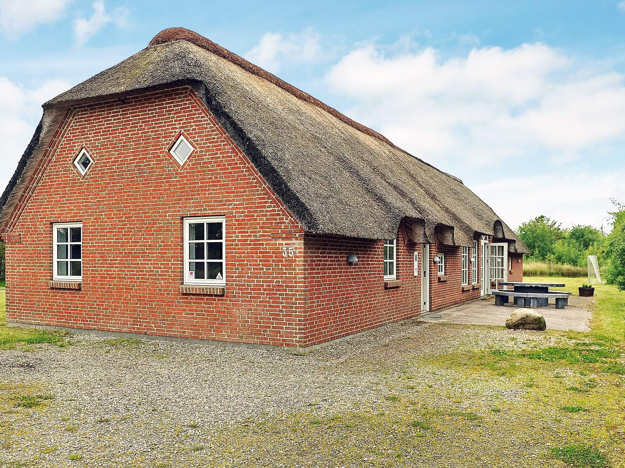 Roligt beliggende i Vester Husby finder I dette store, stråtækte sommerhus til 18 personer. Sommerhuset har både egen swimmingpool, infrarød sauna og spabad med plads til 5 personer.