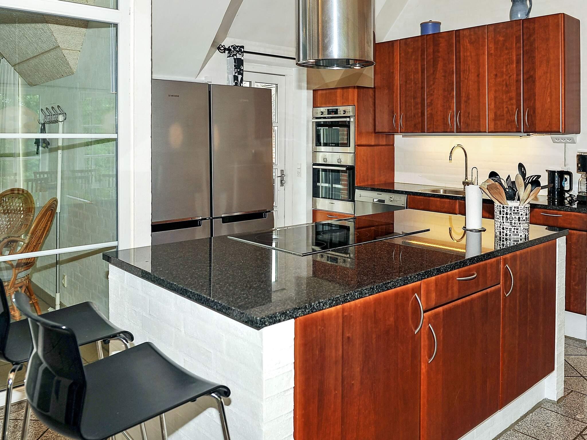 Sommerhuset er lyst indrettet med mange vinduespartier, som giver et godt lysindfald. Det veludstyrede køkken ligger i åben forbindelse med den store, kombinerede opholds- og spisestue, som er sommerhusets hjerterum. Herfra er der også vinduer og indgang til sommerhusets store poolrum.