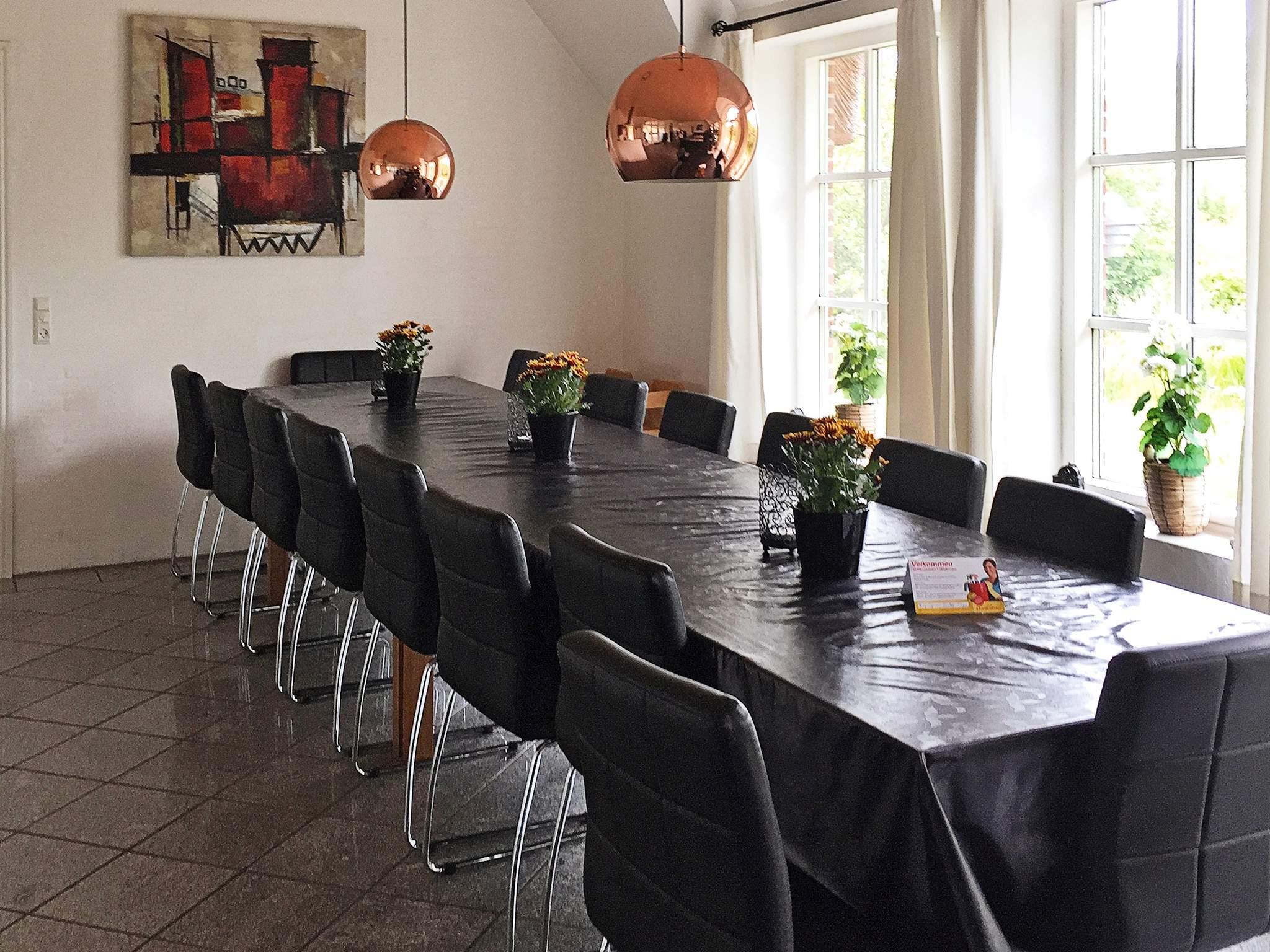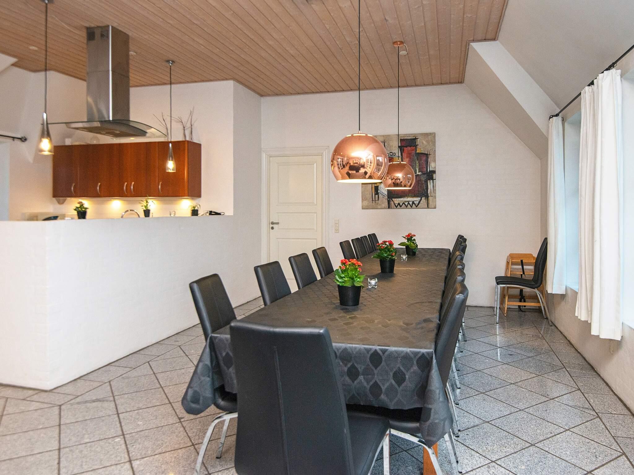 I det store køkken/alrum er der god plads til hyggeligt samvær enten ved det store langbord eller i sofaen.
