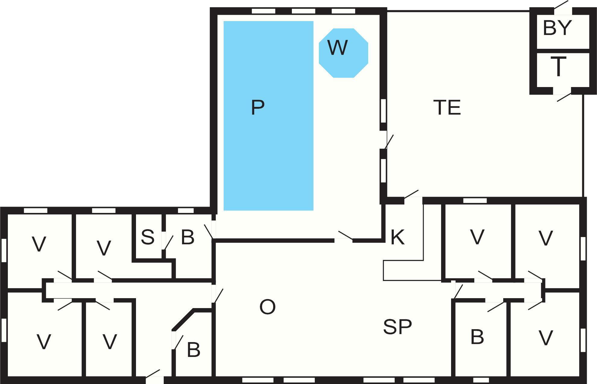 7 Soveværelser: (1DS)+(1DS)+(1DS)+(1DS)+(2S)+(4K)+(4K)