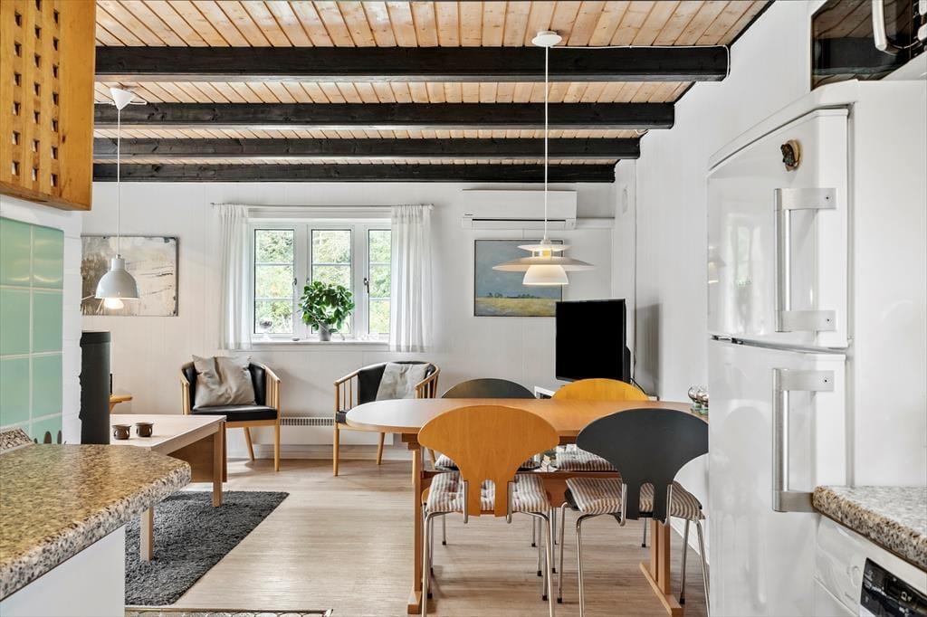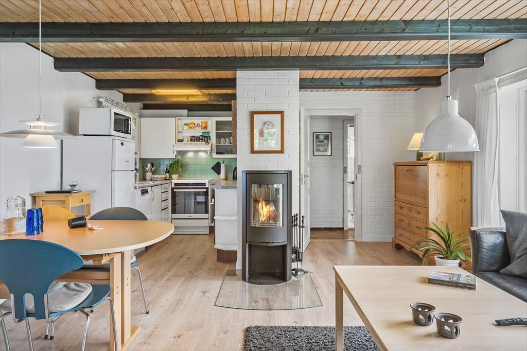 Velkommen ind i et lyst og indbydende feriehus, hvor den åbne sammenhæng mellem stue, spisestue og køkken gør det nemt at være sammen – uanset om I laver mad, spiller spil eller bare slapper af. Her kan I sætte jer godt til rette i sofaen med en god bog eller samles rundt om spisebordet over et dejligt måltid med friske lokale råvarer mens snakken falder på dagens begivenheder. I får rig mulighed for at nyde hinandens selskab mens brændeovnen knitrer og spreder den helt rette feriestemning.