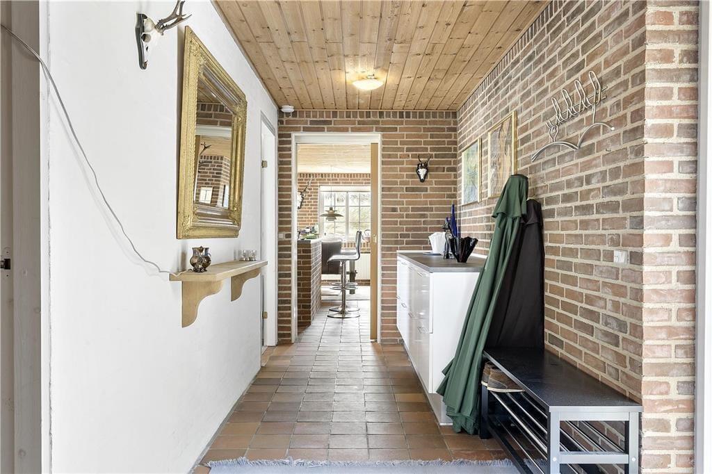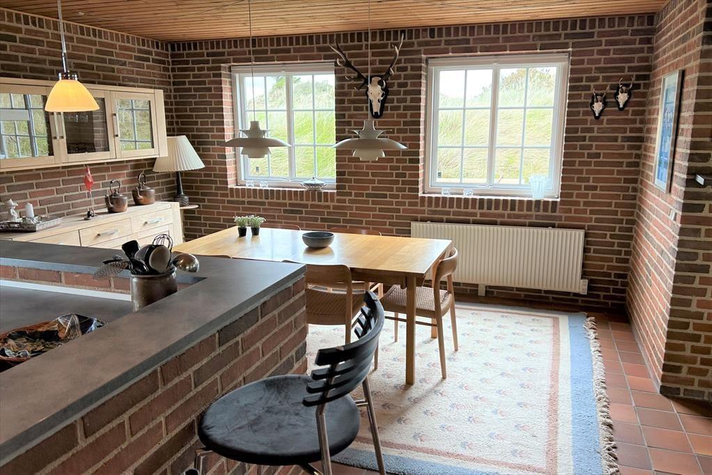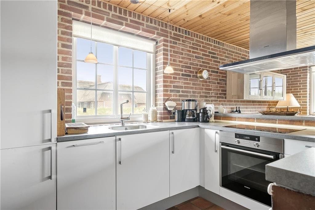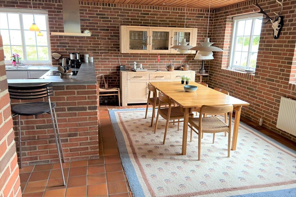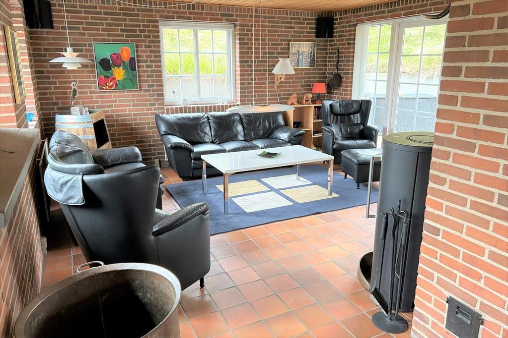 I dette hus bliver I mødt af rå murstensvægge og rødlige klinker som skaber en rummelig atmosfære og med køkkenet der ligger i åben forbindelse med stue og spisestue er der rig mulighed for dejlige stunder for hele familien, her kan nogle stå at lave mad, mens andre drikker en kold sodavand på en af barstolene ved køkkenet, på den måde kan I socialisere selvom I ikke laver det samme. Efter en travl dag med at udforske området og de forskellige aktiviteter rundt omkring, kan I dase i de hyggelige lædermøbler foran brændeovnen, eller nup et spil kort og en kold sodavand inden i kryber til køjs.