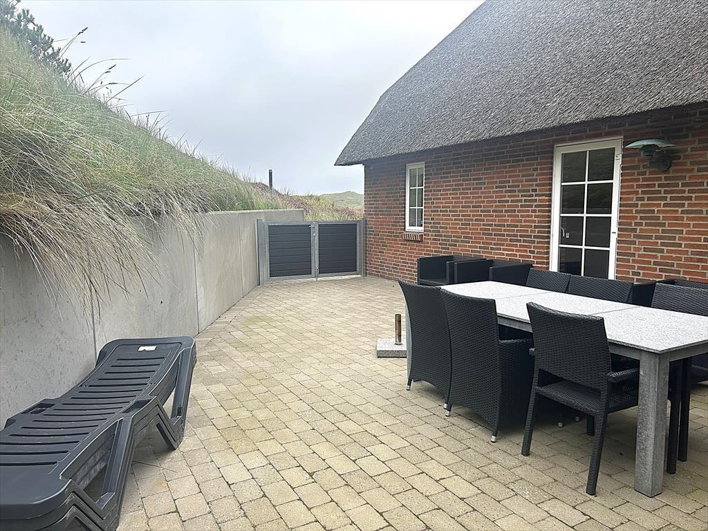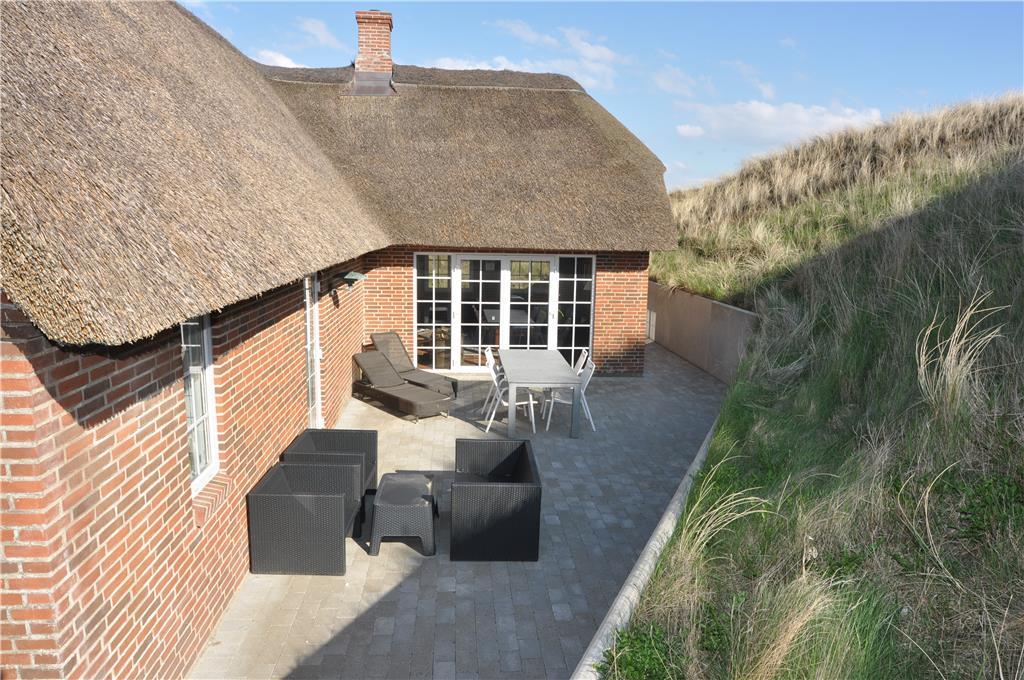 Nyd aftensmaden lavet på grillen på en af de to dejlige terrasser der løber rundt om huset, begge terrasser ligger godt i læ af klitterne som omkranser hele grunden, grunden er derfor også meget kuperet. Sæt jer i de skønne havemøbler på den vestvendte terrasse og nyd aftensolens sidste varme stråler, imens solen langsomt går ned i det fjerne og hør havets beroligende brusen der kommer fra den anden side af klitterne og fuglene der stille synger natten ind. Nyd en god kop morgenkaffe på den østvendte terrasse og se solen stige op på himlen.