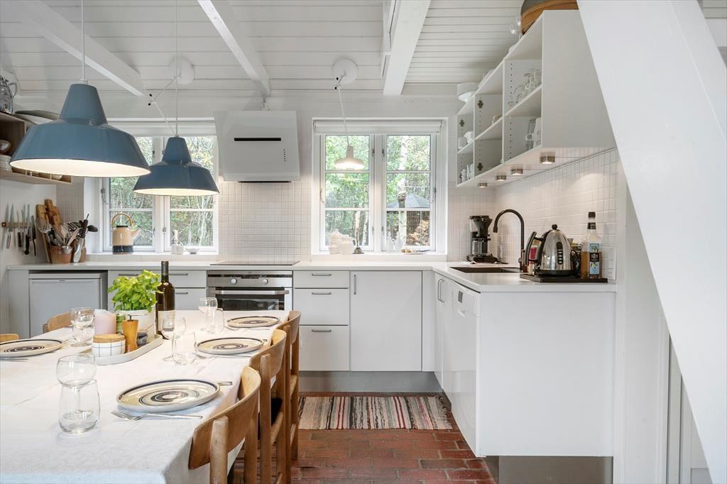 Lav et lækkert måltid sammen i dette store og rummelige køkken, her kan I nyde hinandens samvær i utallige timer, enten i køkkenet mens I laver mad eller omkring det flotte og store spisebord hvor I kan spille brætspil eller lade samtalen forsætte længe efter maden er indtaget. Huset har et vidunderligt lys indfald gennem de store vinduer i hele huset og med loft til kip giver det en fantastisk herlig rummelighed, her kan I nyde hvordan hele rummet skifter farve i takt med at solen går ned i det fjerne, eller smid jer foran brændeovnen i den yderst hyggelige og lyse stue mens I lader varmen fra brændeovnen indhylle jer.