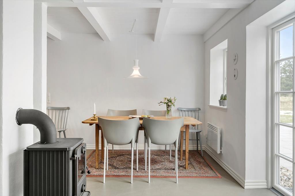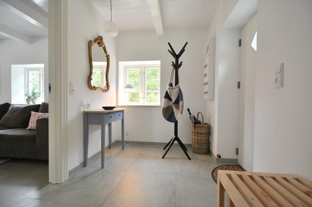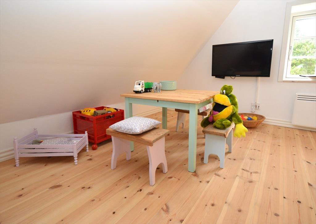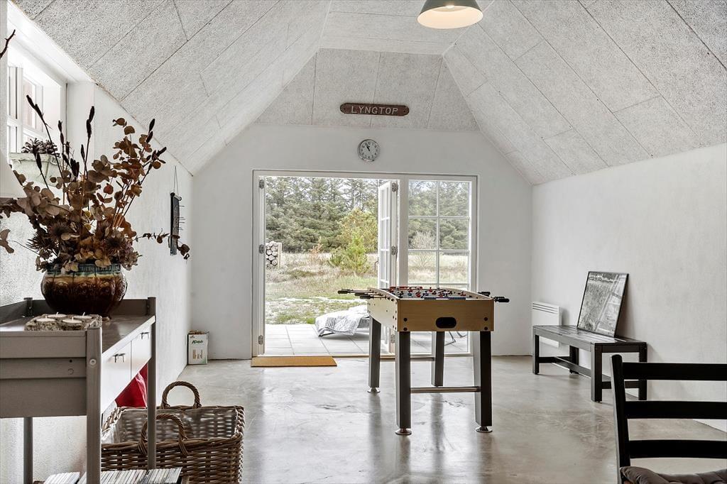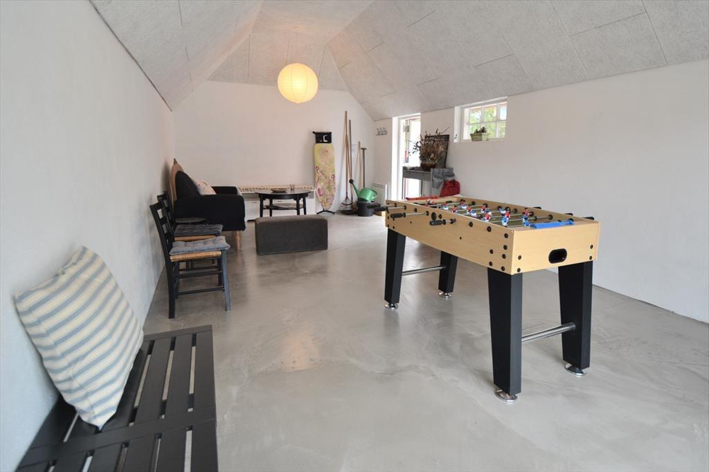 Indretningen er særdeles hyggeligt og meget smagfuldt, med ”New-Yorker” polerede betongulve i alle rum, på nær badeværelse og entre, som har klinkegulve. Lyse og flotte rum overalt. Hvidmalede lofter med store flotte bjælker. Der er gulvvarme i entre og badeværelse. Alle værelser er indrettet super charmerende, og i individuel stil. Stuen er flot indrettet, og har løse tæpper på gulvene. Køkkenet er særdeles funktionelt, nyt, og meget veludstyret. Indretningen af 1. sal, med dobbeltværelse, og plads til børnebord og lille TV giver et super charmerende miljø. ANNEX – MULTIRUM med bordfodbold og dart. Aktivitetsrummet har spændende vinduesparti i gavlen, her kan du også sætte din cykel, surfbræt, barnevogn m.v. ind.