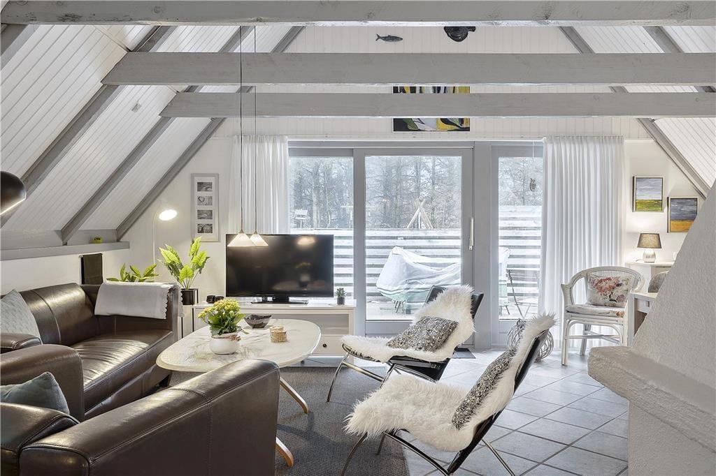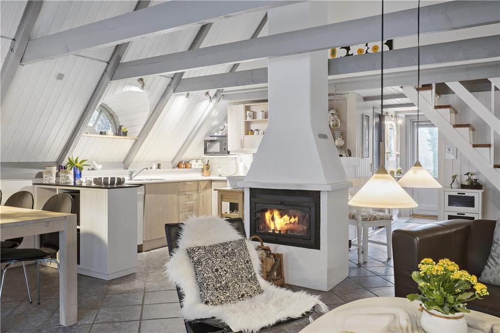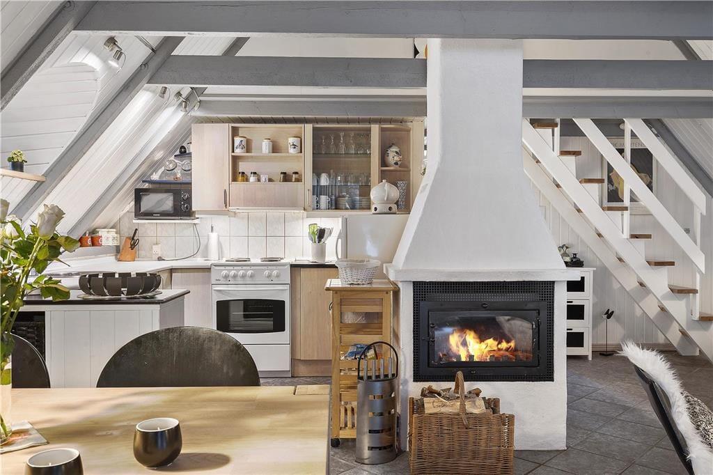 Ungerne kan smide sig i den dejlige sofagruppe og nyde en god film, imens brændeovnen knitrer og forældrene laver mad i det store køkken som ligger i åben forbindelse med stuen, her kan I stadigvæk være sammen selvom I laver forskellige ting, så lad snakken kører lystigt og grinene flyve gennem luften, inden I sætter jer omkring spisebordet og nyder solen som skaber flotte orange toner i hele rummet gennem de store vinduer, og omkring spisebordet kan I stadigvæk nyde brændeovnens herlige varme og hyggelige knitren. Trænger I til en afslappende stund så hop i saunaen og nyd dens afslappende varme.