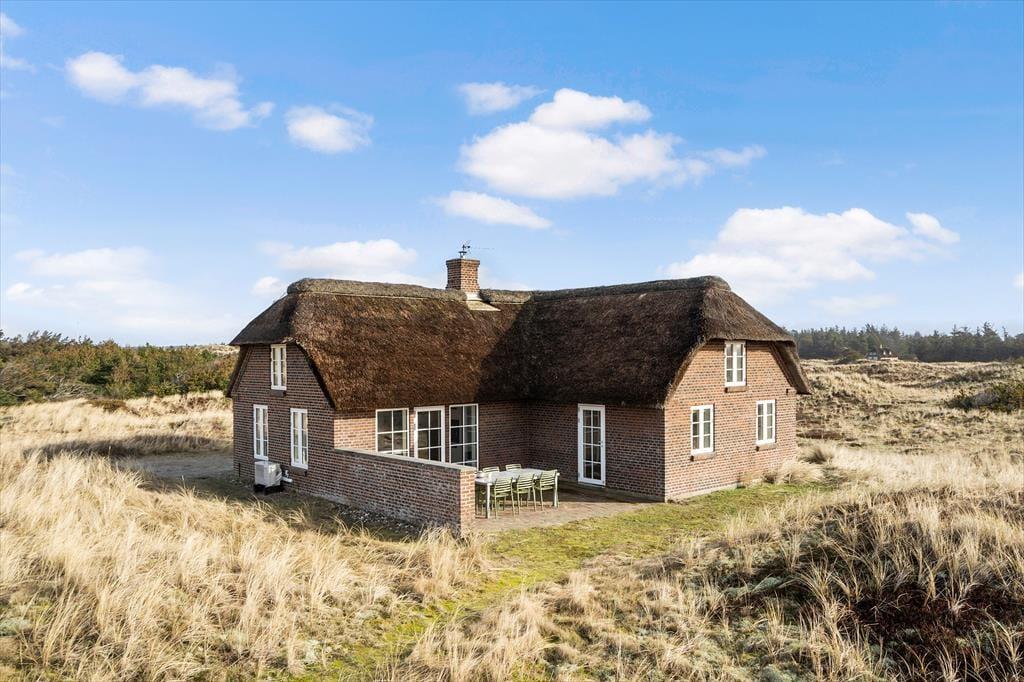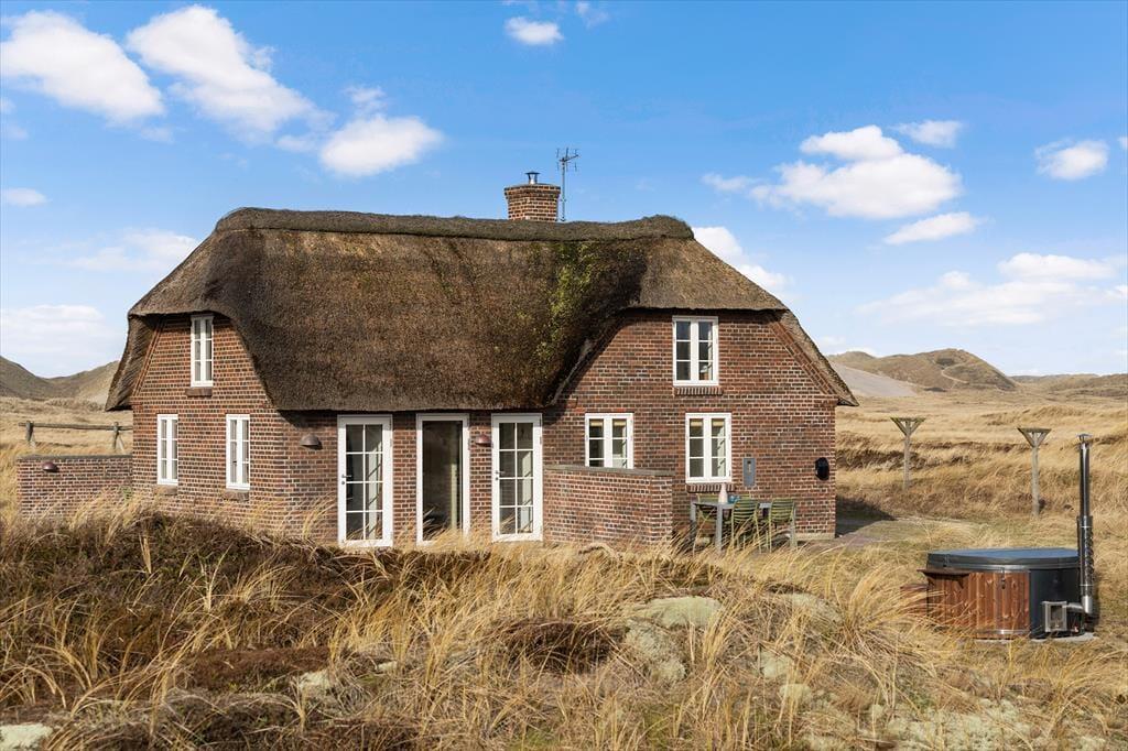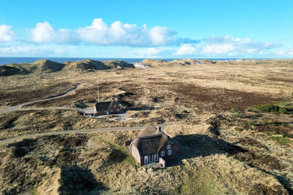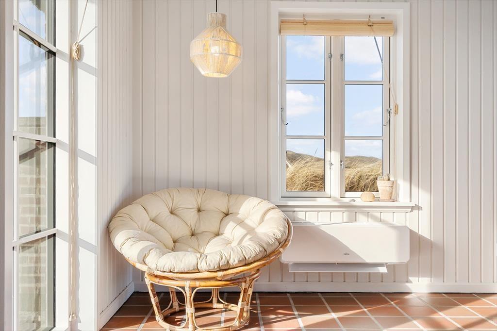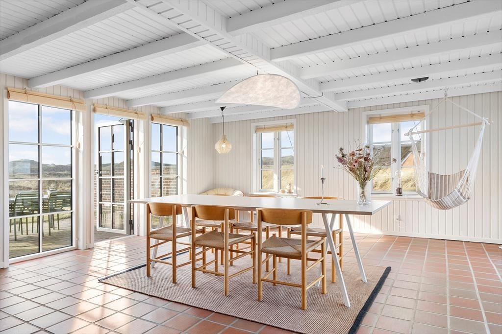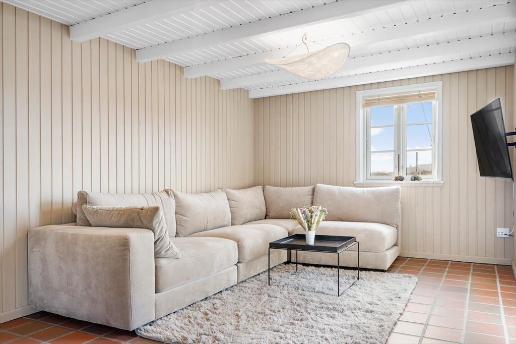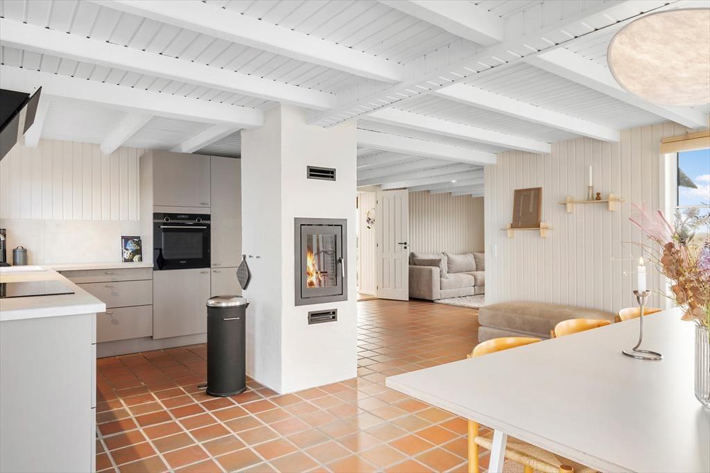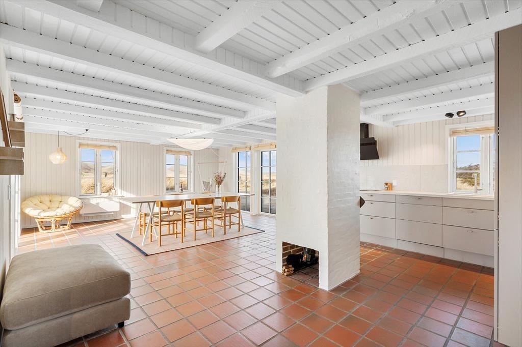 Rødbrune klinker pryder husets gulve og giver en herlig charme til feriehuset, her har I rig mulighed for at trække stikket og nyde hinandens samvær, og med køkkenet i åben forbindelse med spisestuen og stuen har I god mulighed for at være sammen, men lave forskellige ting, sid omkring bordet og tag et slag kort imens der bliver lavet mad i køkkenet. Gennem de store og flotte vinduer kan I virkelig nyde den flotte udsigt ud over klitterne der bugter sig i landskabet. Nyd de sene aftner foran brændeovnen og hør dens hyggelige knitren og dens vidunderlige varme der langsomt fordeler sig i rummet. Når I trænger til total afslapning så hop en tur i den flotte sauna og nyd at blive varmet helt op.