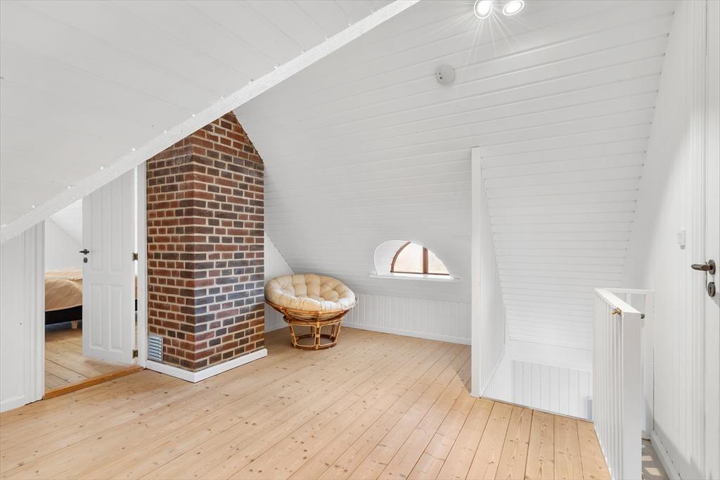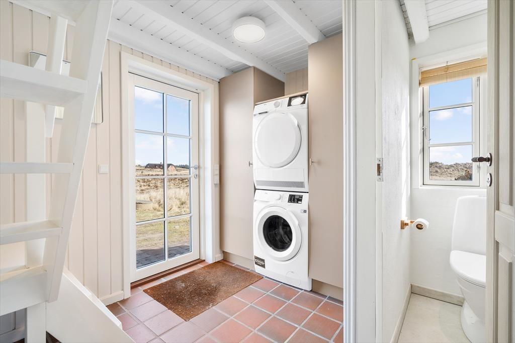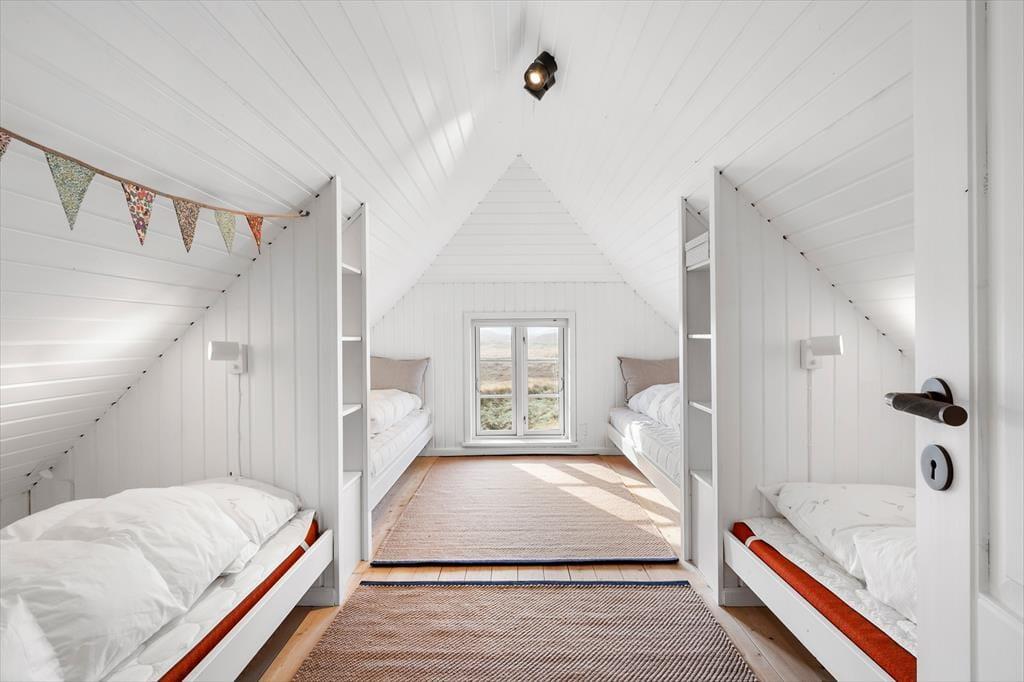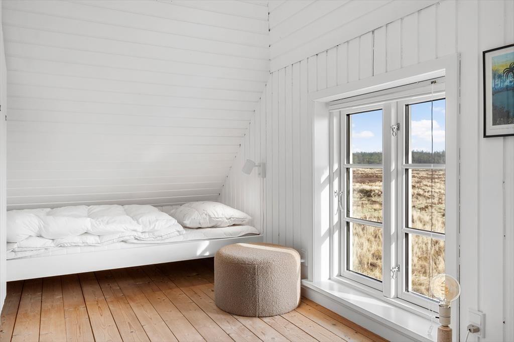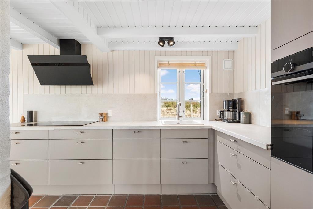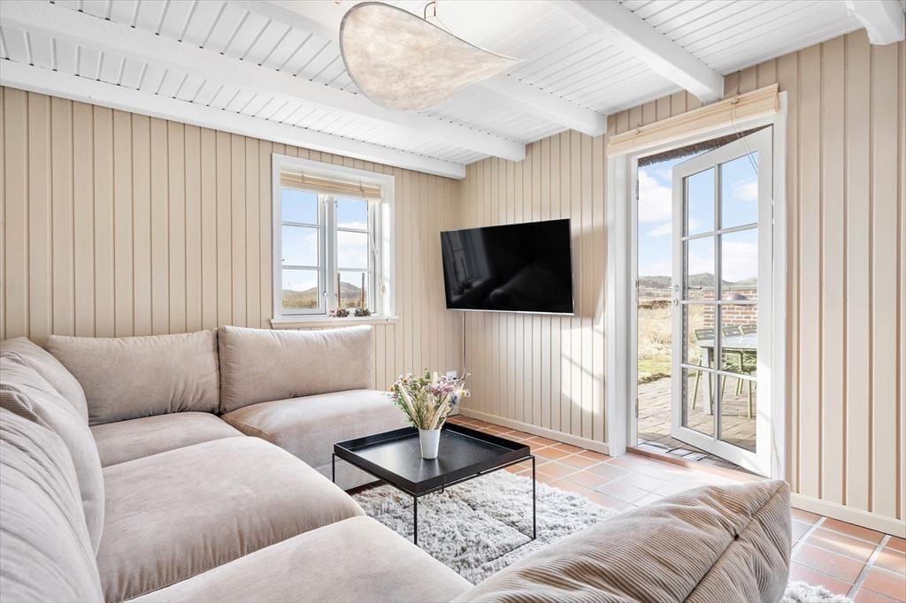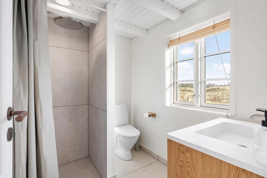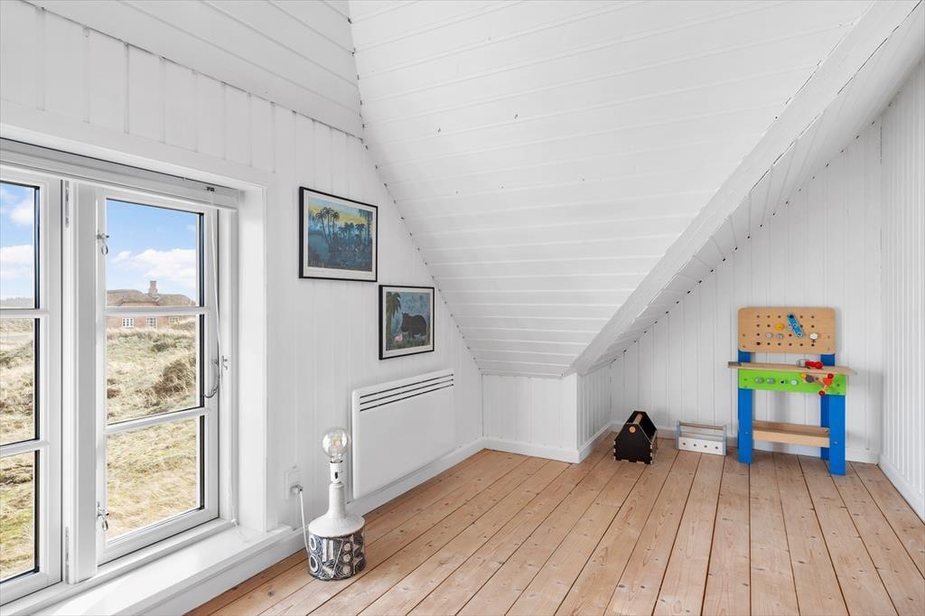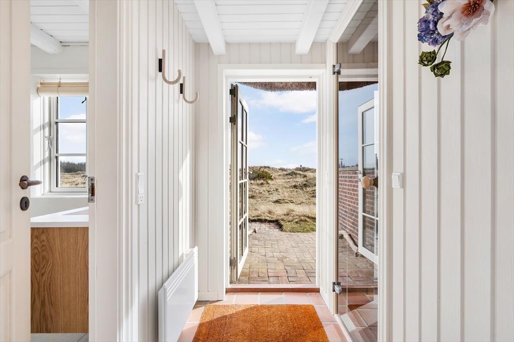 Rødbrune klinker pryder husets gulve og giver en herlig charme til feriehuset, her har I rig mulighed for at trække stikket og nyde hinandens samvær, og med køkkenet i åben forbindelse med spisestuen og stuen har I god mulighed for at være sammen, men lave forskellige ting, sid omkring bordet og tag et slag kort imens der bliver lavet mad i køkkenet. Gennem de store og flotte vinduer kan I virkelig nyde den flotte udsigt ud over klitterne der bugter sig i landskabet. Nyd de sene aftner foran brændeovnen og hør dens hyggelige knitren og dens vidunderlige varme der langsomt fordeler sig i rummet. Når I trænger til total afslapning så hop en tur i den flotte sauna og nyd at blive varmet helt op.