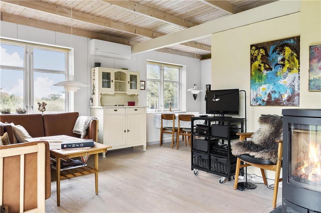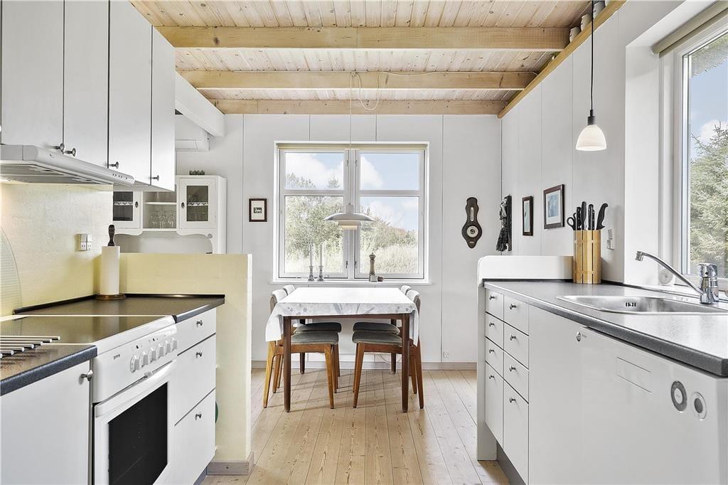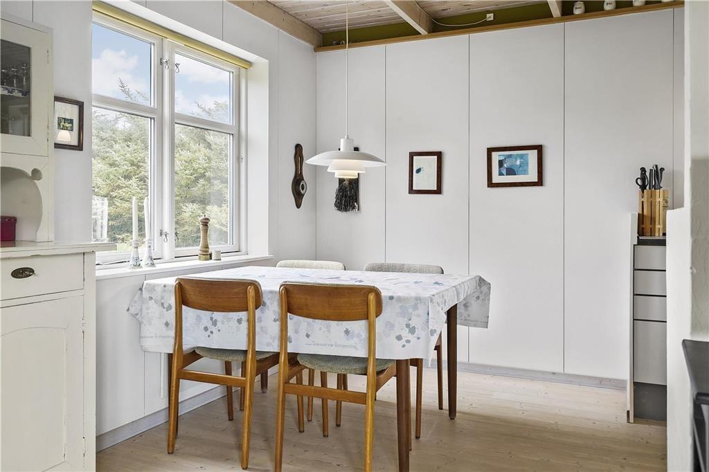 Giv jer i kast med at lave et lækkert måltid for hele familien i det smukke og veludstyrede køkken, her er der god plads til at hele familien kan være med i madlavningen, eller at I kan være sammen på trods af at I laver forskellige ting. Nyd jeres lækre aftensmad rundt om det charmerende spisebord foran det store vindue med det lækre og smukke lysindfald og ikke at forglemme den betagende udsigt udover den flotte natur. Når I er trætte efter aftensmaden så smid jer foran den hyggelige brændeovn og nyd dens hyggelige knitren og varmen der langsomt spreder sig rundt i rummet.