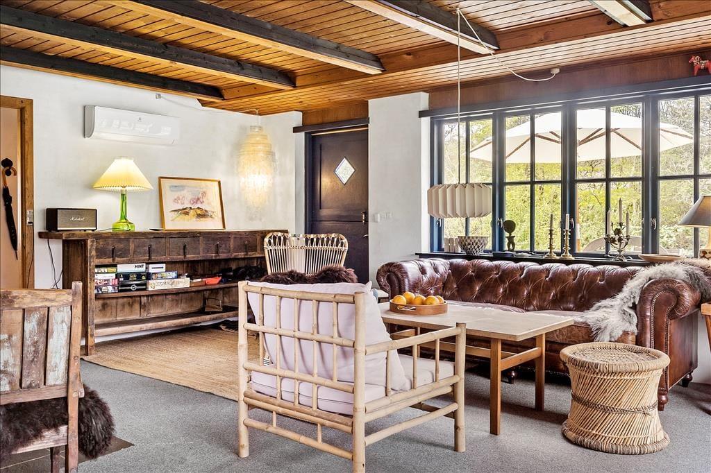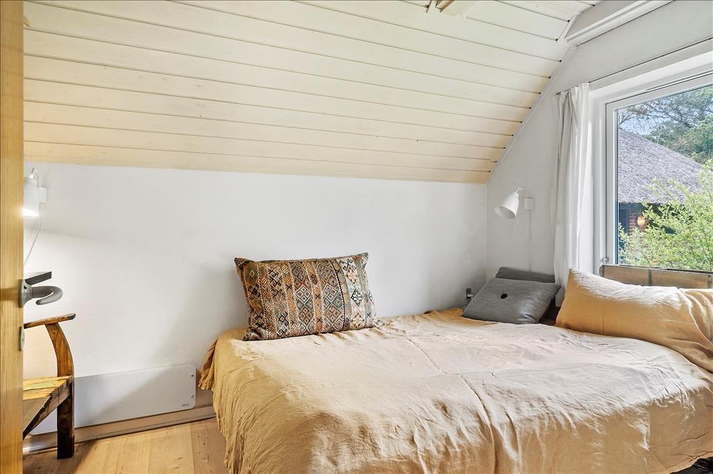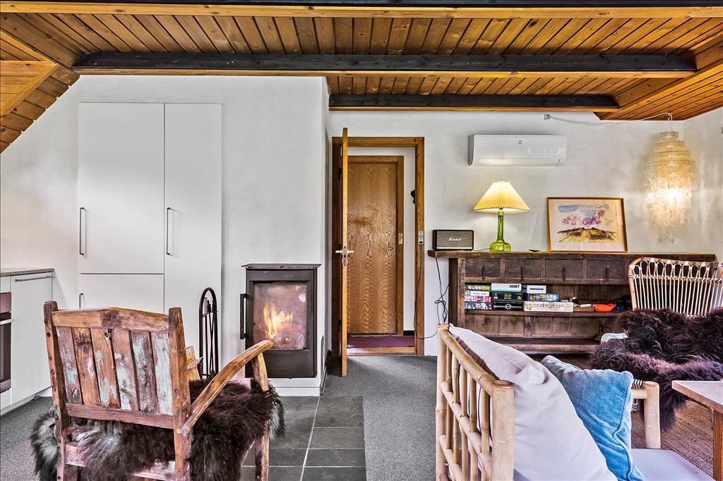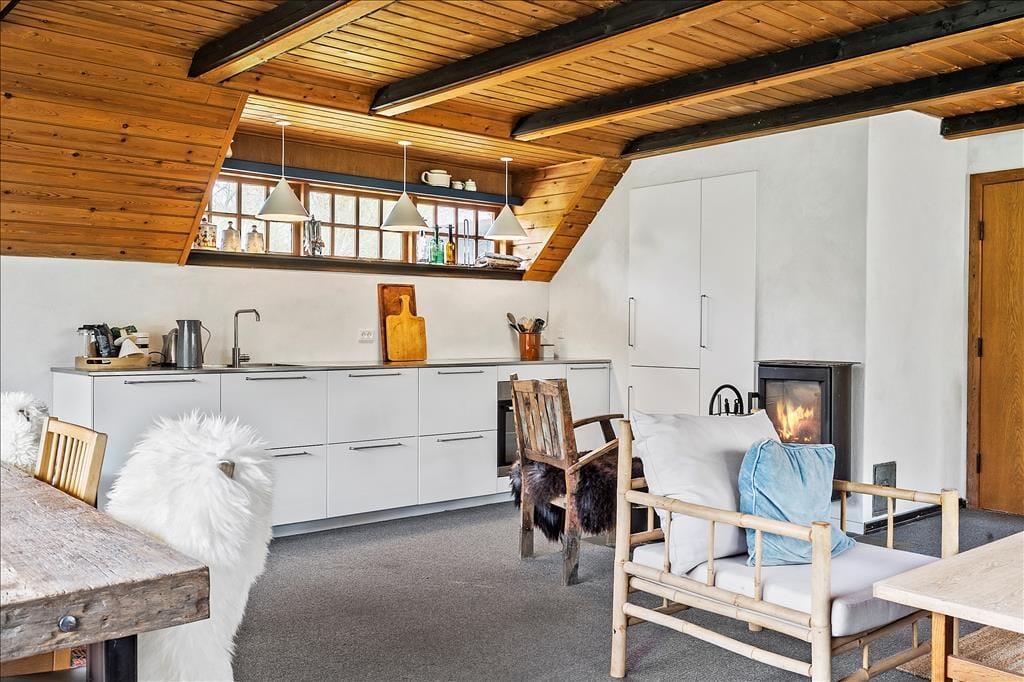 Store vinduer lyser det flotte køkkenalrum op, her kan I sidde og nyde solens stråler der strømmer ind gennem vinduerne samtidig med at I laver mad ved det flotte køkken eller spiller kort rundt om det rustikke spisebord, her kan I nyde tiden sammen, også med jeres firbenede venner, selvom I laver forskellige ting. Trænger I en aften til lidt ekstra varme eller hygge så tænd op for den charmerende brændeovn og lad dens lune sprede sig i hele rummet, imens I lytter til dens hyggelige knitren.