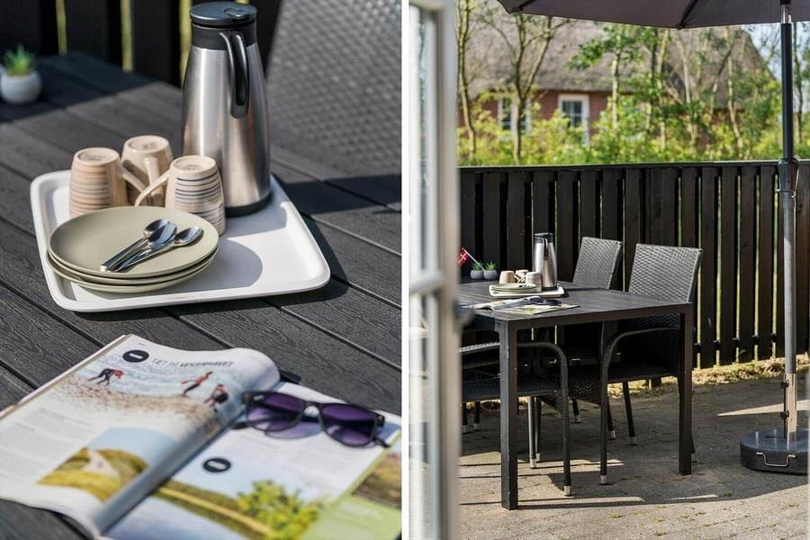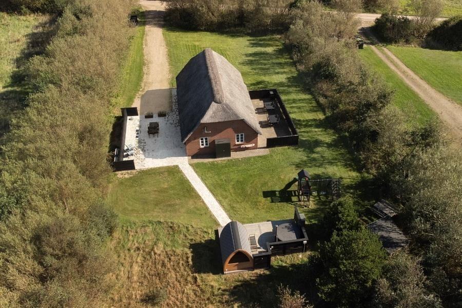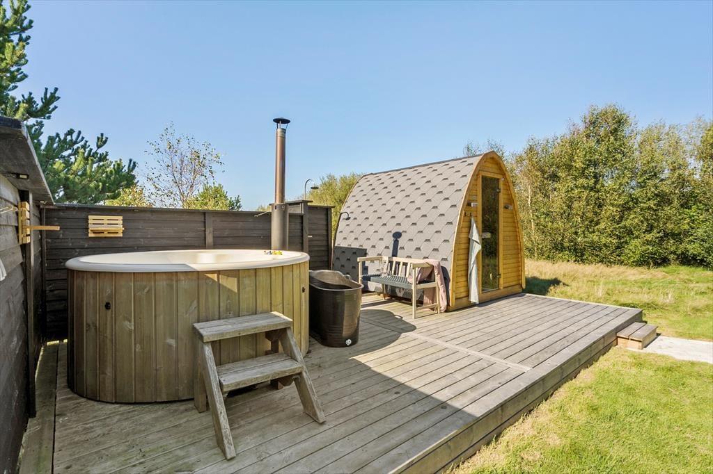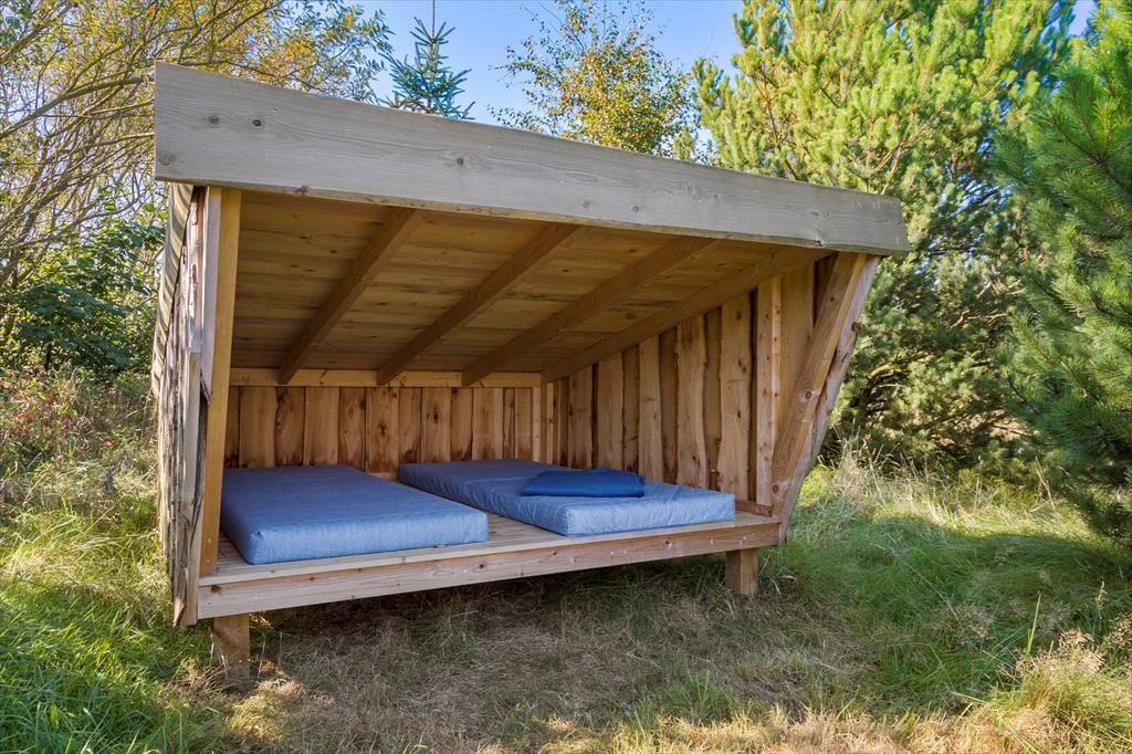 Langs hele den store grund er der tilplantet med buske og træer, så her får I en fantastisk læ. En del af den store grund er lavet til græsplæne og resten som naturgrund. Tag morgenkaffen i hånden og sæt jer ud på den store sydvendte terrasse, fra terrassen kan I både se solopgangen og solnedgangen, begge et helt fortryllende syn. De fantastiske udeområder indbyder til mange timer udendørs, for med både shelter, bål sted og legeplads er der mange muligheder for at nyde det udendørs liv, og ikke at forglemme den smukke terrasse hvor der både er et lækkert vildmarksbad, udebruser og en fantastisk udesauna, dette områder kalder bare på lange sommeraftner i vildmarksbadet og et glas bobler inden turen går ind i saunaen.