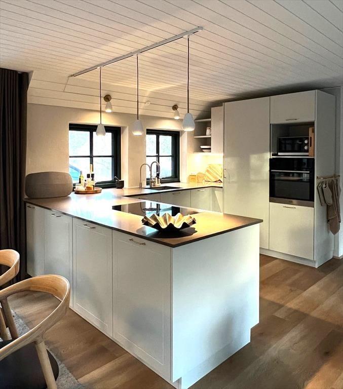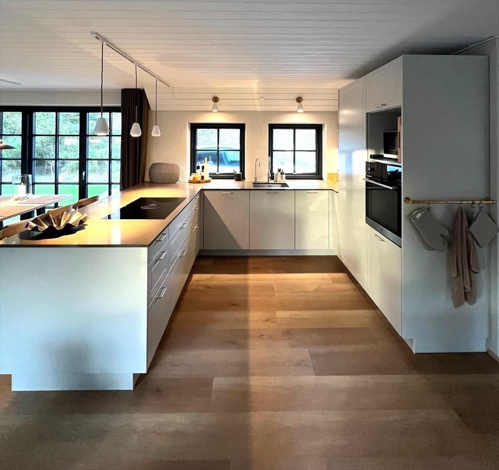 Det store fællesområde er et samlingspunkt i hjertet af huset, og rummer en gennemgribende kærlighed for detaljerne. Hele familien kan samles om pejsen, køkken-øen og flere kroge med kvalitetsmøbler på samme tid.