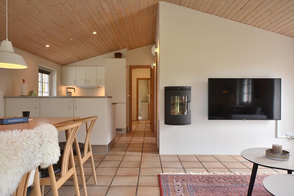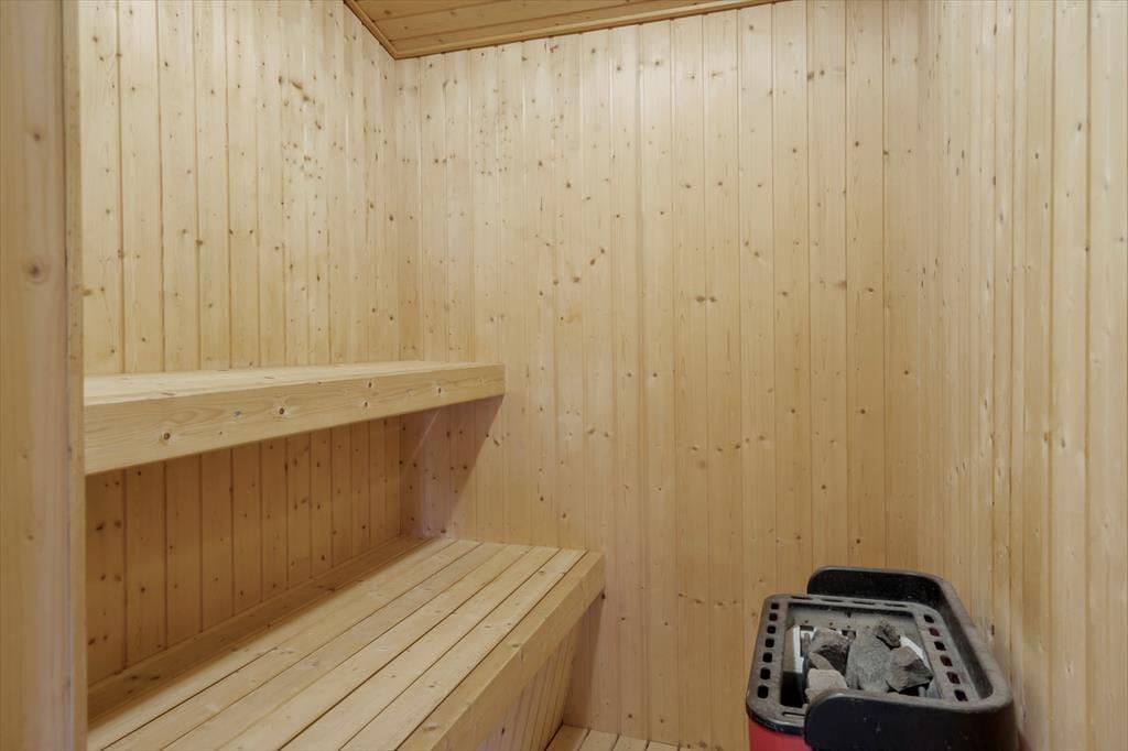Det skønne køkken der ligger i åben forbindelse med den hyggelige opholds- og spisestue ligger op til timevis af samvær med familien, her kan I nyde hinanden selskab om det så er med et spil kort omkring det flotte spisebord, madlavning i køkkenet eller en afslappende stund foran brændeovnen i det behagelige sofaarrangement, eller måske endda det hele på en gang, mulighederne er mange. Når I trænger til at koble helt fra og bare nyde tilværelse så tænd op for det lækre spabad og nyd en afslappende stund, og derefter kan I tage et smut i den behagelige varme sauna.