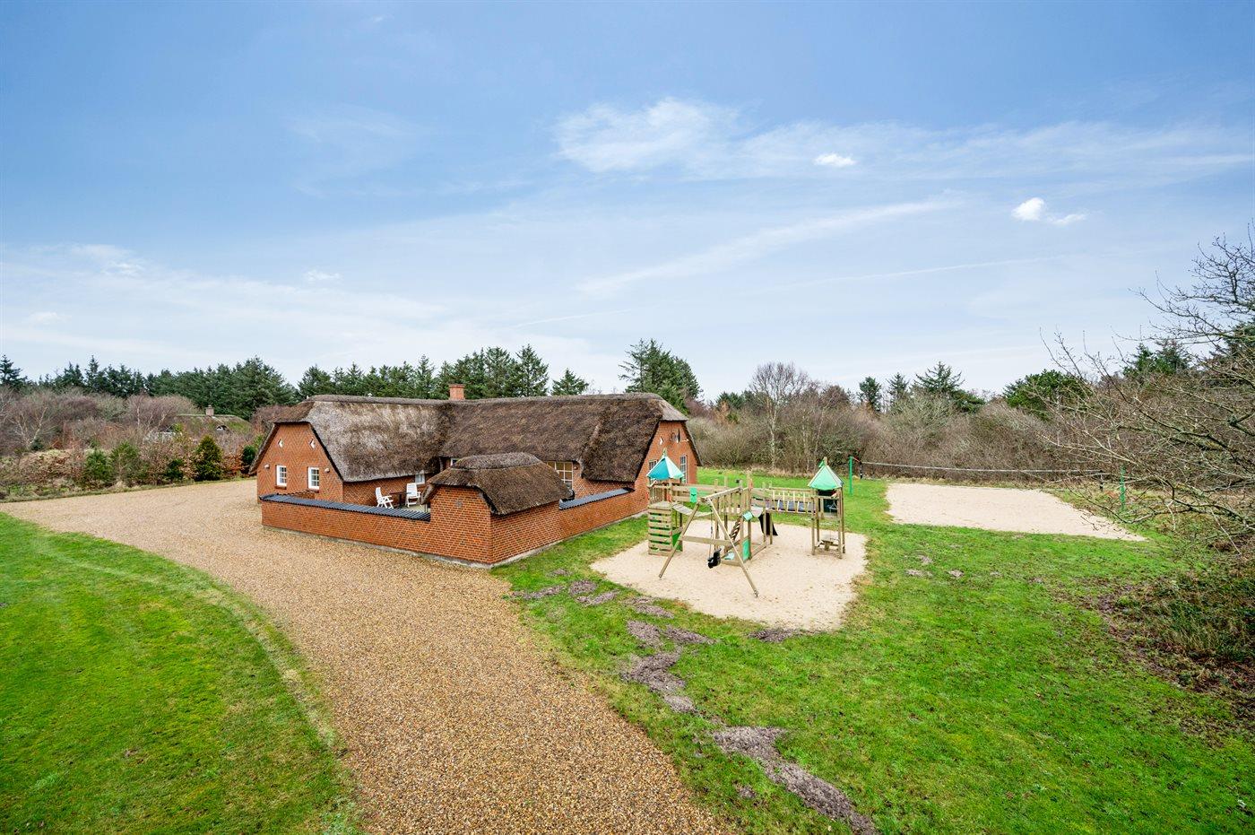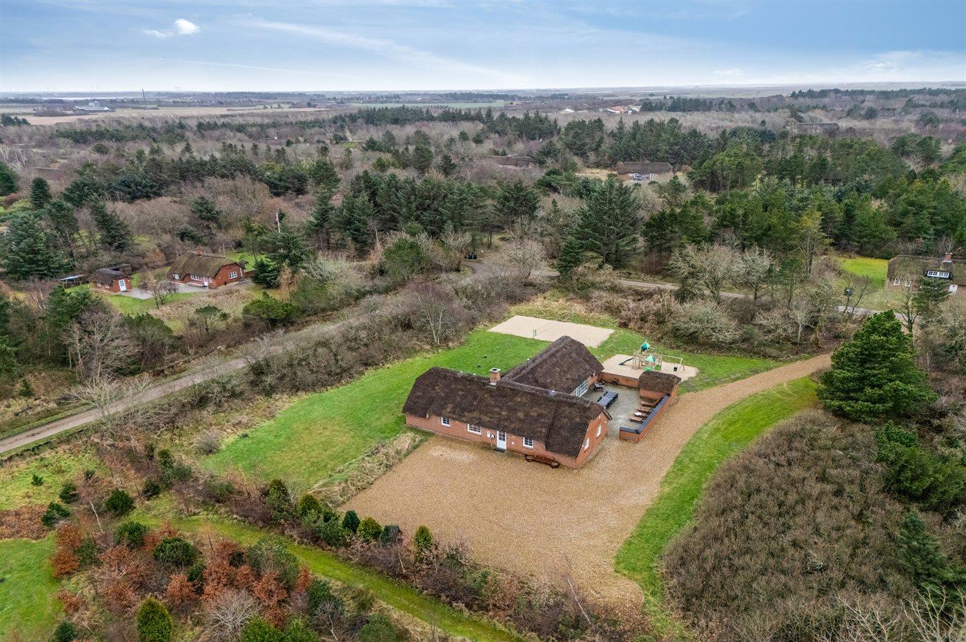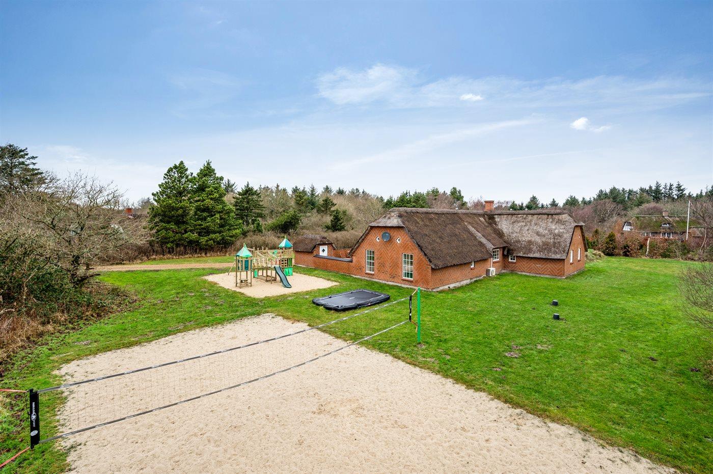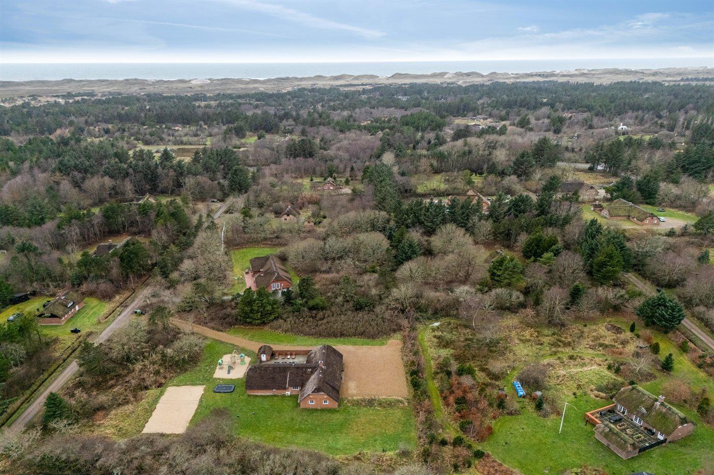 Ferieboligen er beliggende på en 5018 m² stor naturgrund. Der er 1700 m til havet. Nærmeste forretning er beliggende i en afstand af 500 m. Til ferieboligen hører åbent terrasseareal. Gynge. Sandkasse. Trampolin. Legetårn. Rutchebane. Beachvolley. Der er installeret stik til opladning af elbil. Med 9 kW ladeeffekt. Parkering ved ferieboligen.